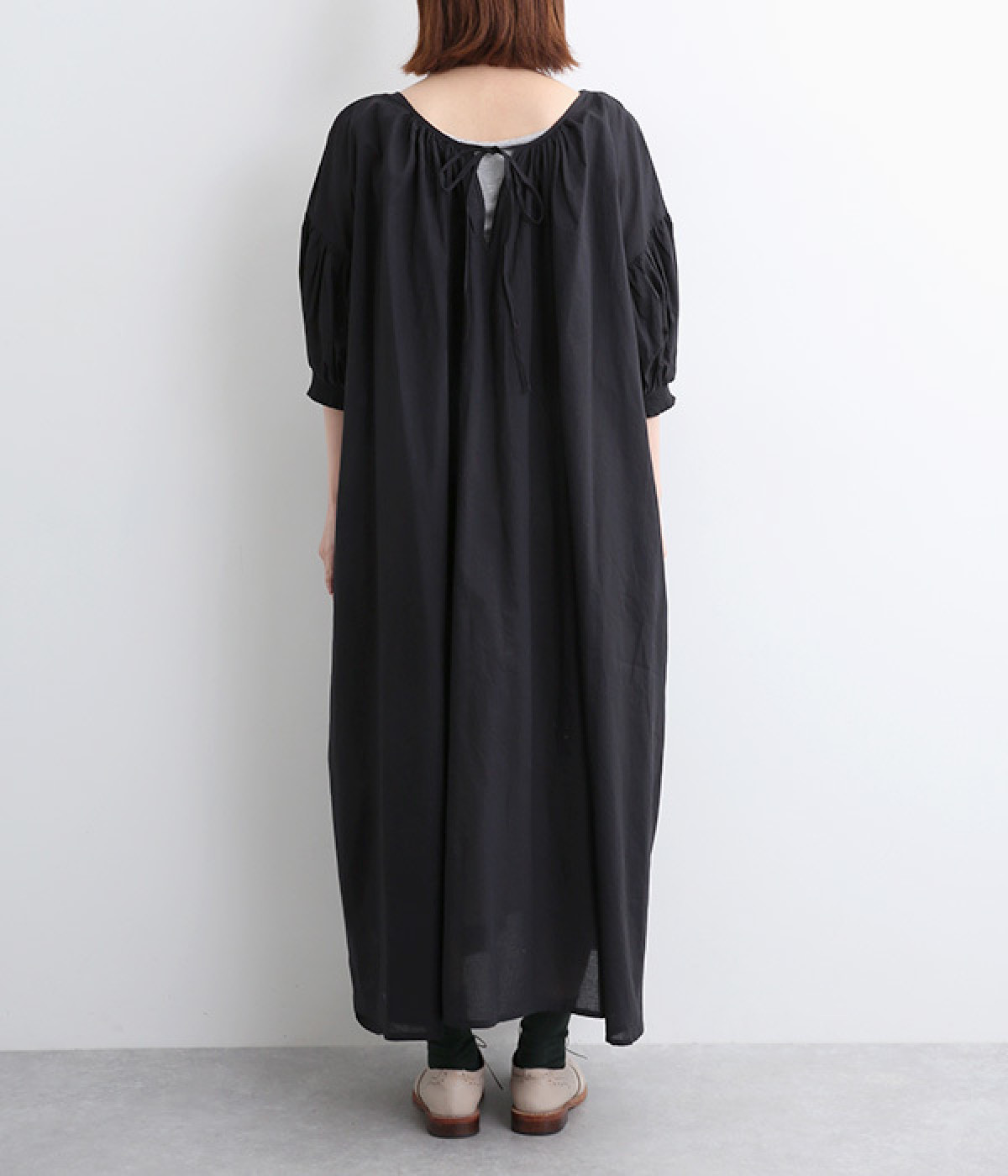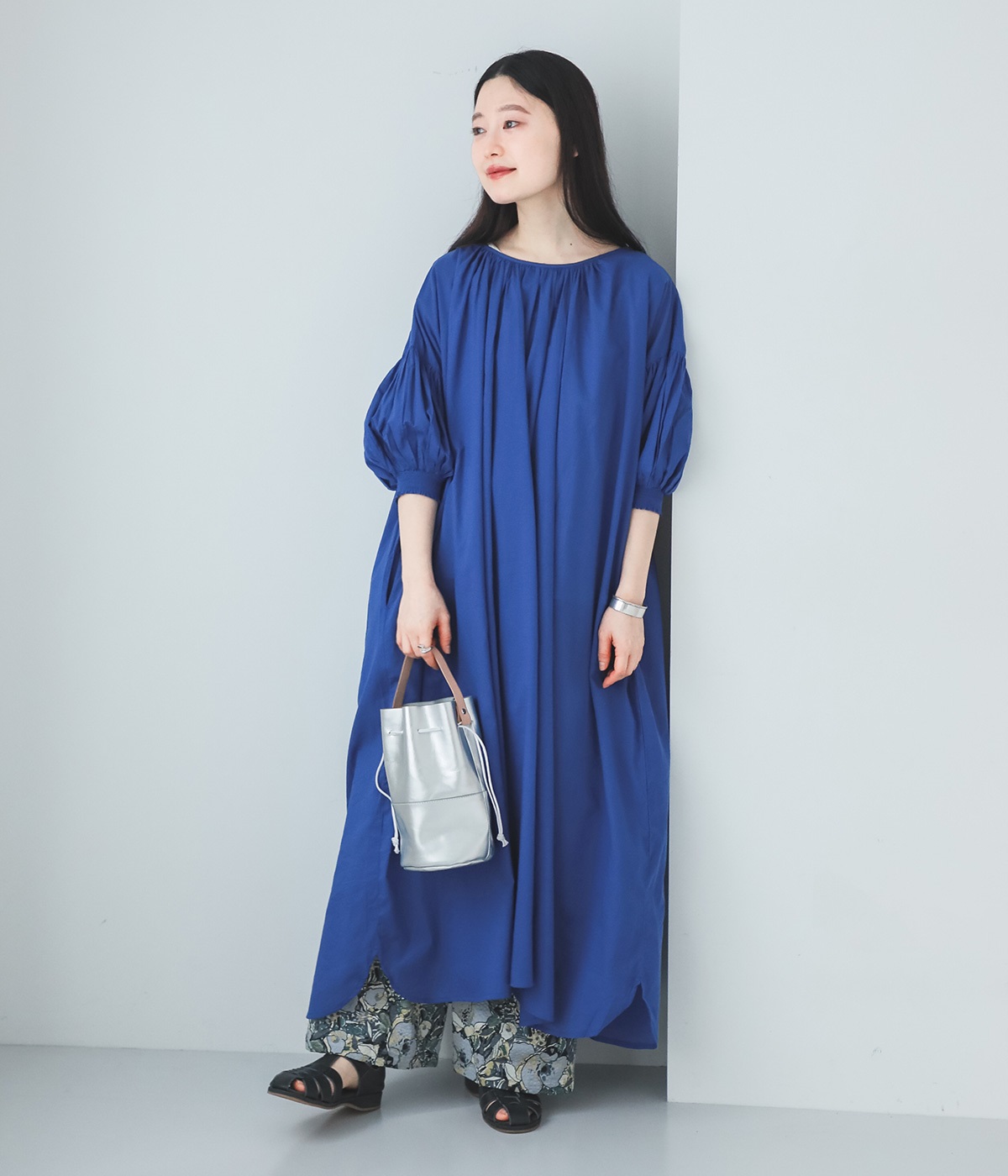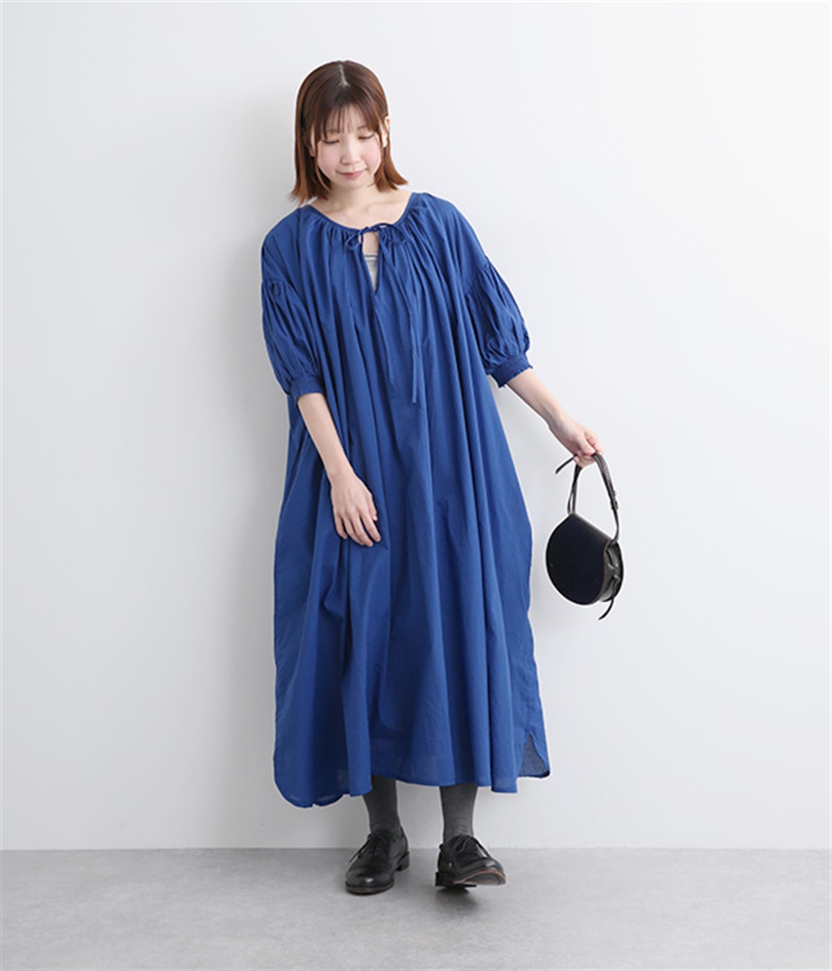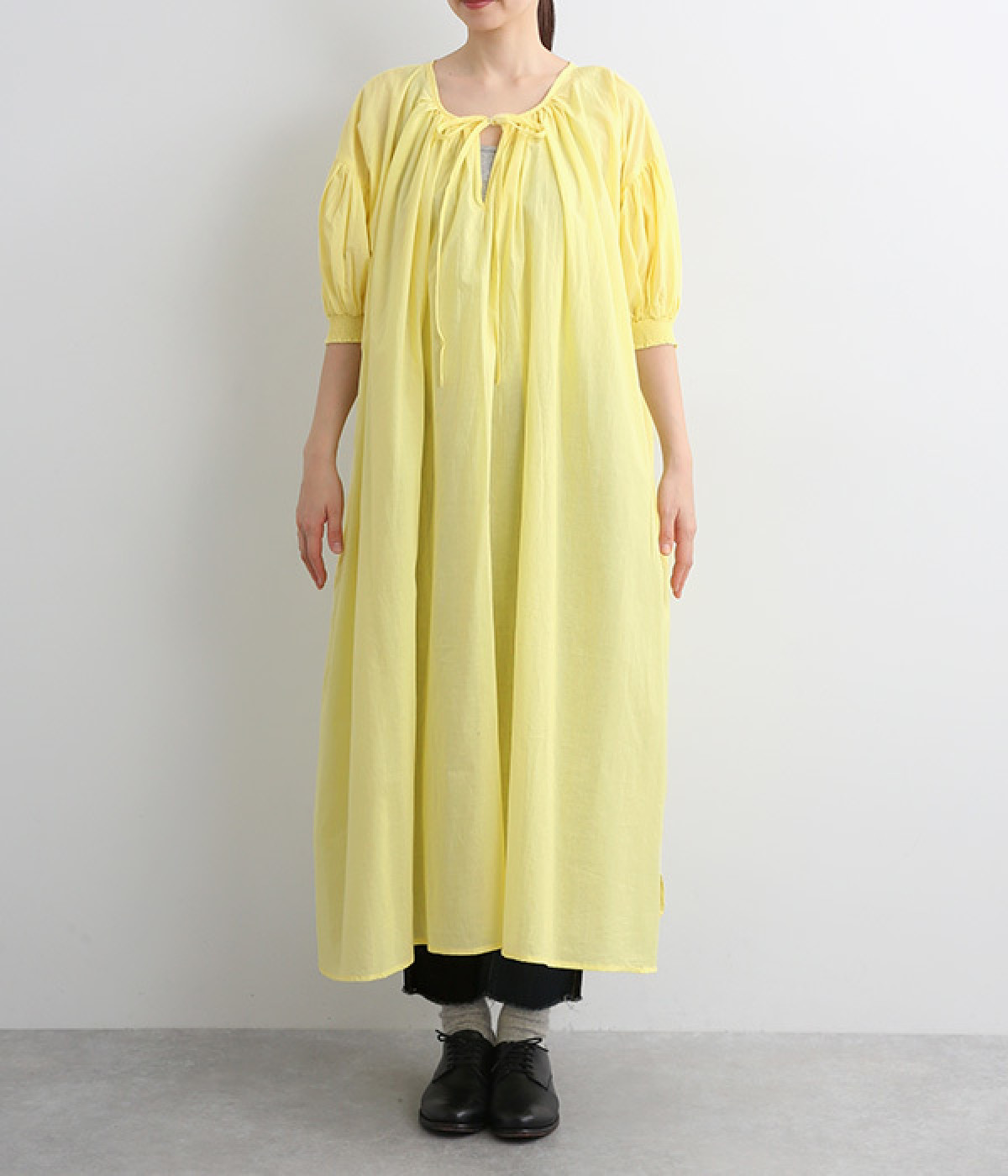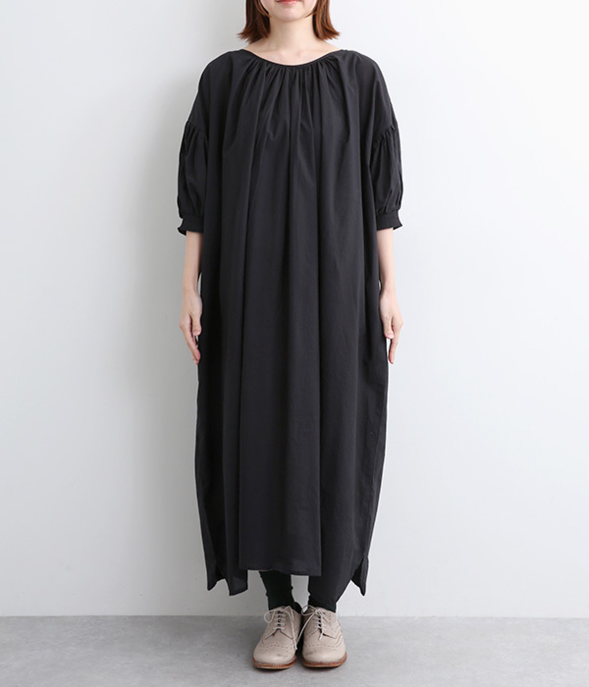 袖と首まわりに贅沢にギャザーをあしらったワンピースです。たっぷりと空気をはらみ、やわらかなボリューム感を表現。前後どちらでも着られる2way仕様で、コーディネートの幅も広がります。袖口のシャーリングもアクセントに。