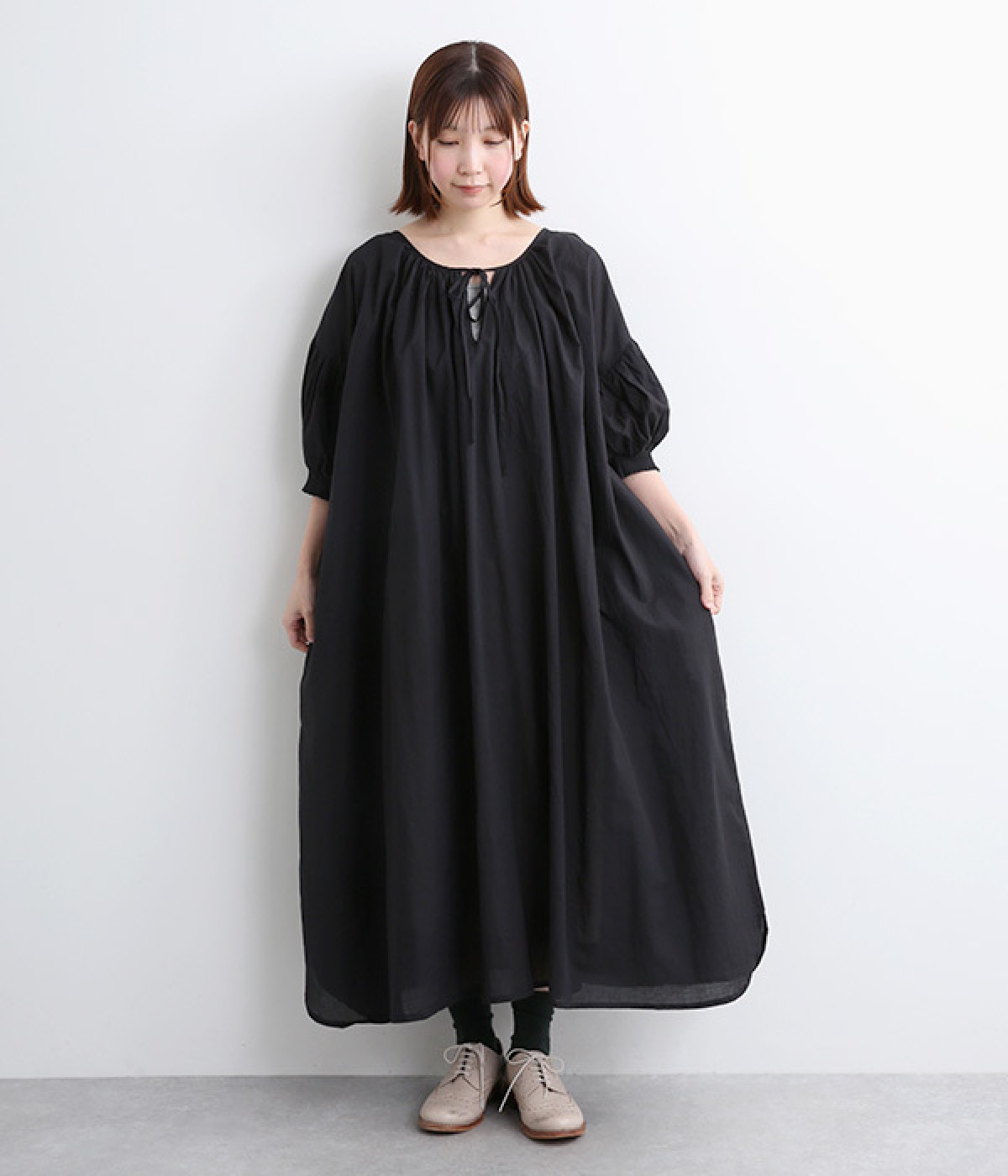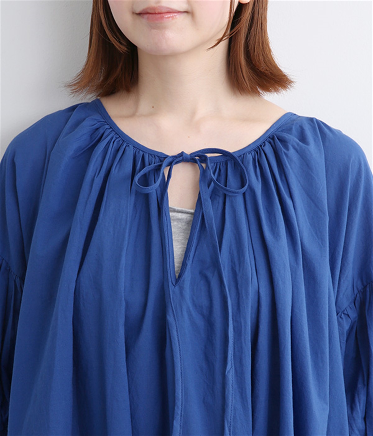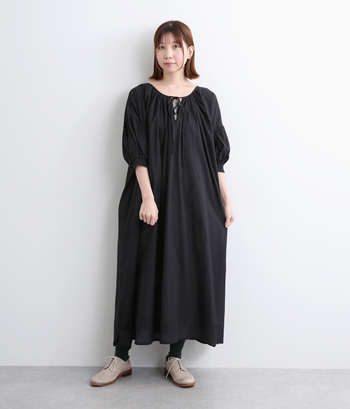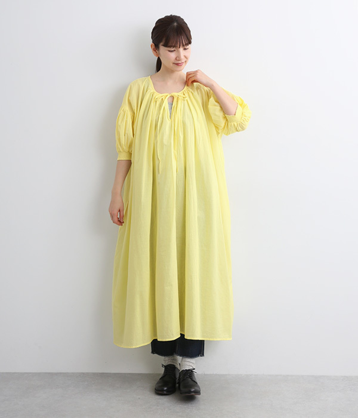 袖と首まわりに贅沢にギャザーをあしらったワンピースです。たっぷりと空気をはらみ、やわらかなボリューム感を表現。前後どちらでも着られる2way仕様で、コーディネートの幅も広がります。袖口のシャーリングもアクセントに。