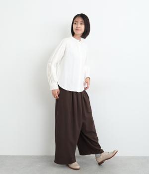 ギャザーでたっぷりとゆとりを持たせたワイドパンツです。無地素材でスタイリングしやすく、ボリュームで存在感を発揮。ウエストは総ゴムに内紐入りのリラックスムードなつくりで、デイリー使いに重宝します。