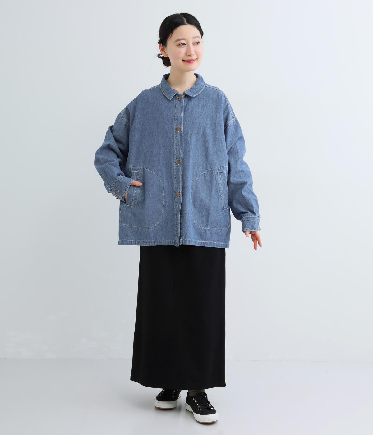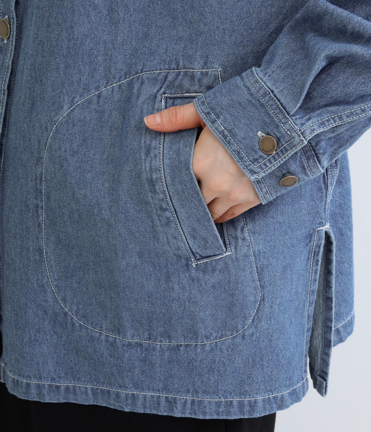 着心地のいいコットンデニムで気負いなく羽織れるジャケットです。サイドスリットを入れたゆったりめのシルエットで、厚手のインナーとも重ねやすく仕立てました。ポケットにあしらったまあるいステッチワークがかわいらしさを添えています。