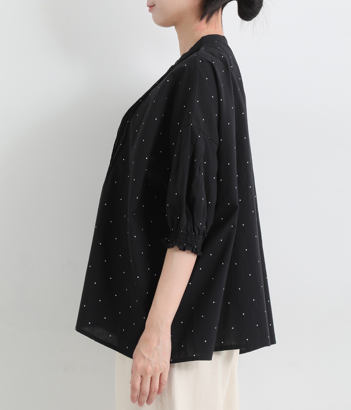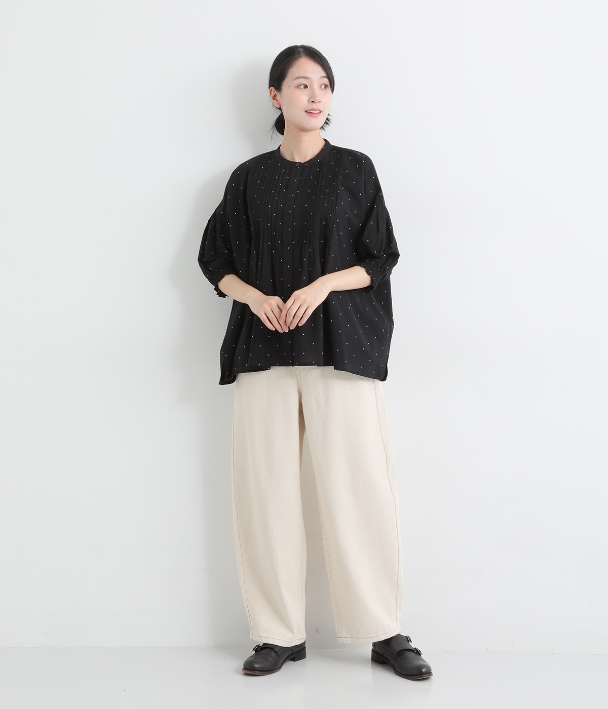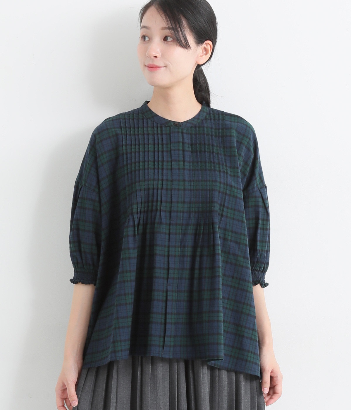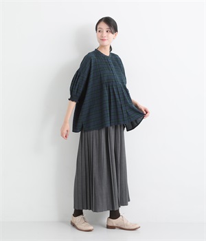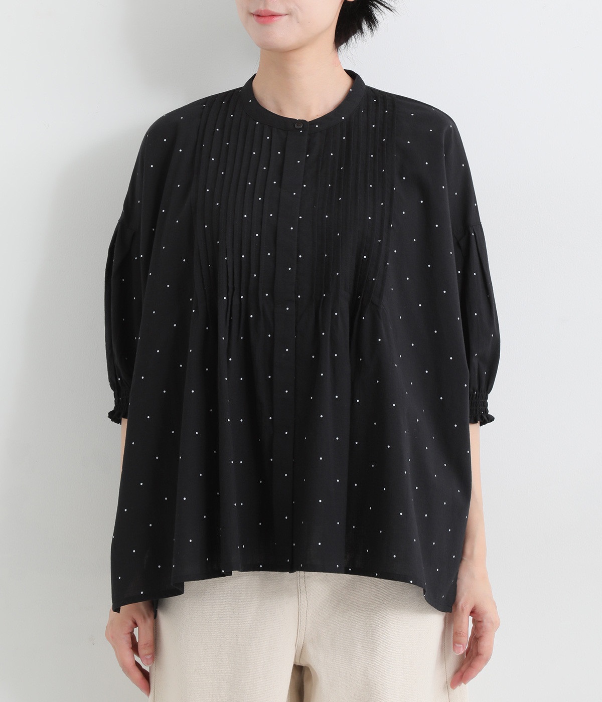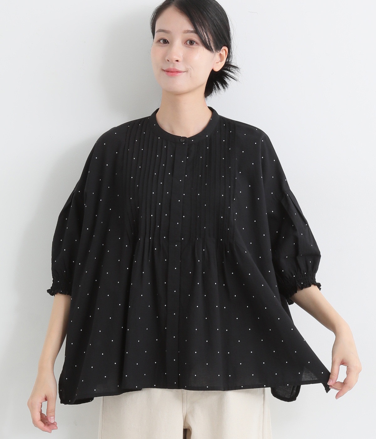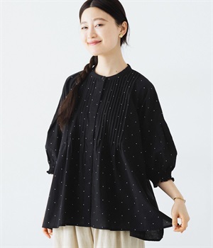 胸元に施した繊細なピンタックが映えるブラウス。シンプルながらも上品な雰囲気で、日常使いにも取り入れやすい一枚です。
