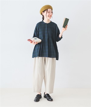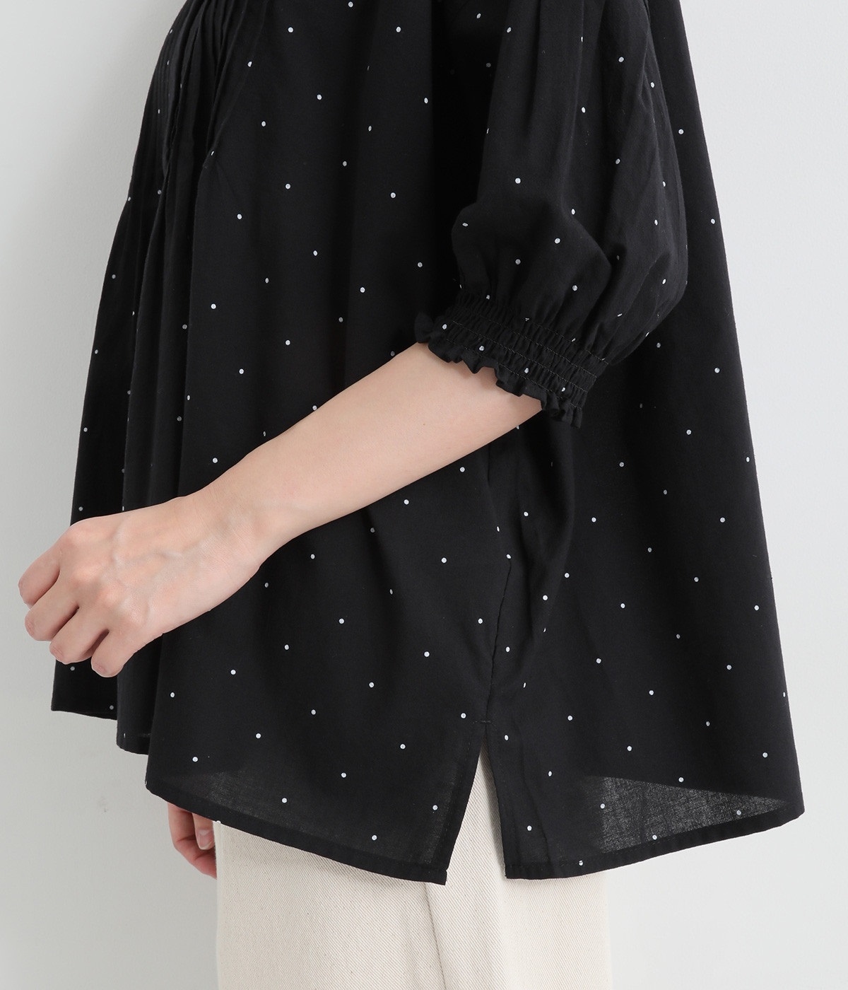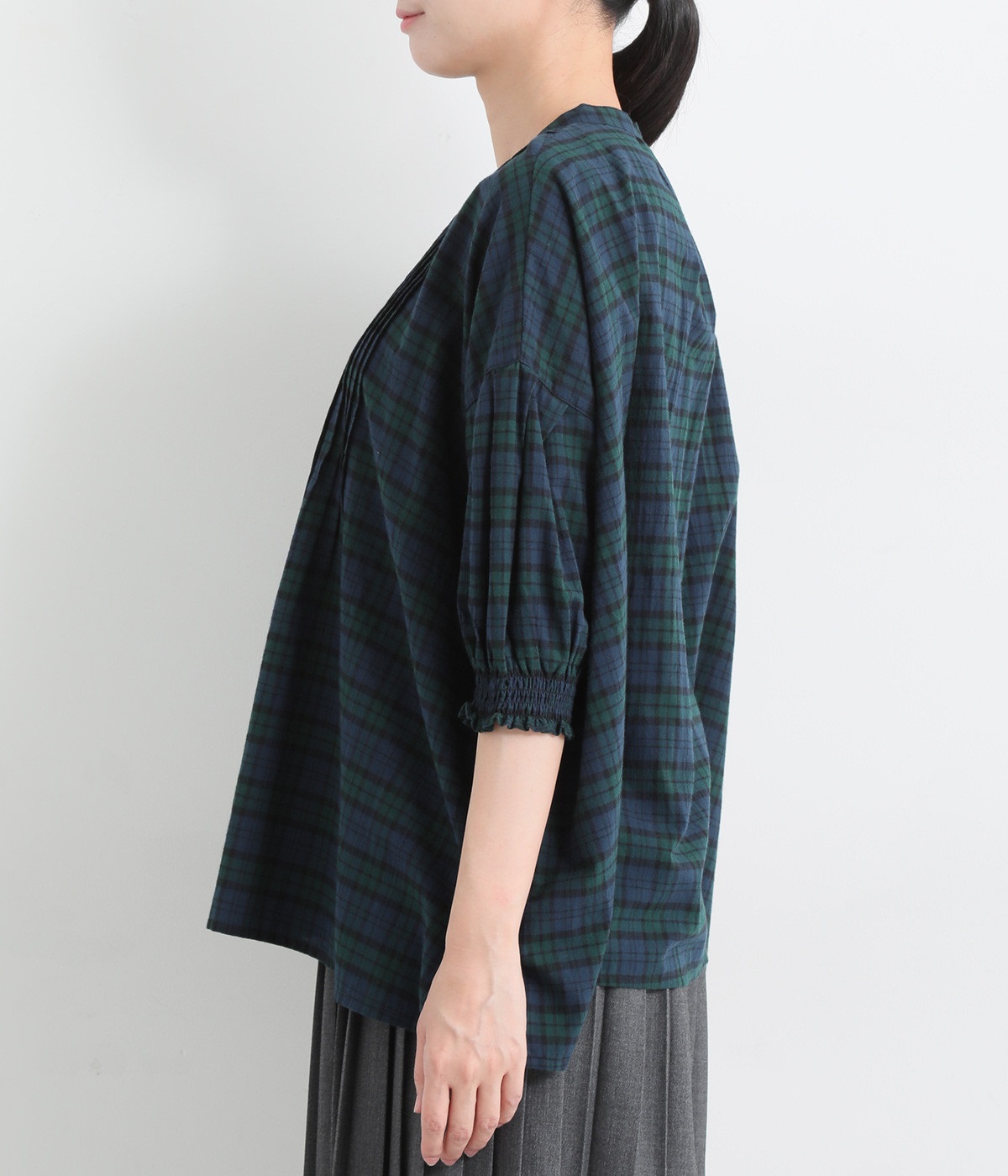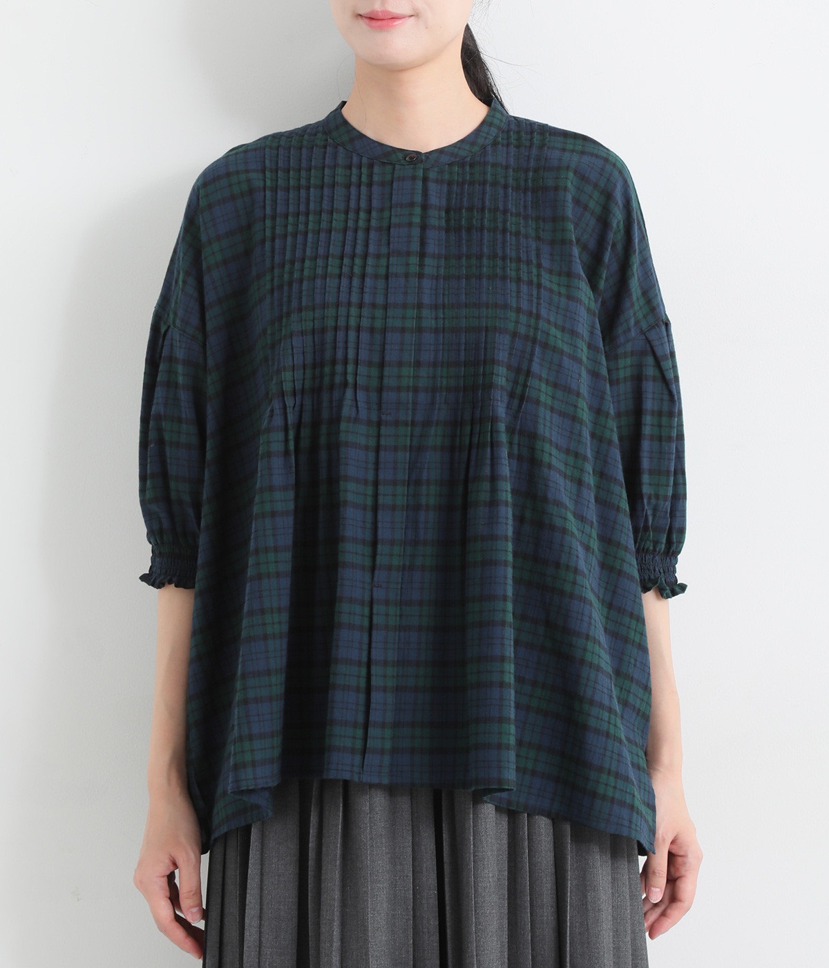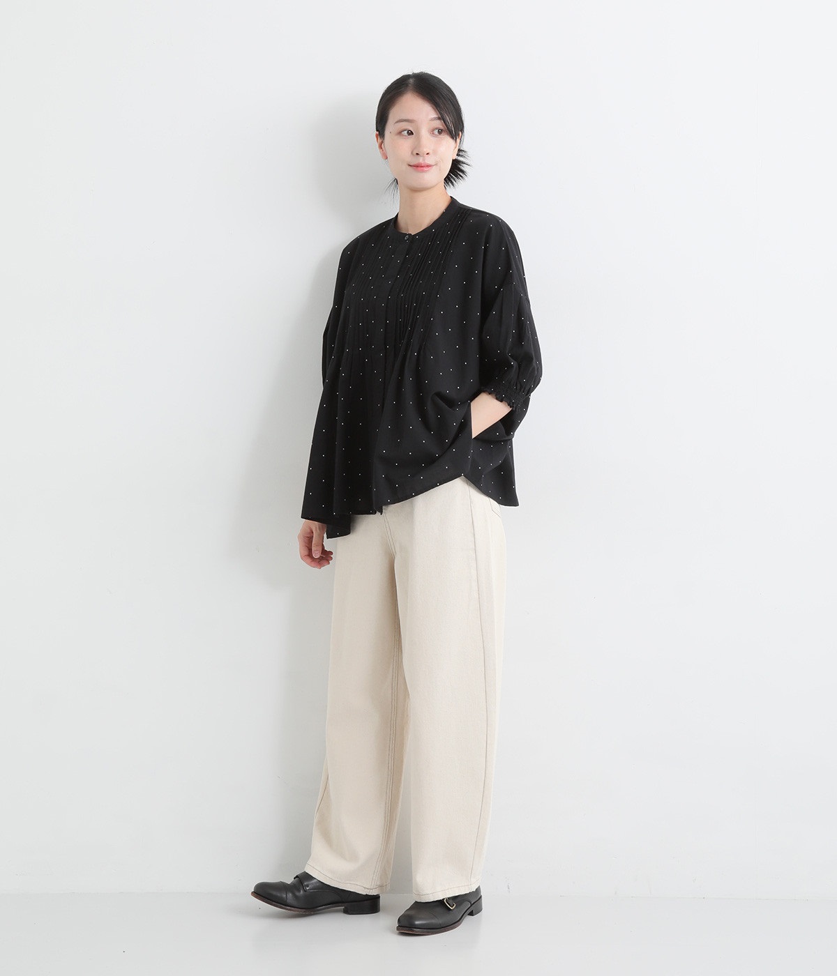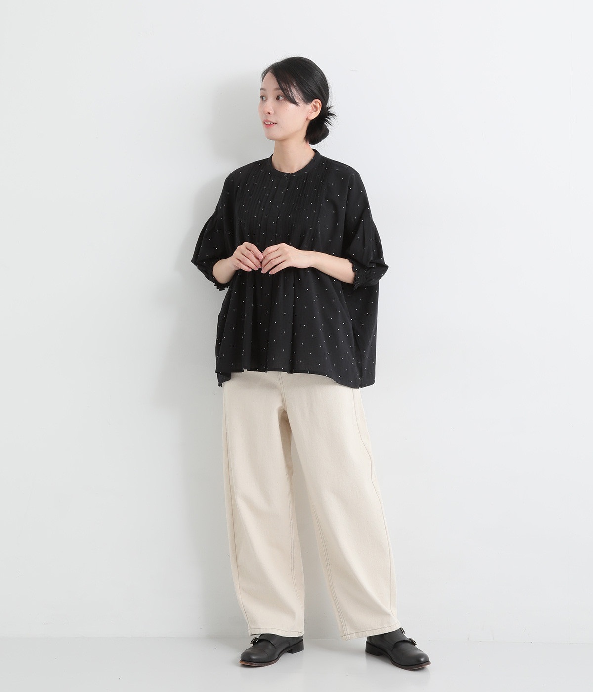 胸元に施した繊細なピンタックが映えるブラウス。シンプルながらも上品な雰囲気で、日常使いにも取り入れやすい一枚です。