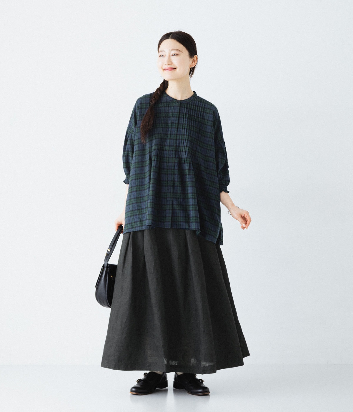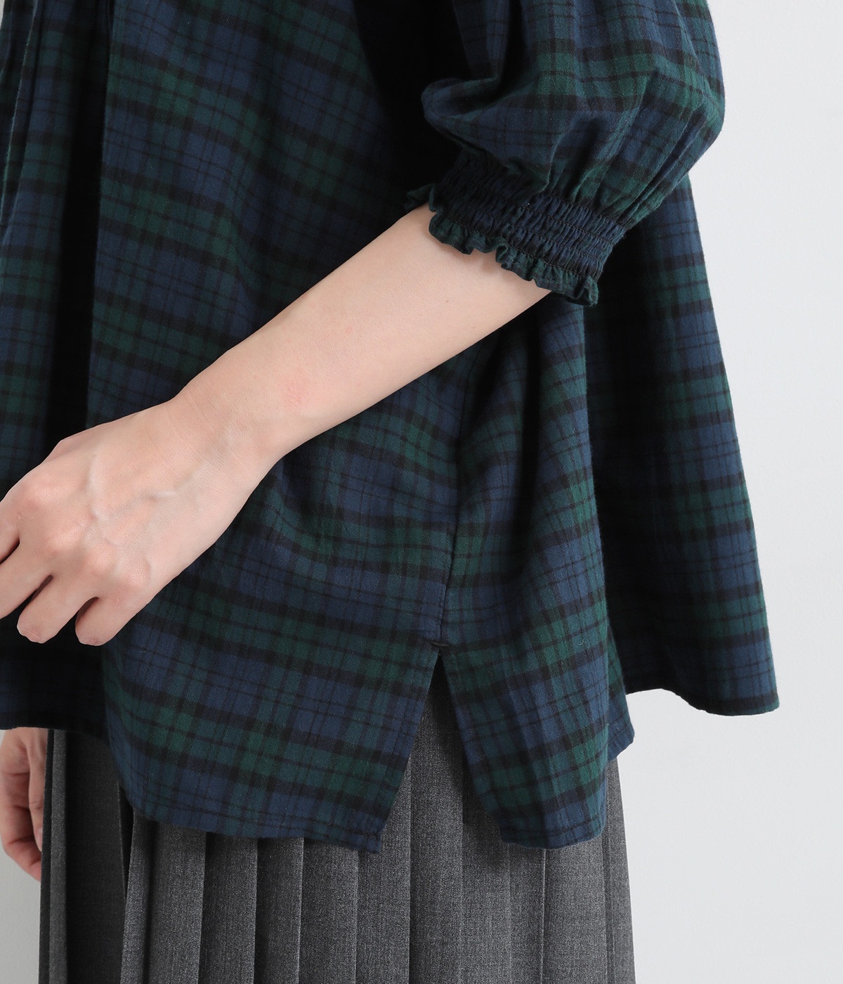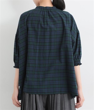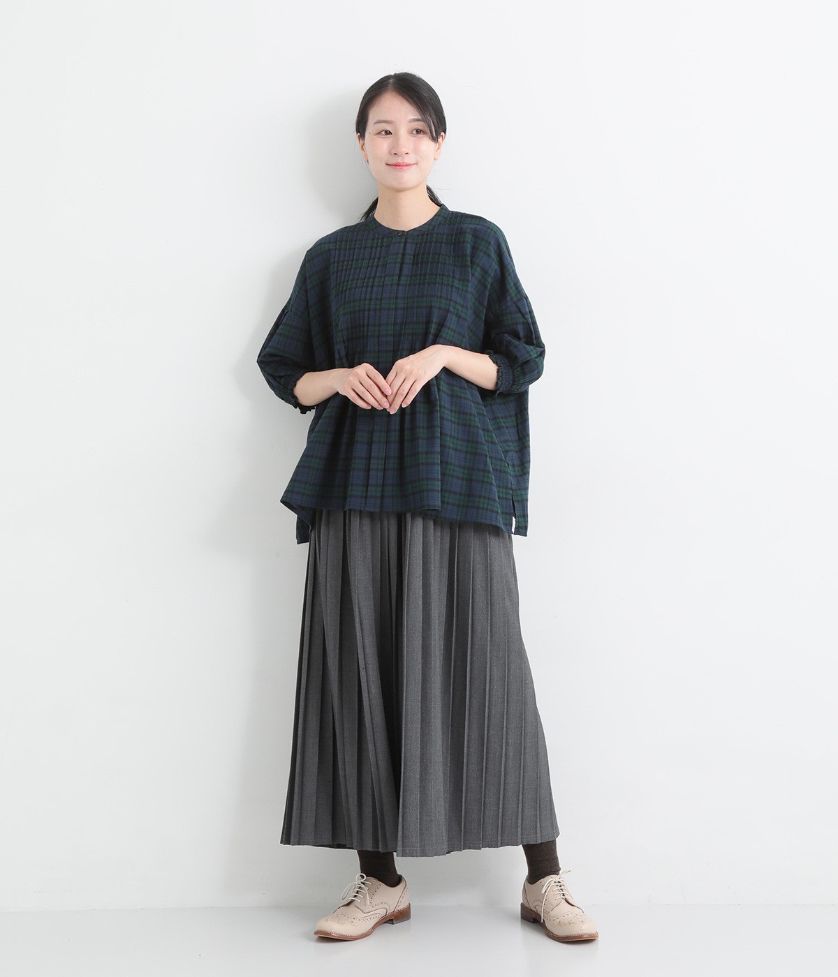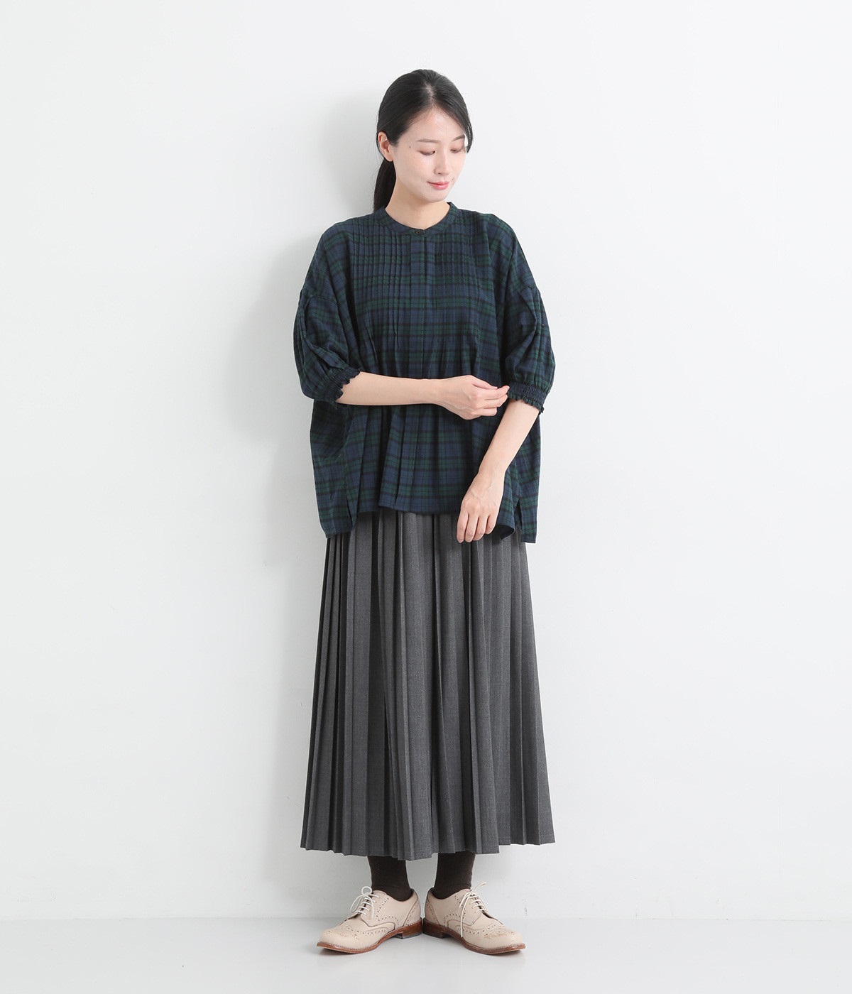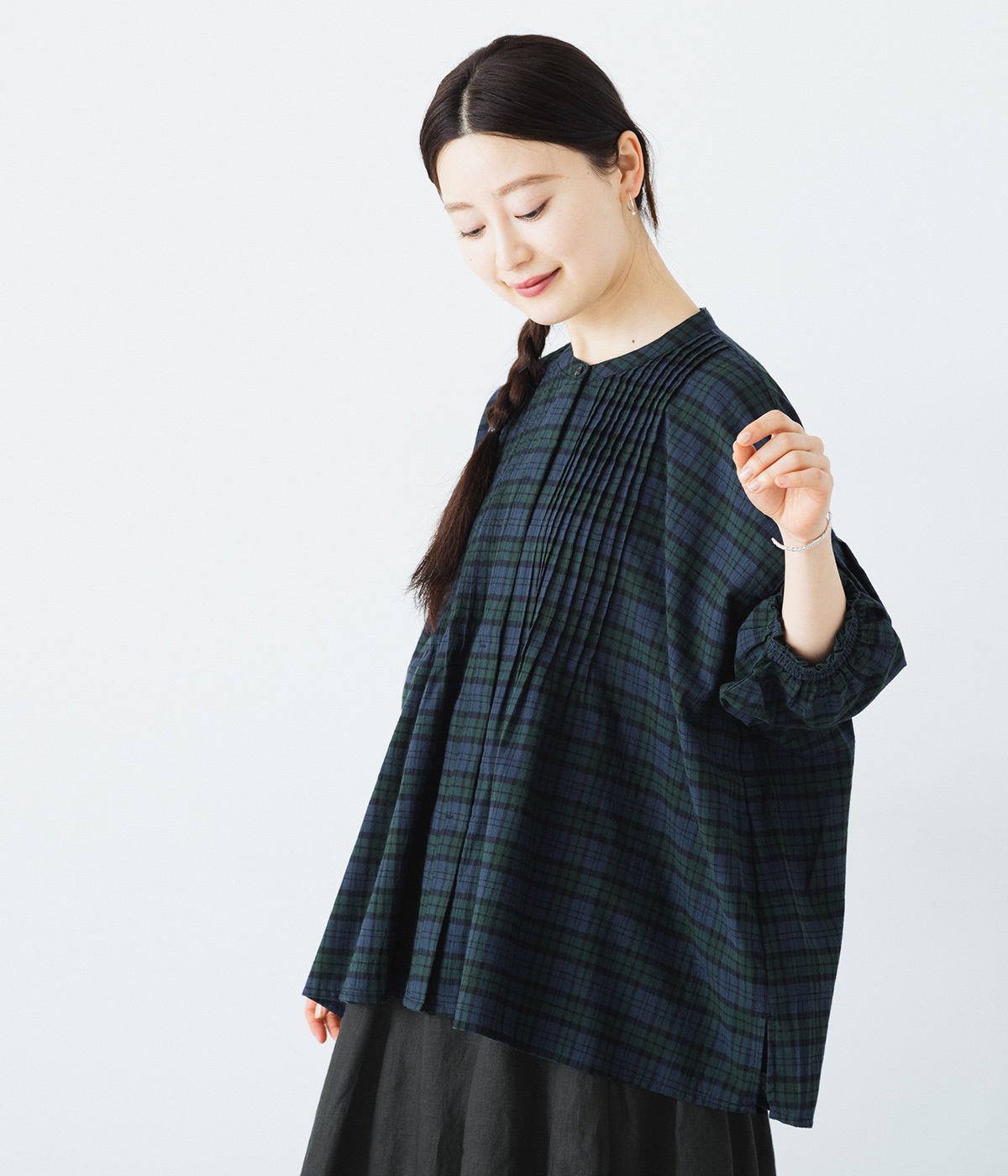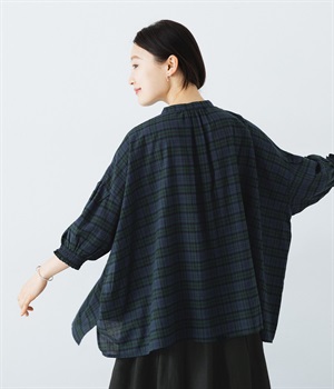 胸元に施した繊細なピンタックが映えるブラウス。シンプルながらも上品な雰囲気で、日常使いにも取り入れやすい一枚です。