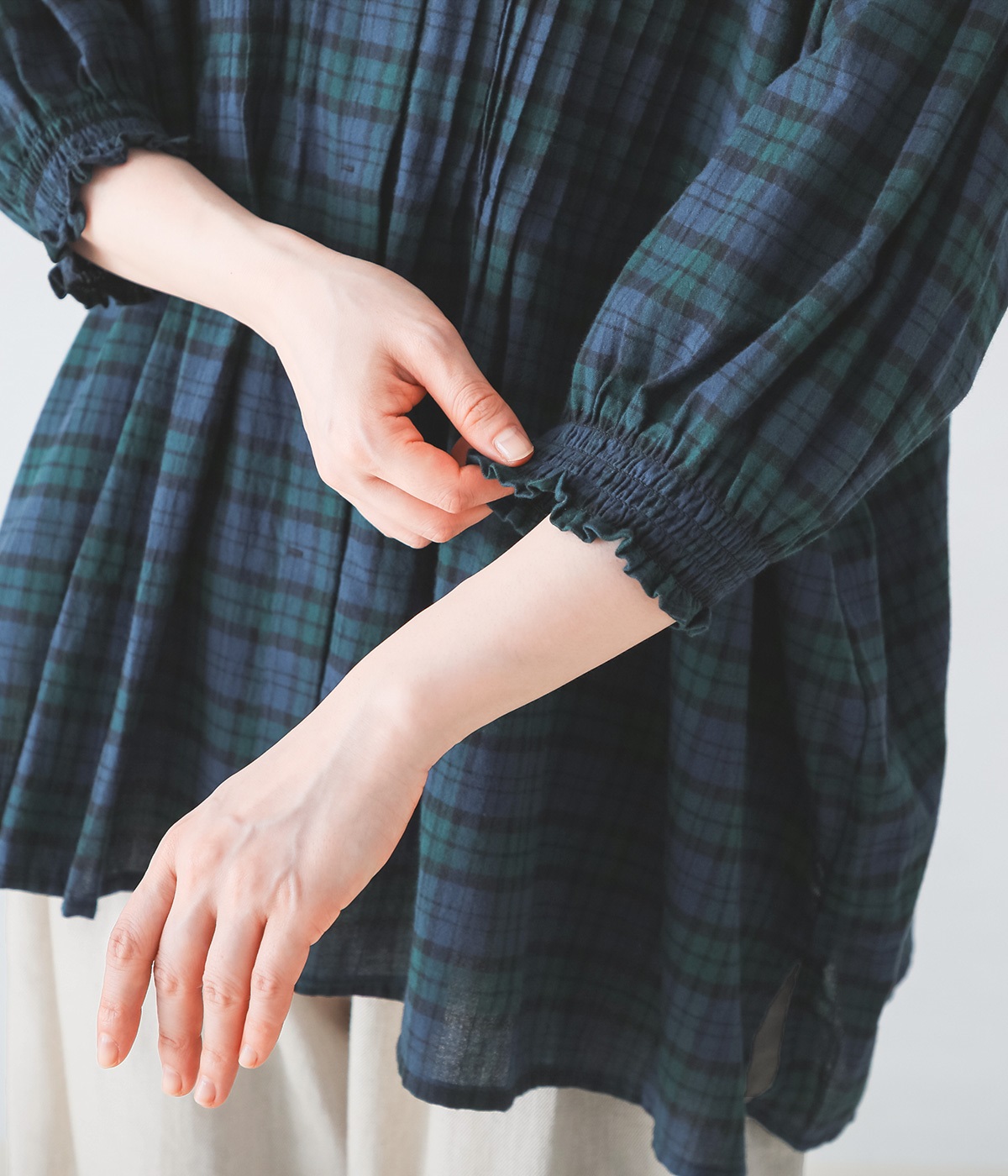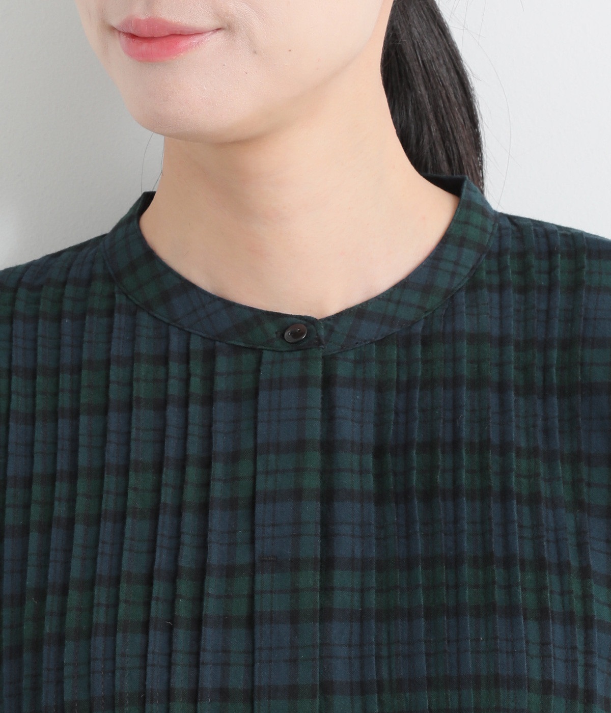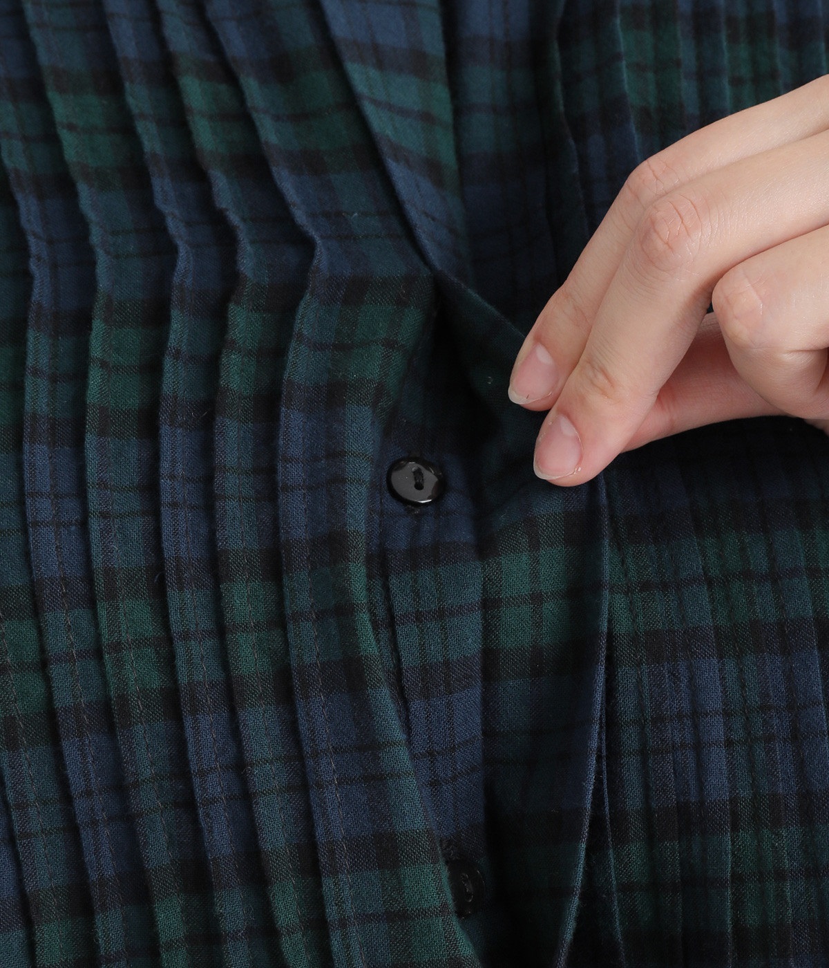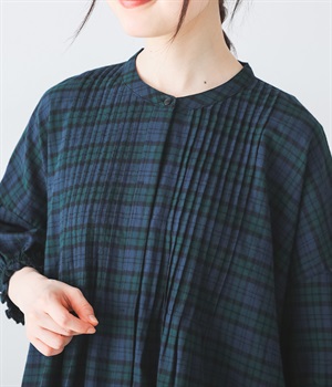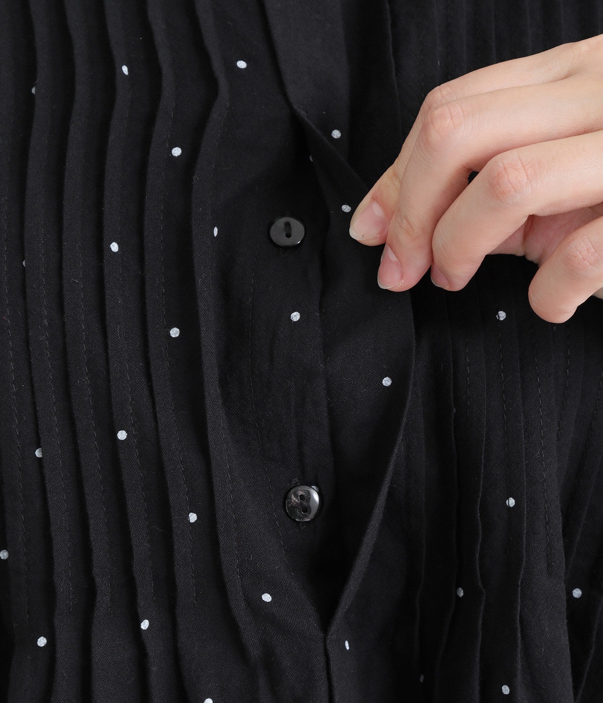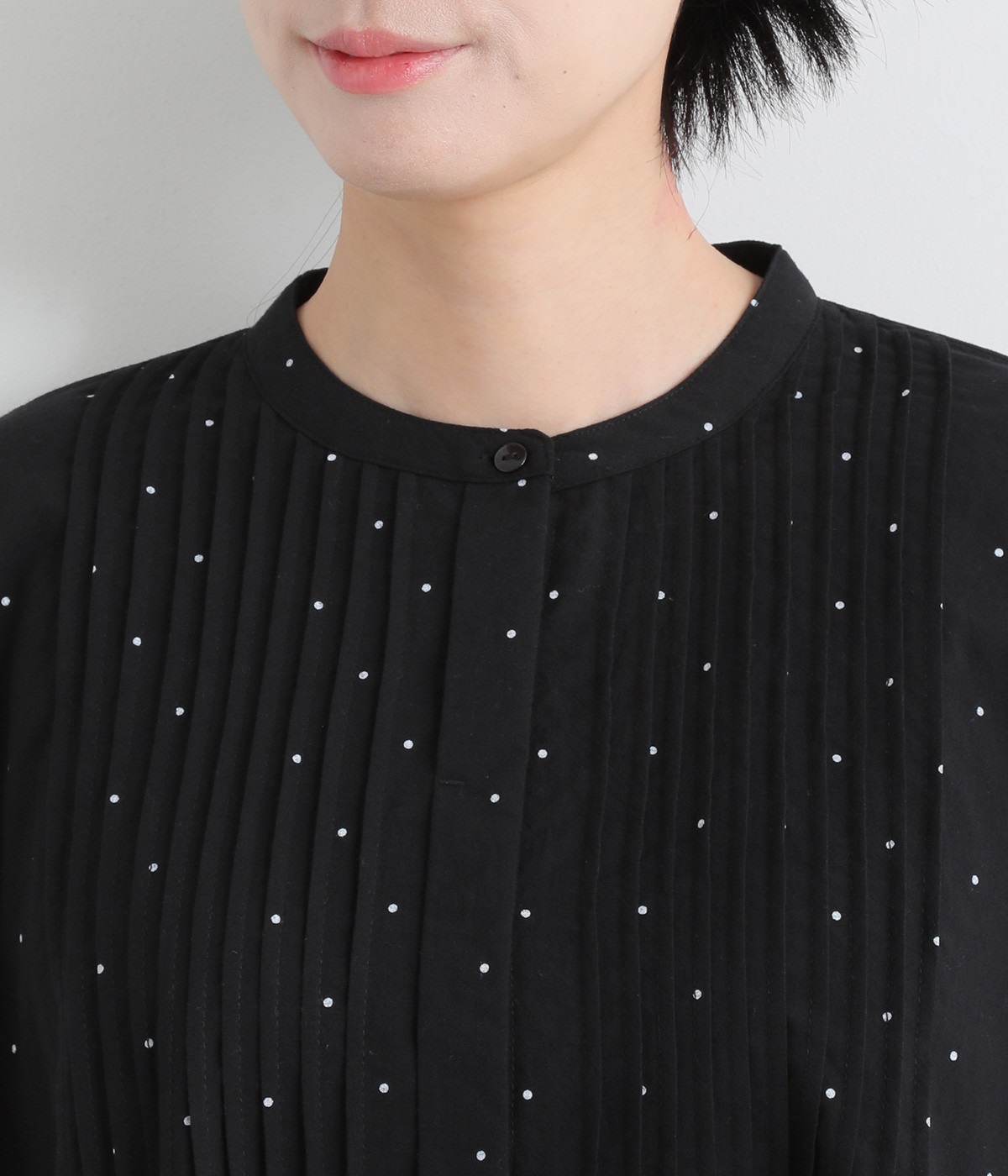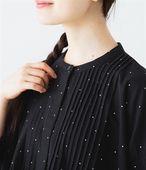 ピンタックの美しいラインを際立たせる、比翼仕立てのフロントボタン。洗練された雰囲気を纏えるアイテムです。