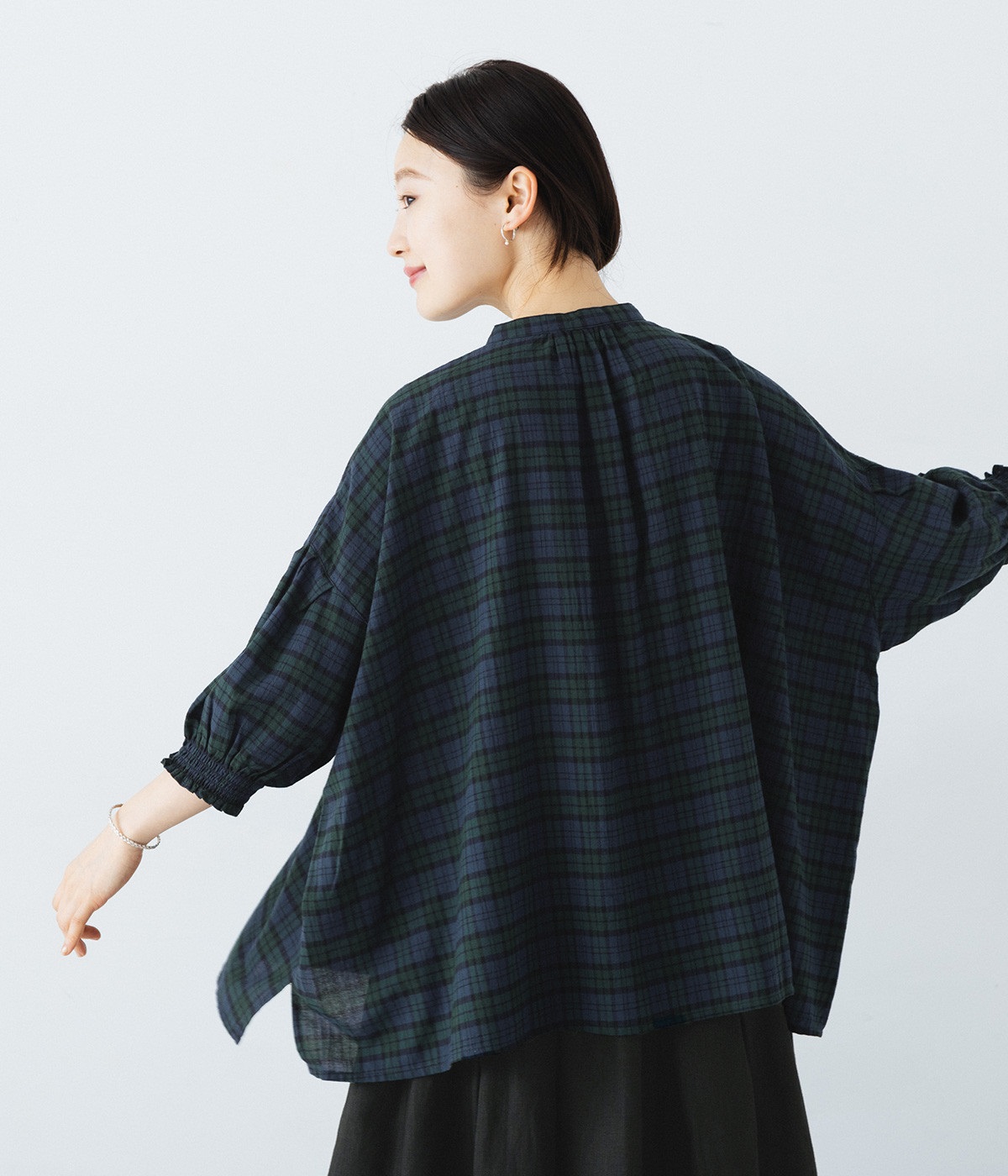 首元に寄せたギャザーが後ろ姿にニュアンスをプラス。ギャザーから広がる生地が、ふんわりとしたフォルムを描きます。