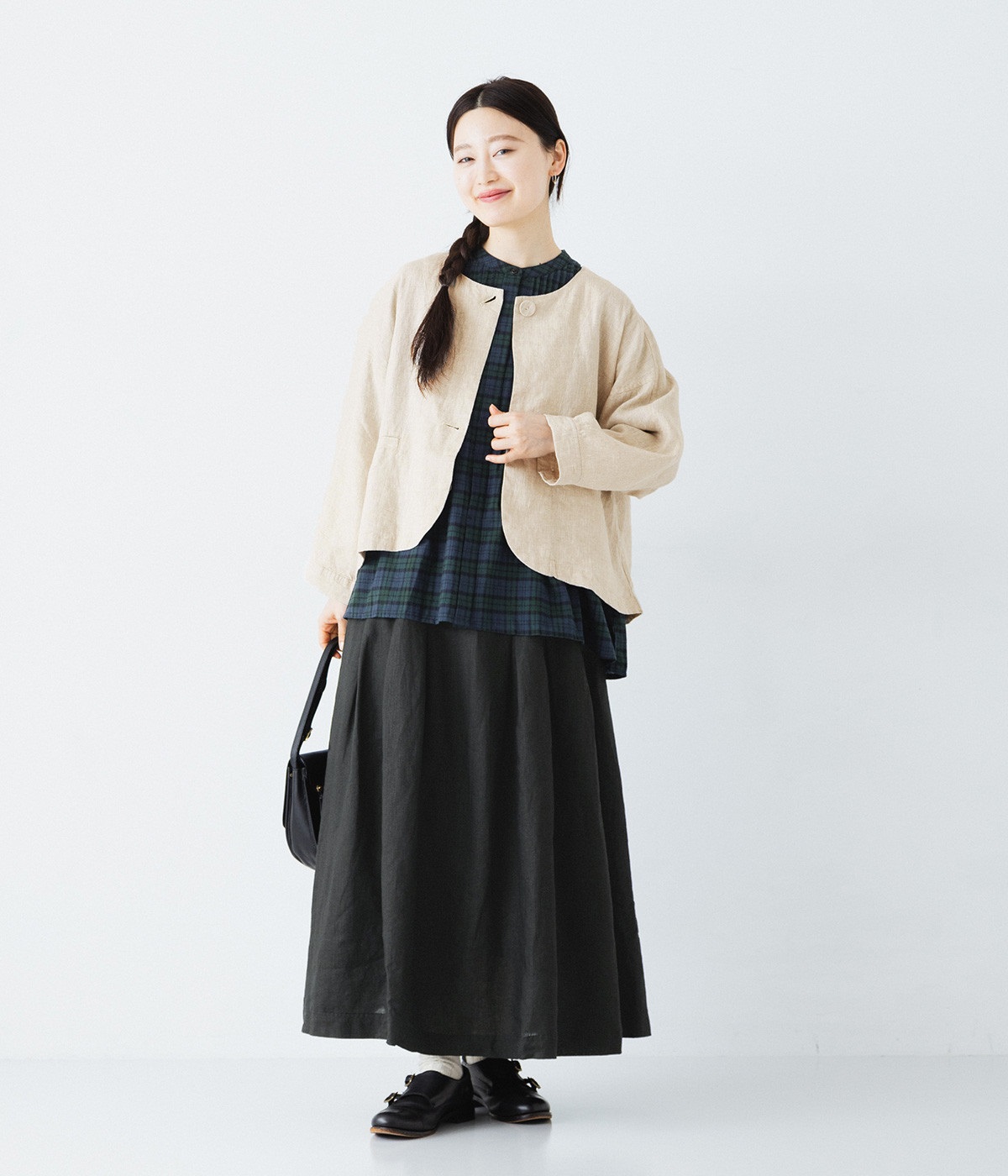 >。マスタードの差し色を加えることで、季節感のある装いに。