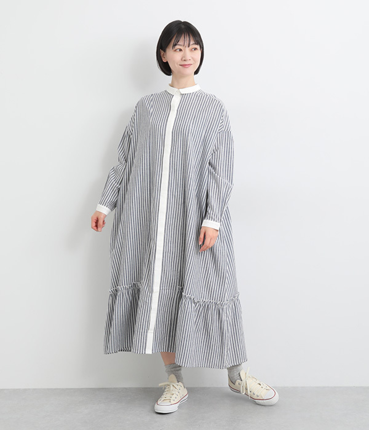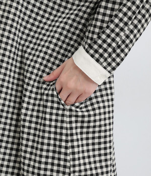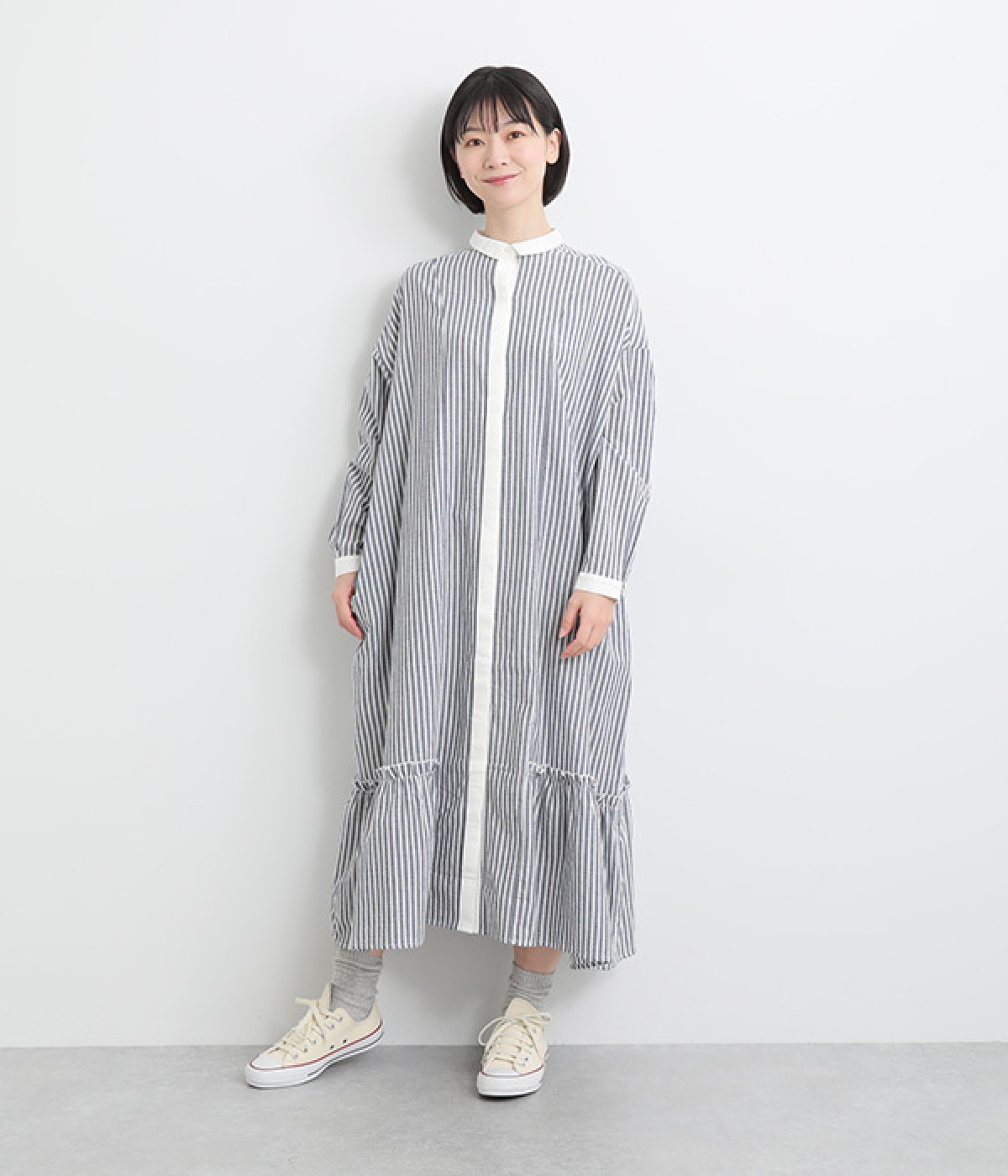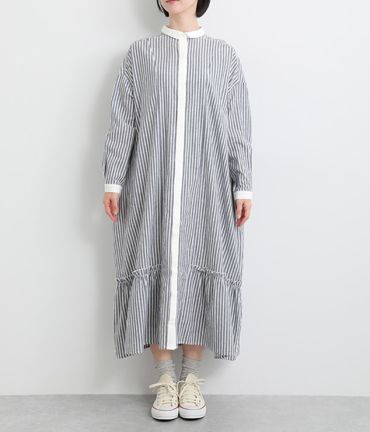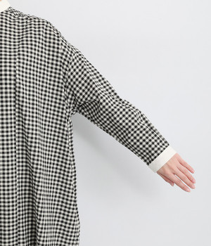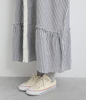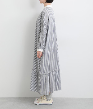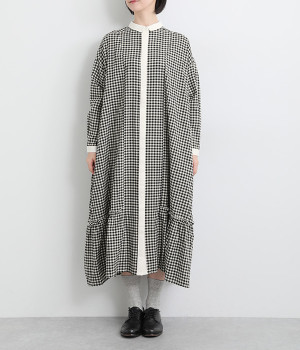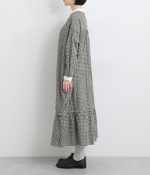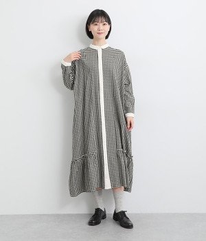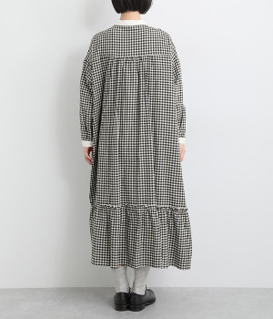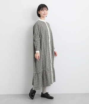 さりげないAラインシルエットに、ほんのりと甘さを添える裾フリルがアクセントになったシャツワンピースです。襟や前立てなどを無地で切り替えることで、メリハリをきかせました。羽織って合わせるのもおすすめな一枚です。