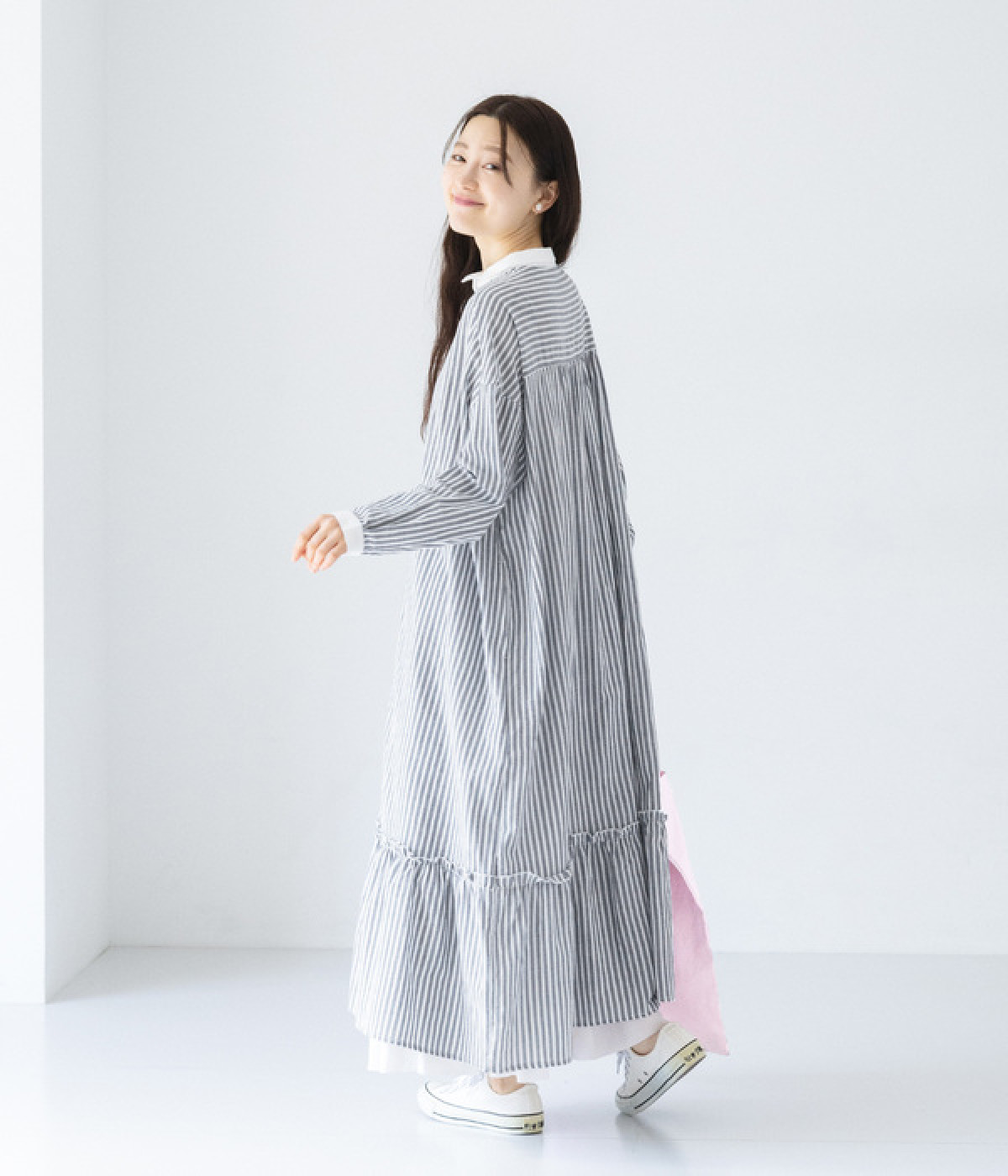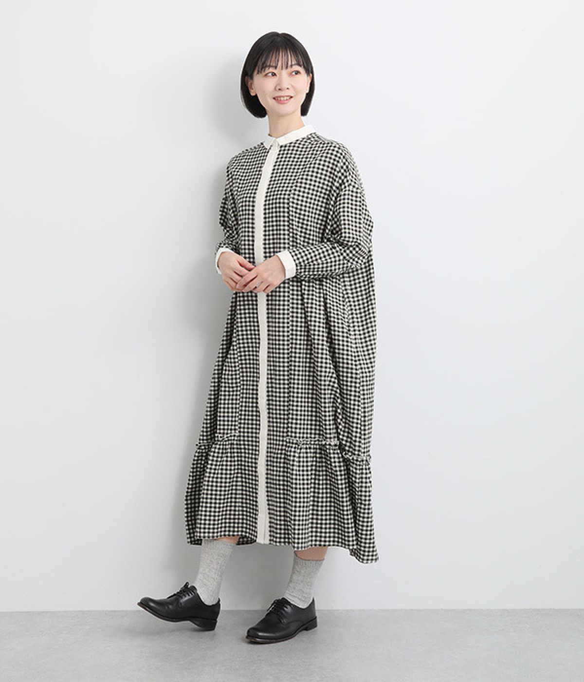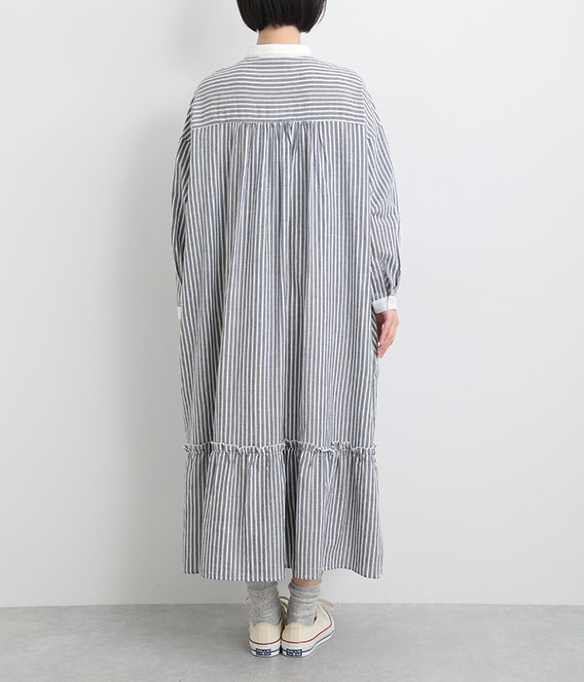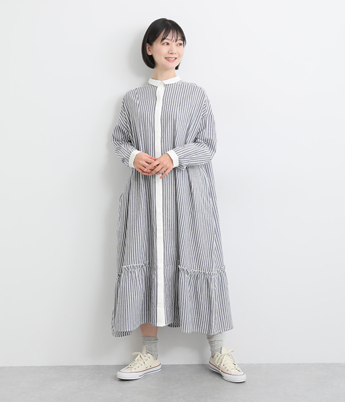 さりげないAラインシルエットに、ほんのりと甘さを添える裾フリルがアクセントになったシャツワンピースです。襟や前立てなどを無地で切り替えることで、メリハリをきかせました。羽織って合わせるのもおすすめな一枚です。
