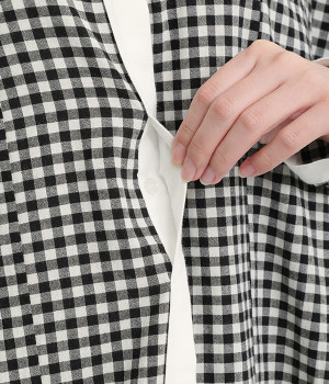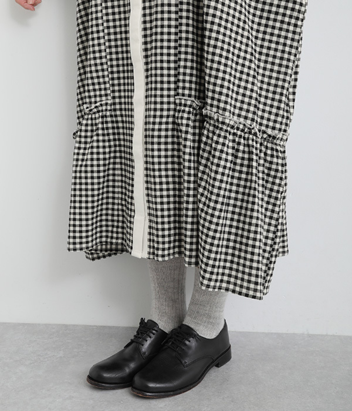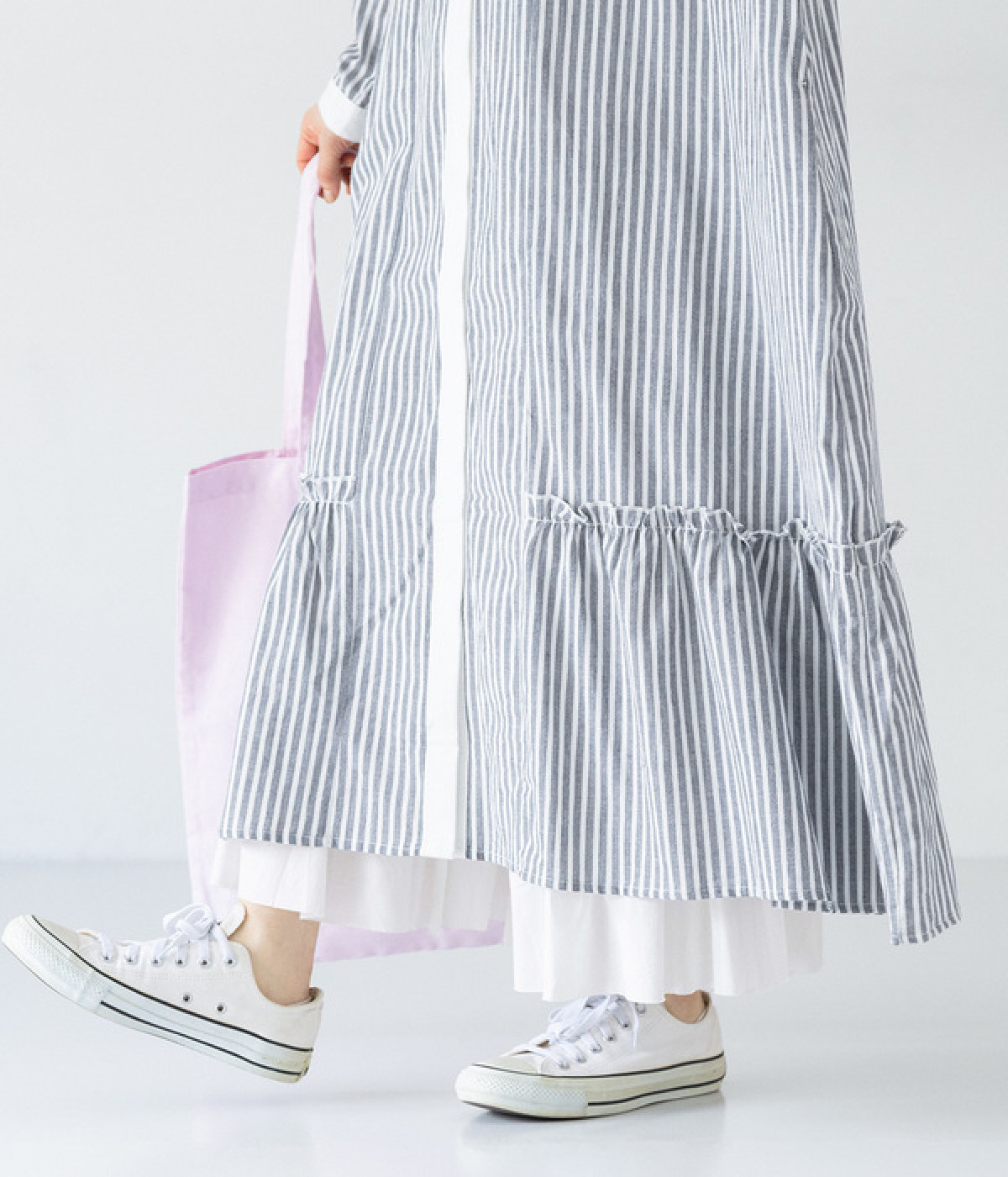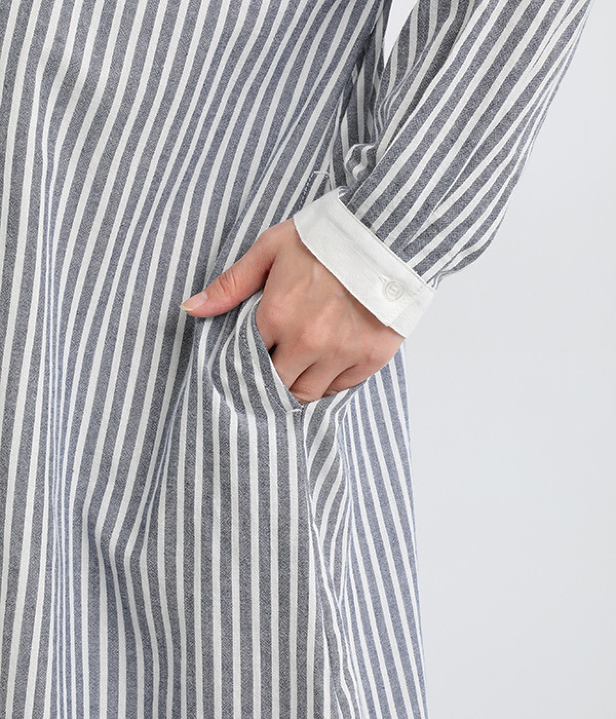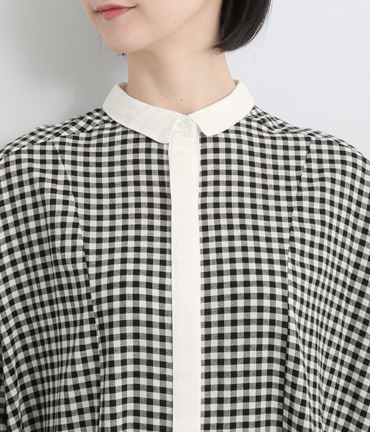 さりげないAラインシルエットに、ほんのりと甘さを添える裾フリルがアクセントになったシャツワンピースです。襟や前立てなどを無地で切り替えることで、メリハリをきかせました。羽織って合わせるのもおすすめな一枚です。
