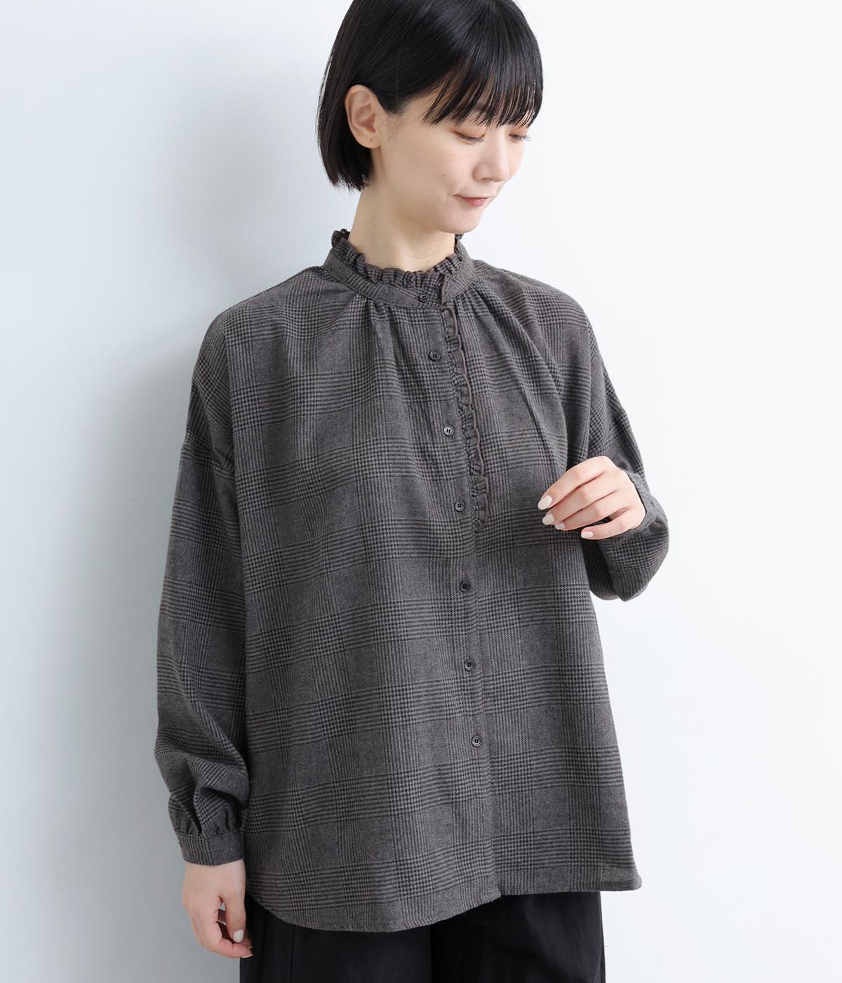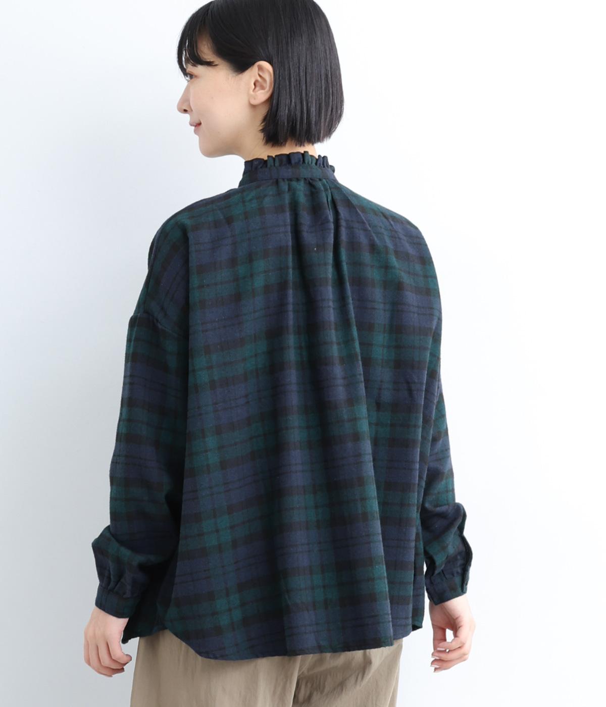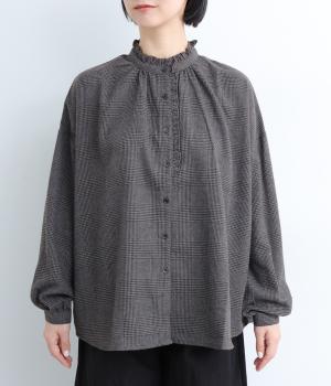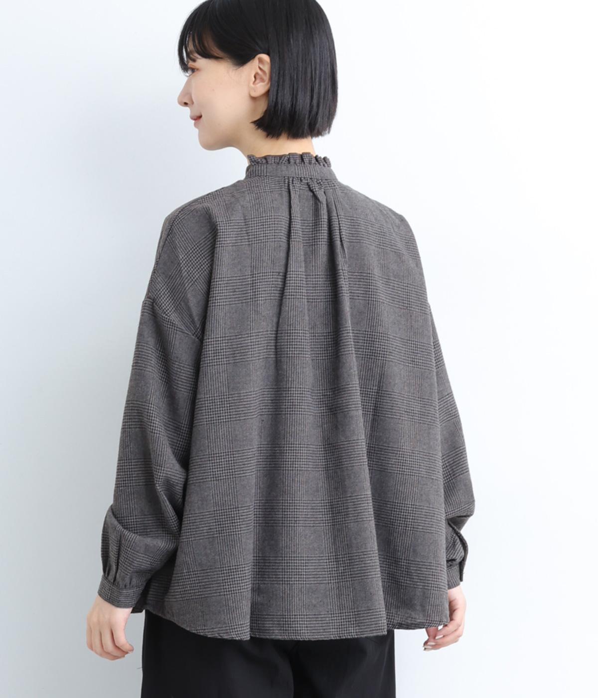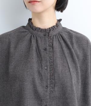 首まわりから前立てまで続くフリルが可愛らしいデザイン。ボリュームのある袖もあわせてフェミニンテイストな一枚で、落ち着いたチェック柄がトラッドな要素をプラス。フリルを活かしてジャケットなど羽織り合わせもおすすめ。