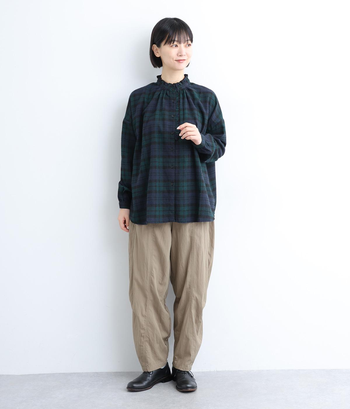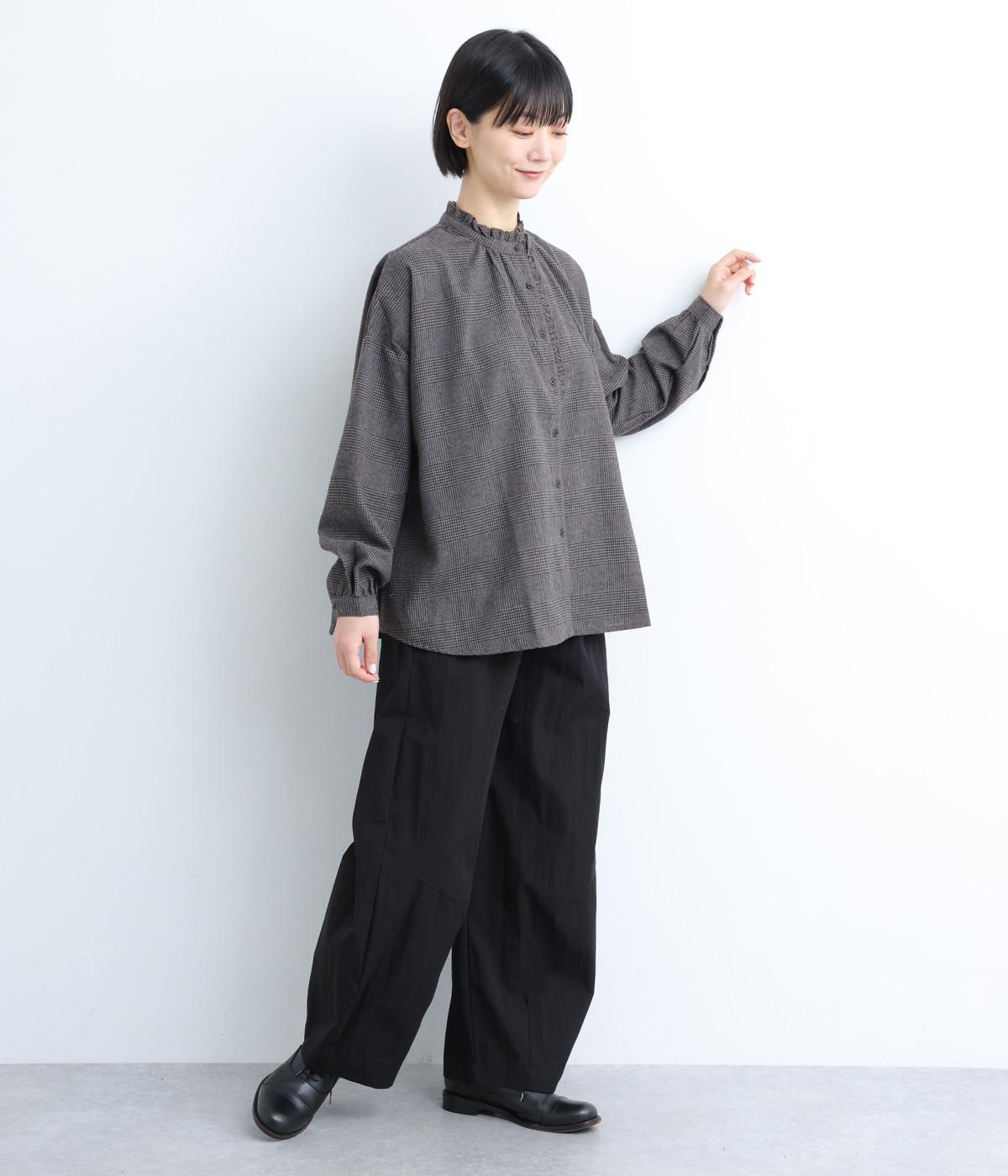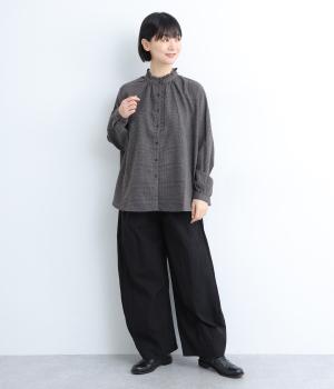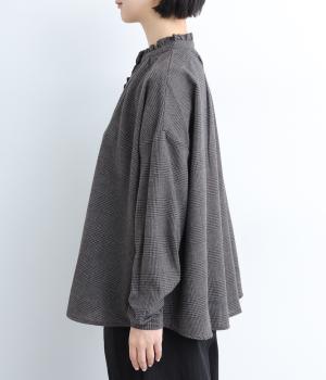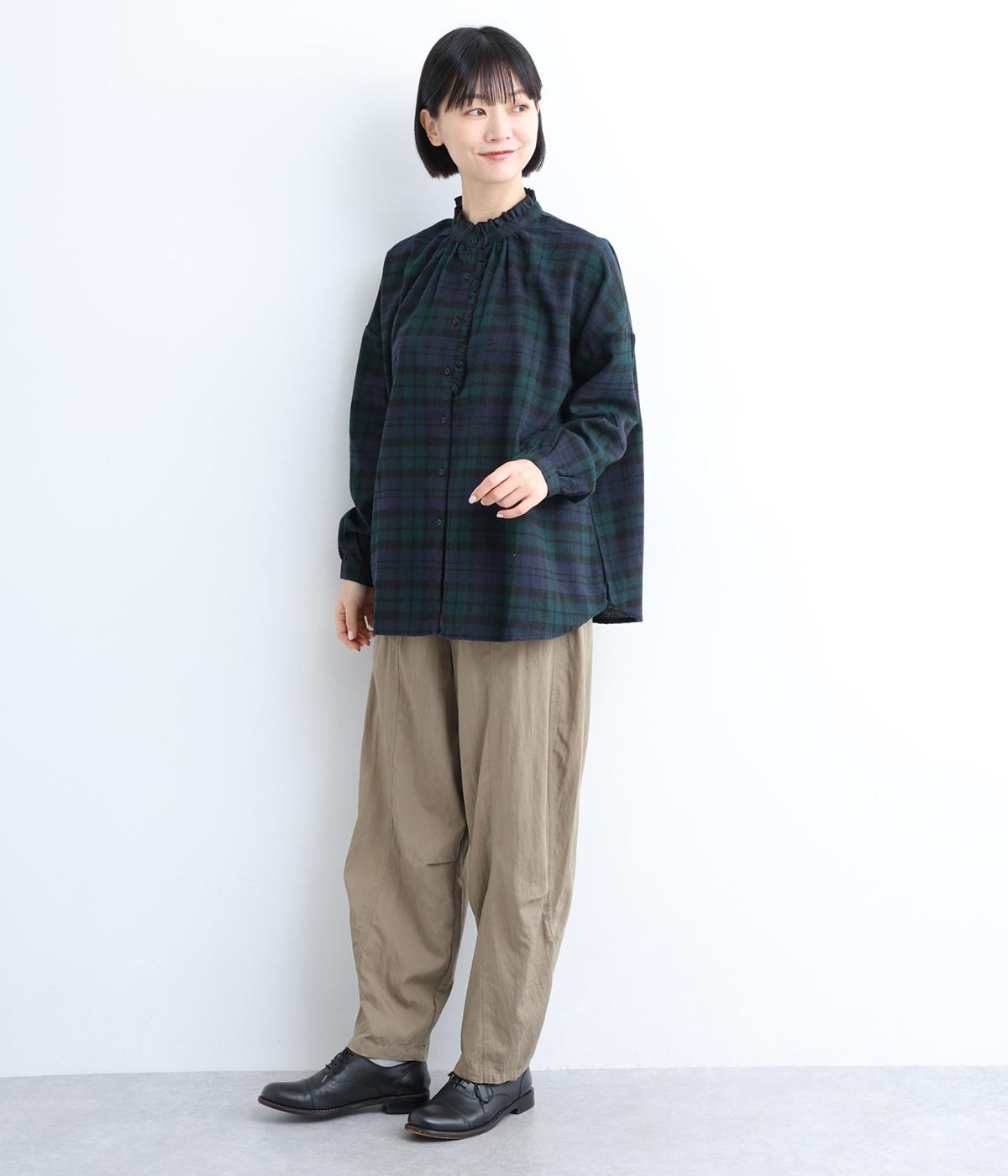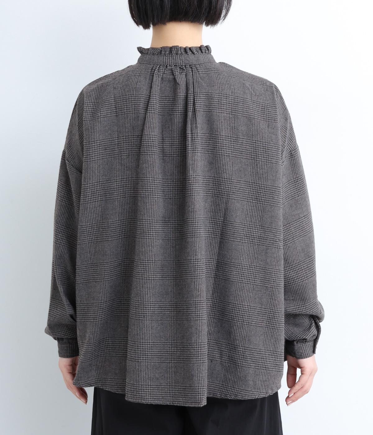 首まわりから前立てまで続くフリルが可愛らしいデザイン。ボリュームのある袖もあわせてフェミニンテイストな一枚で、落ち着いたチェック柄がトラッドな要素をプラス。フリルを活かしてジャケットなど羽織り合わせもおすすめ。