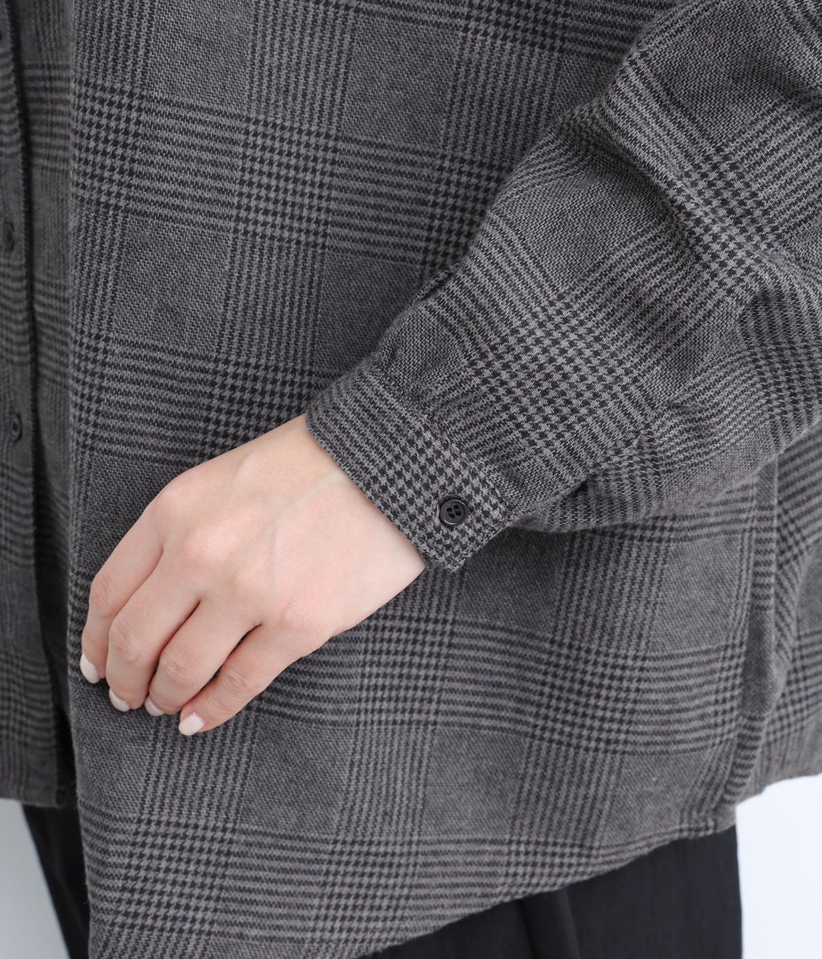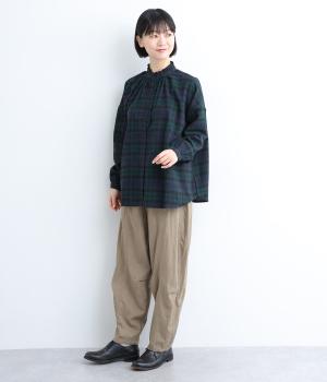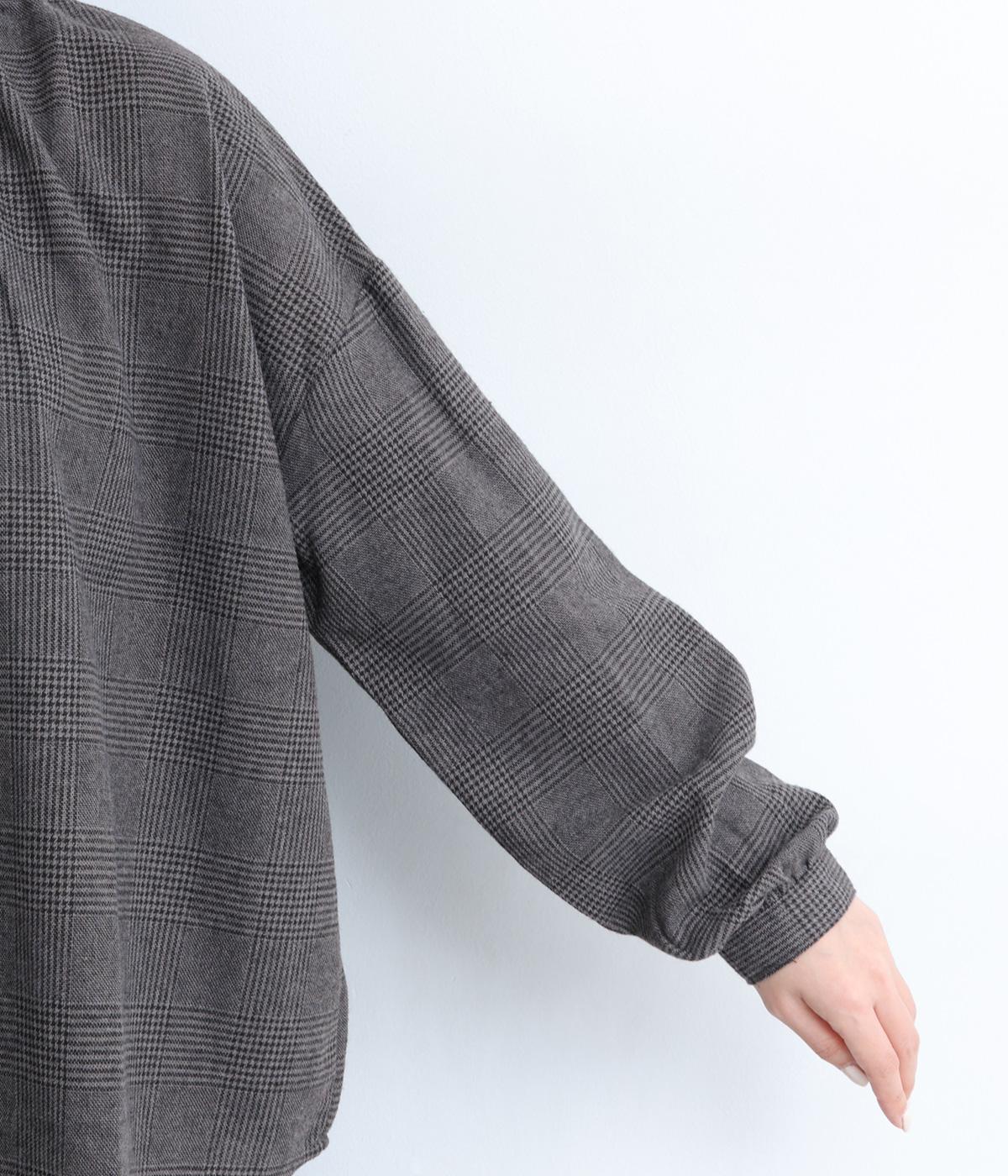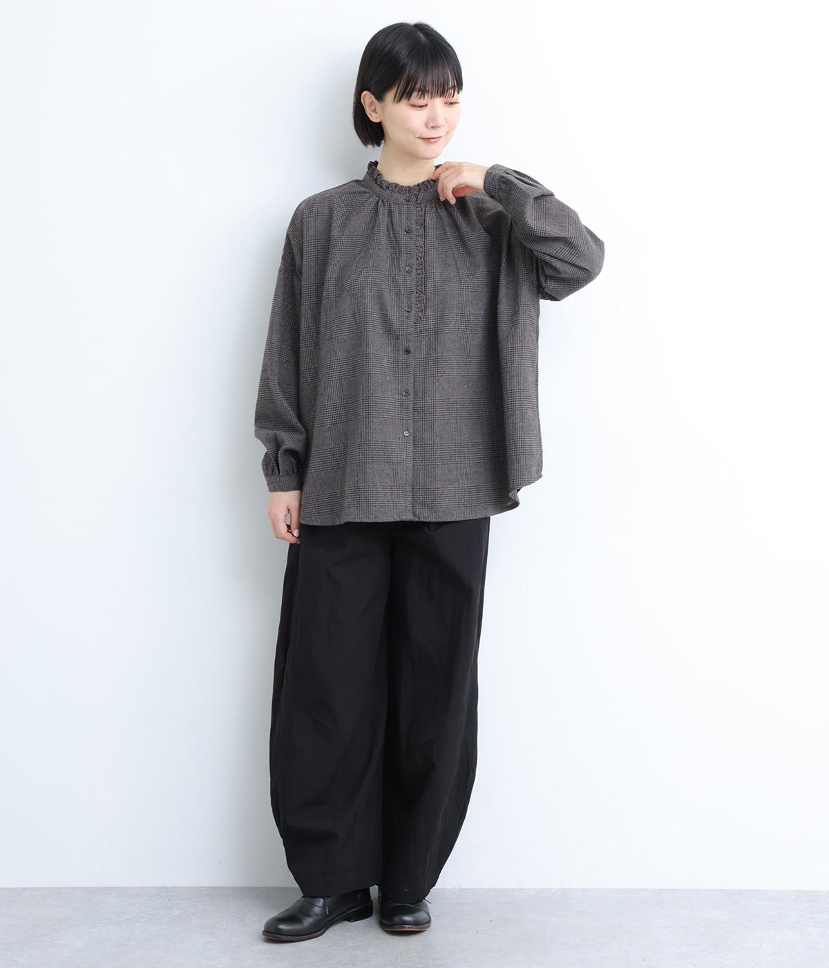 首まわりから前立てまで続くフリルが可愛らしいデザイン。ボリュームのある袖もあわせてフェミニンテイストな一枚で、落ち着いたチェック柄がトラッドな要素をプラス。フリルを活かしてジャケットなど羽織り合わせもおすすめ。