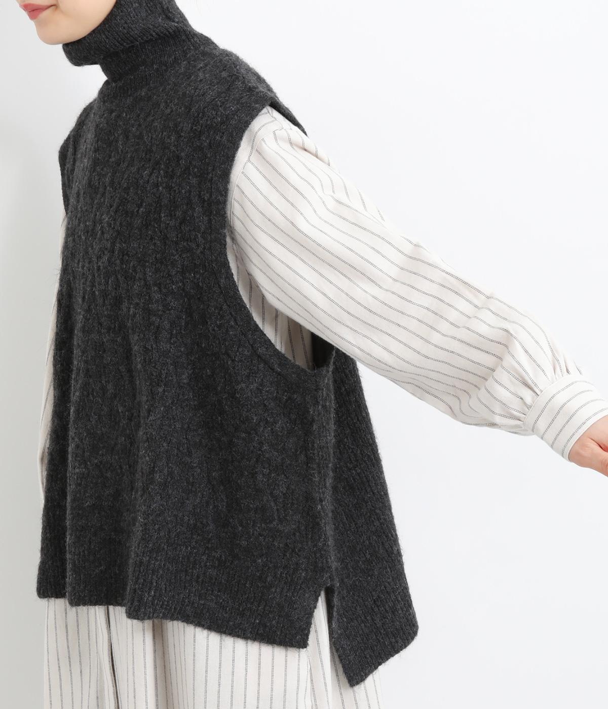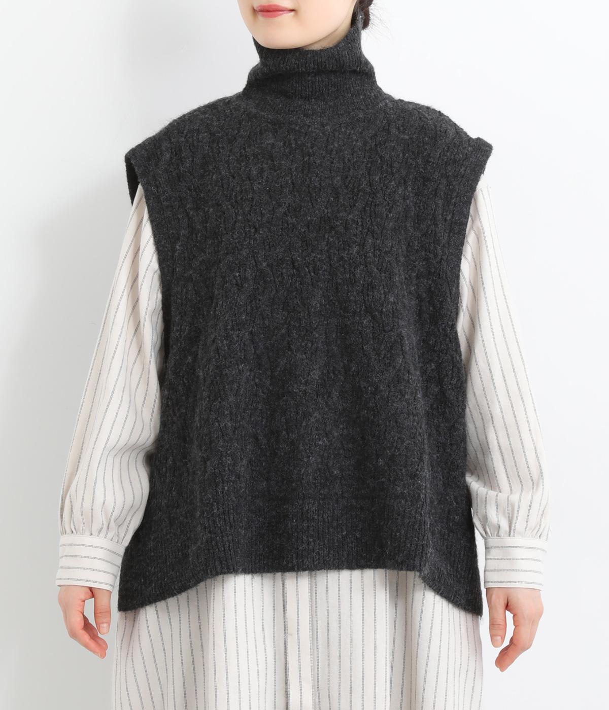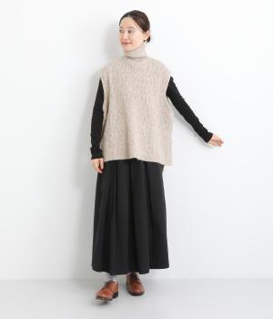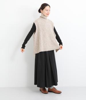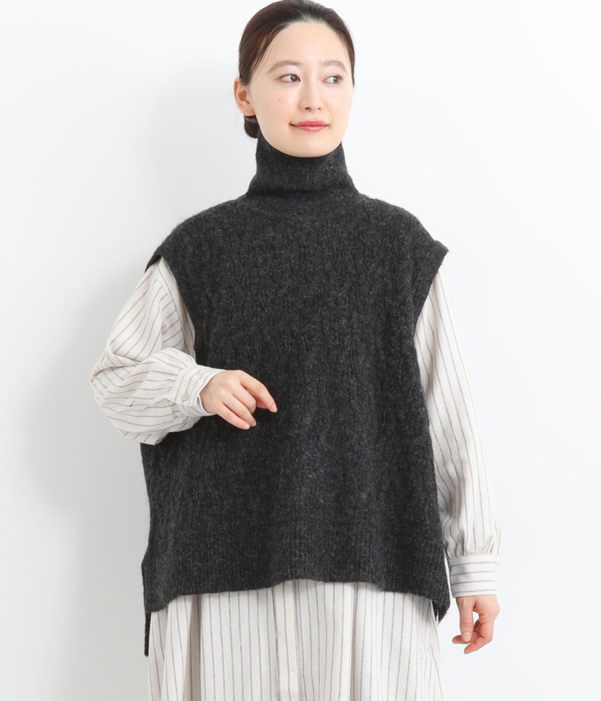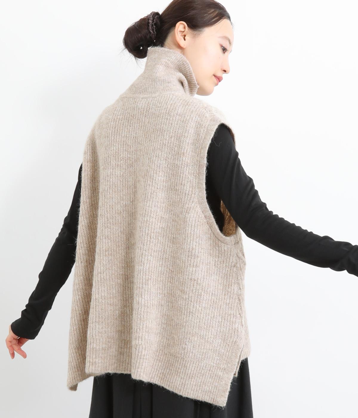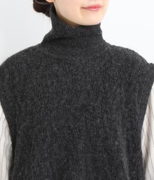 程よい厚みとふわっとした素材のタートルニットベスト。やわらかな質感は安心感たっぷりの着心地。前身ごろのケーブル編みが魅力的な一着です。