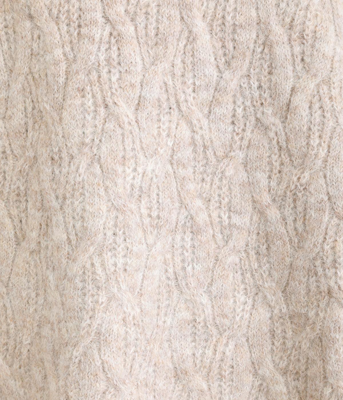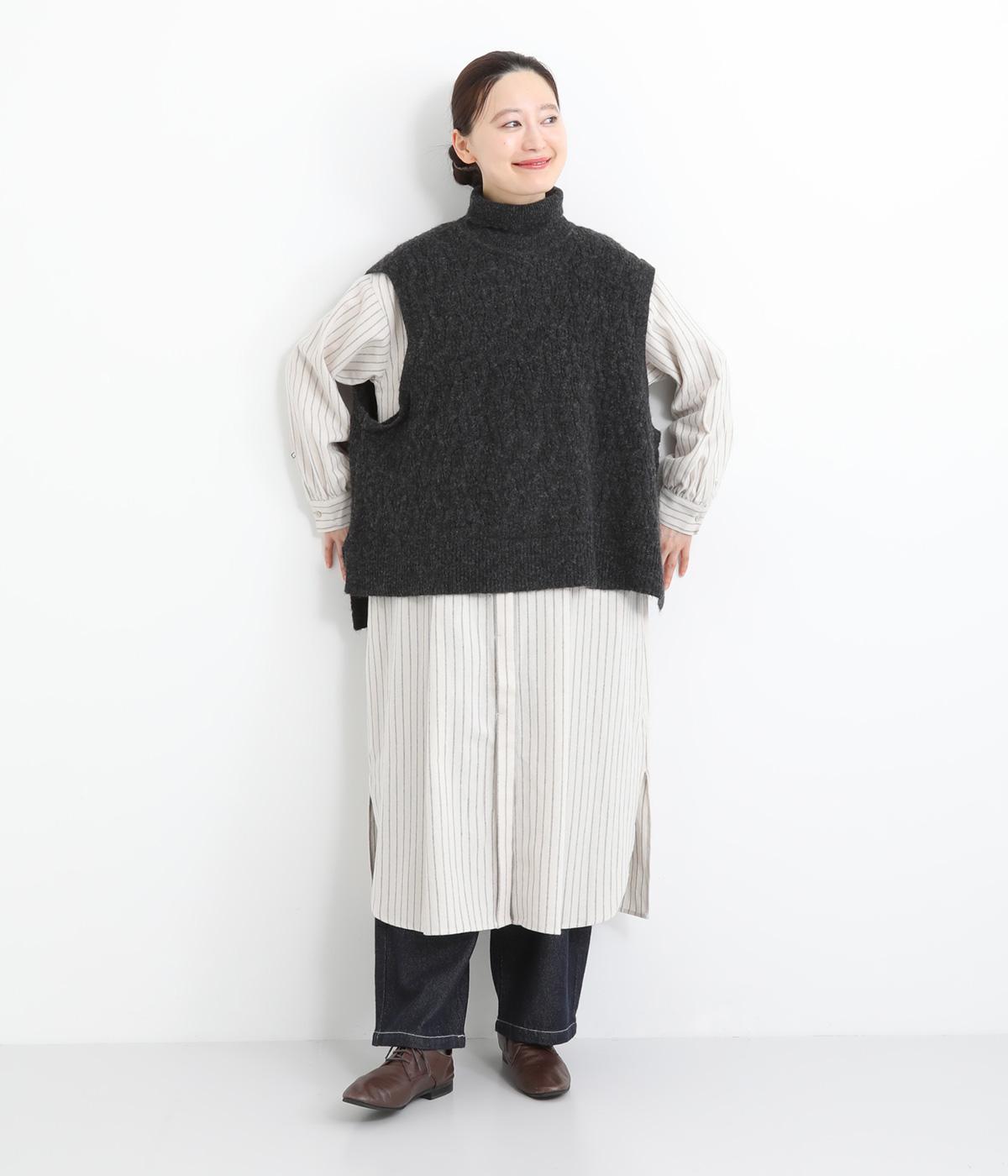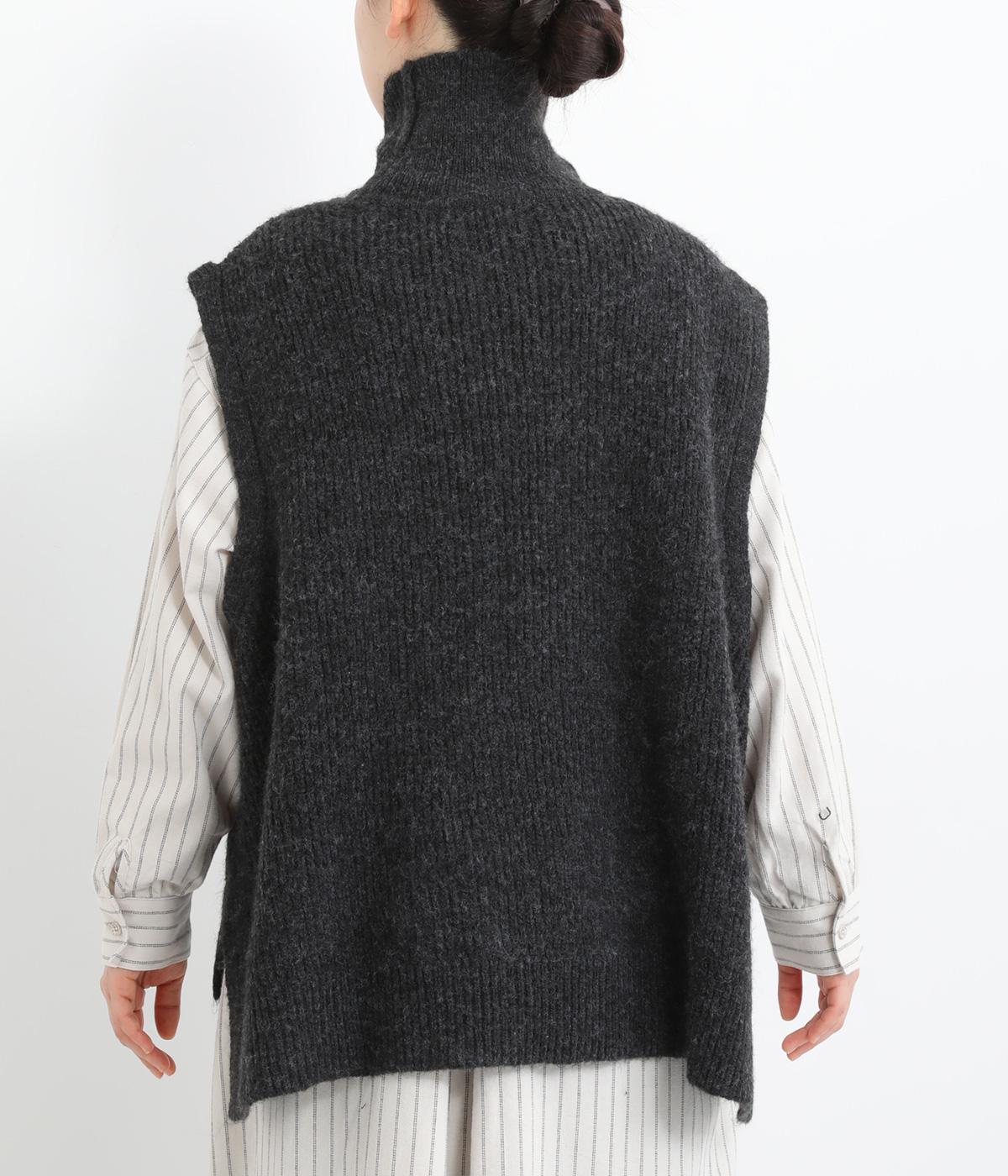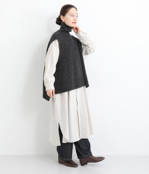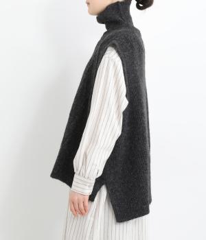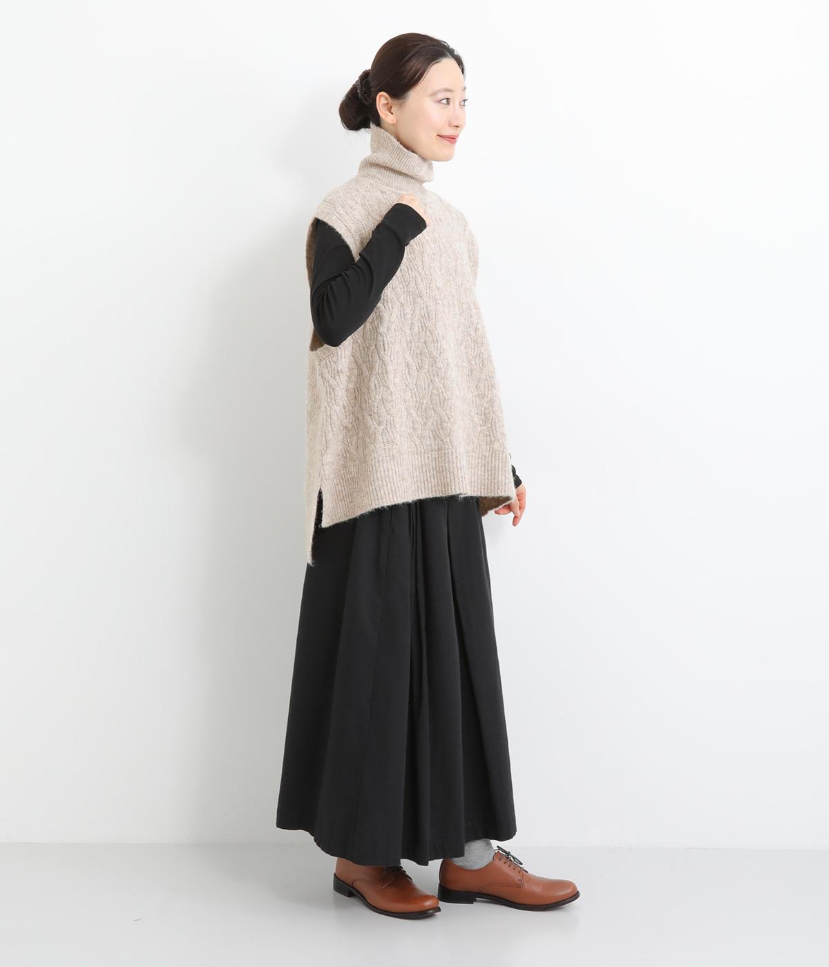 程よい厚みとふわっとした素材のタートルニットベスト。やわらかな質感は安心感たっぷりの着心地。前身ごろのケーブル編みが魅力的な一着です。