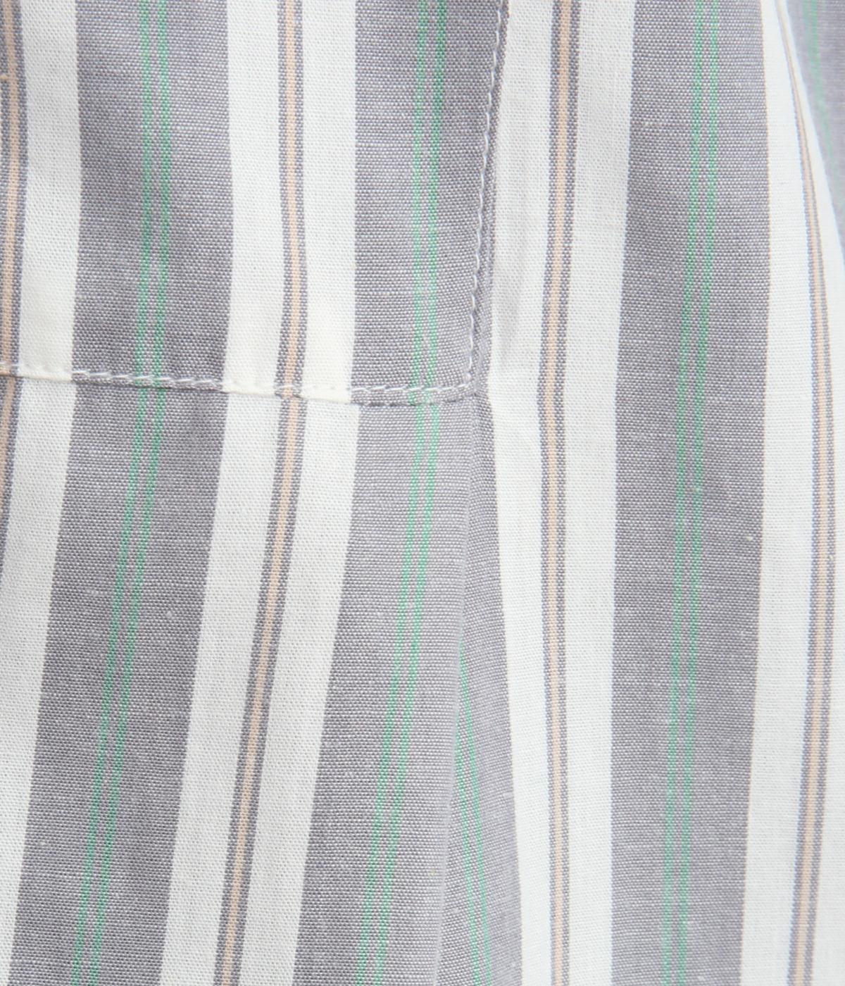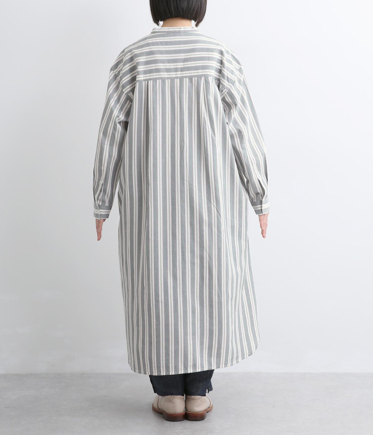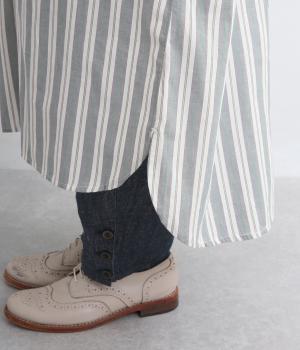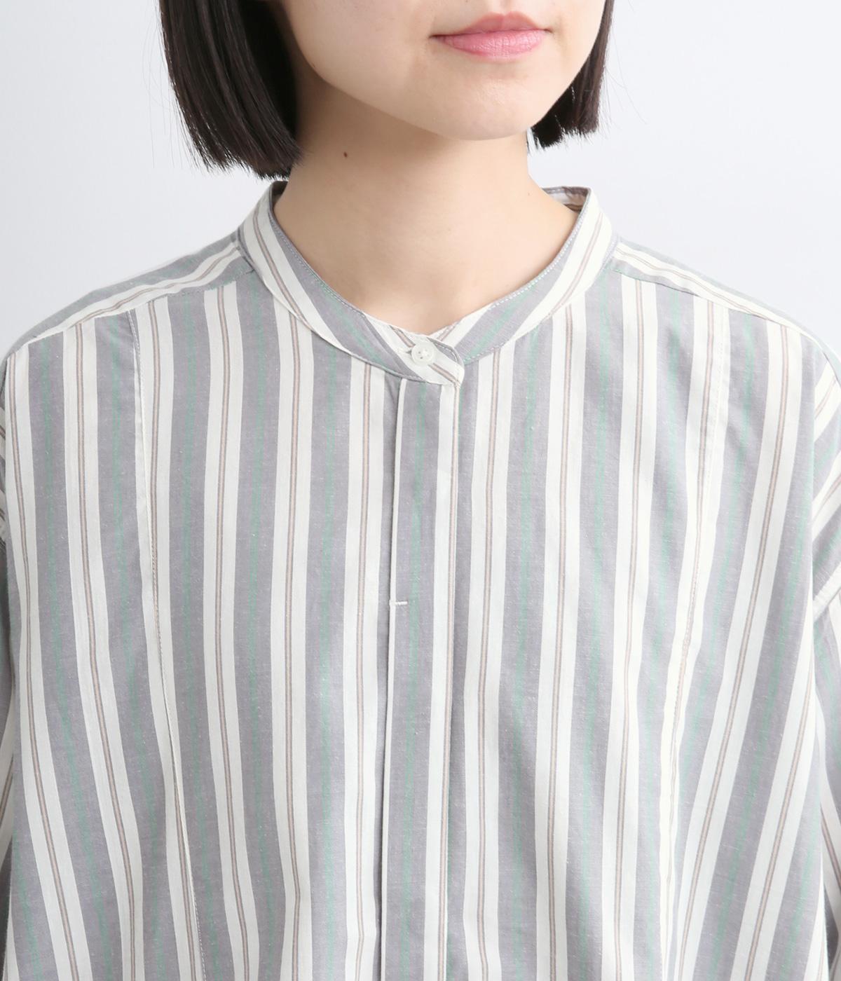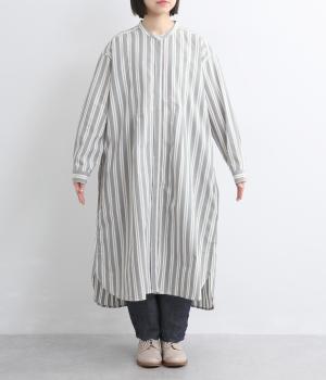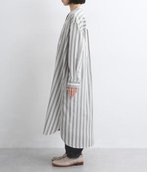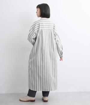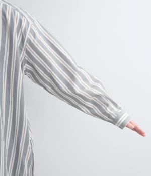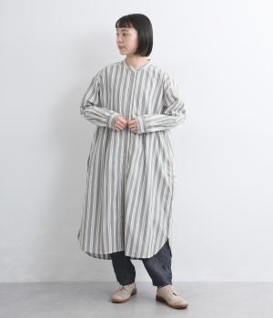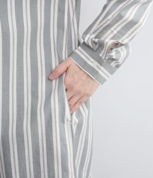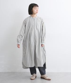 胸元から入れた切り替えが縦のラインを強調し、すっきりとした印象に。ボタンは比翼仕様で、生地の表情を引き立てながら上品に仕上げました。前後差のあるラウンドヘムが軽やかな動きを生み、足さばきも快適。パンツとのレイヤードもたのしめ、コーディネートの幅が広がります。