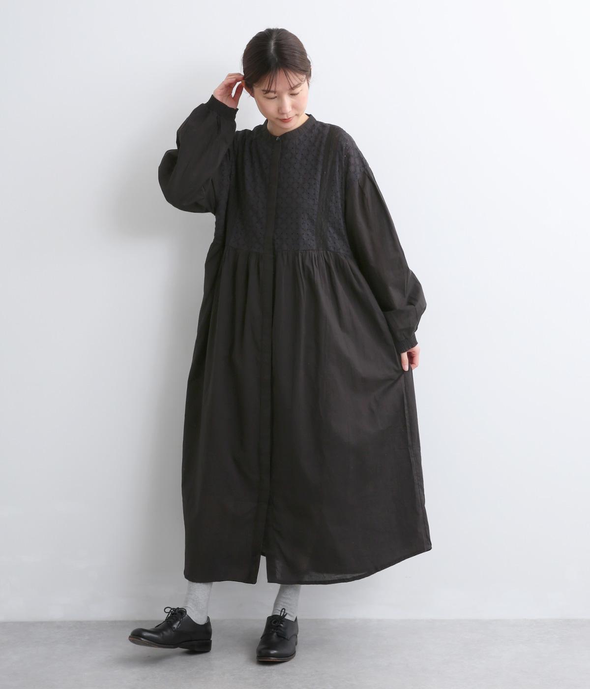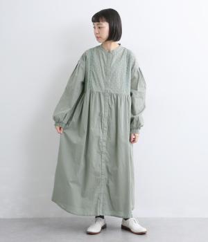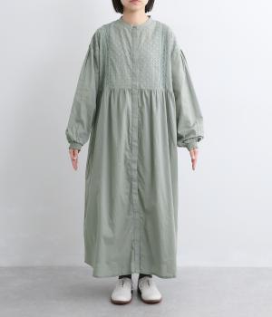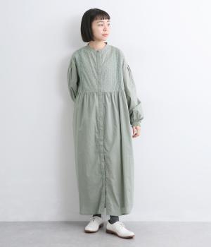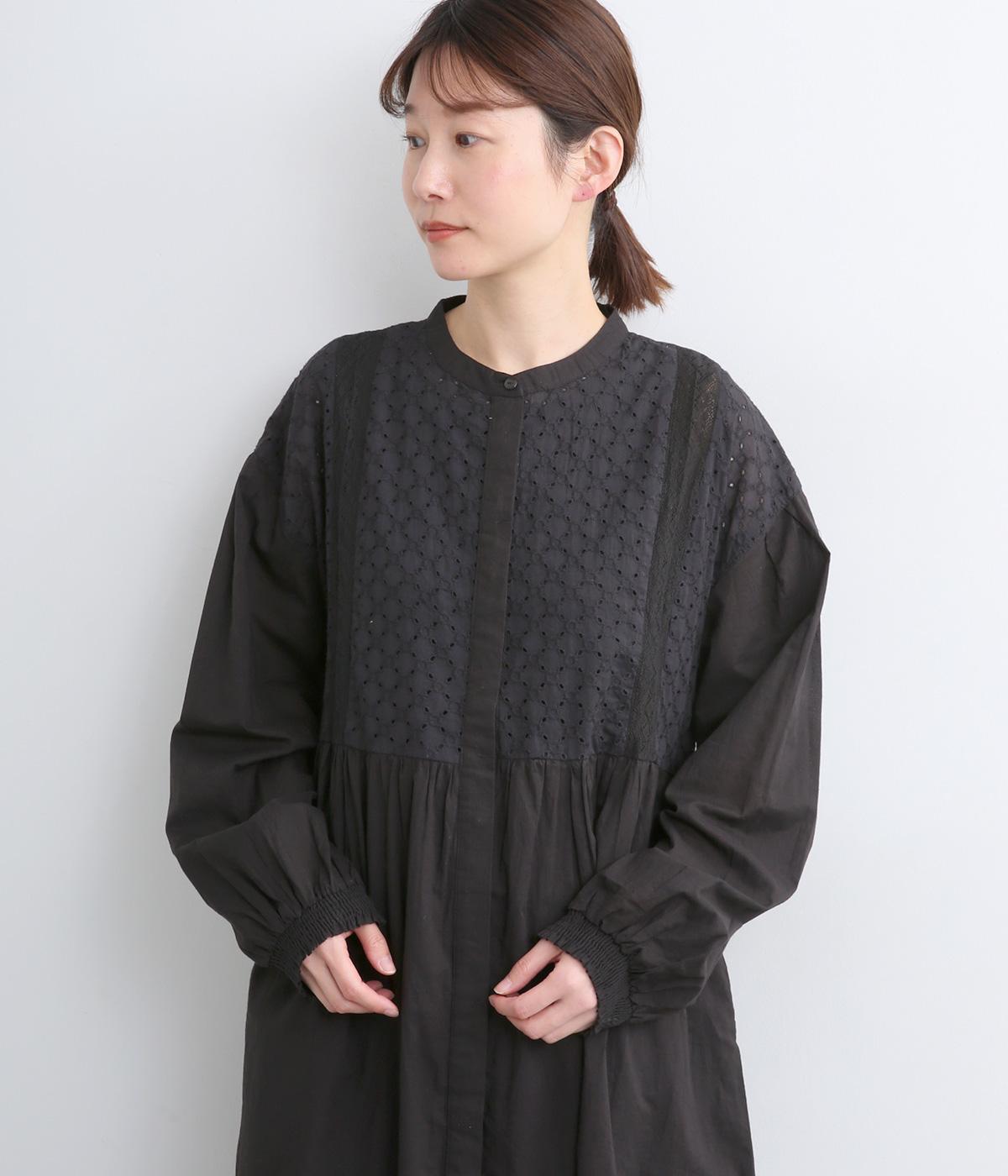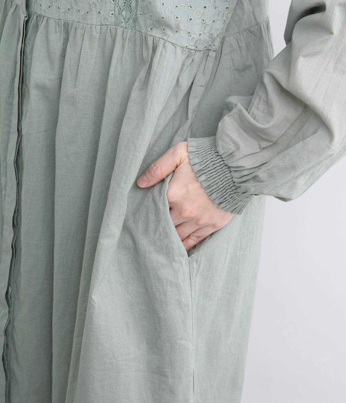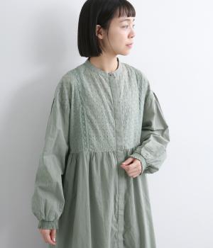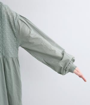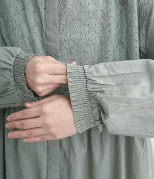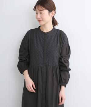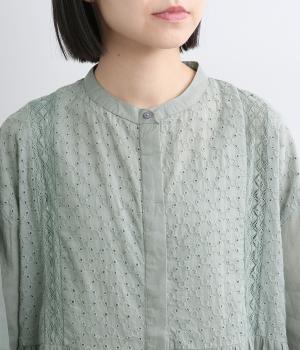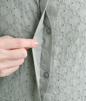 胸ヨークにあしらった刺しゅうが、さりげないかわいらしさを添えるデザインです。切り替え部分からギャザーを施し、ふんわりとした立体感を演出します。前ボタンは比翼仕立てで、すっきりと上品な印象に。ボリュームのある袖はゴム仕様なので、袖をまくって抜け感のある着こなしもたのしめます。