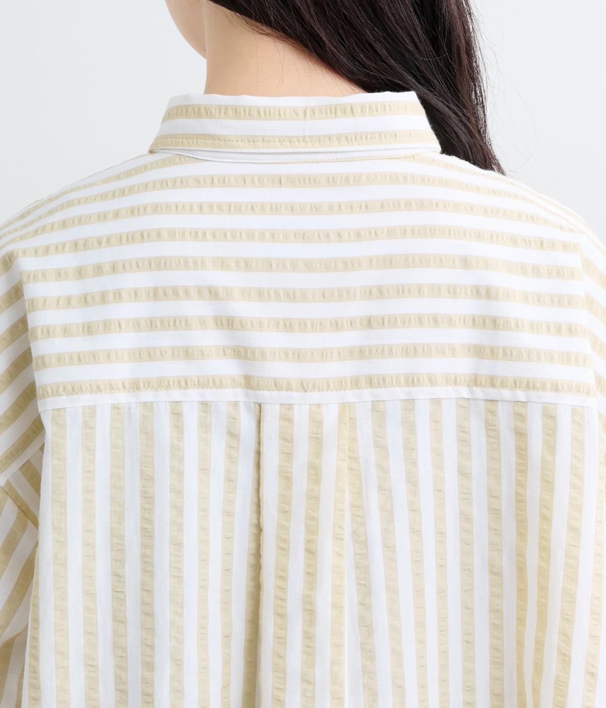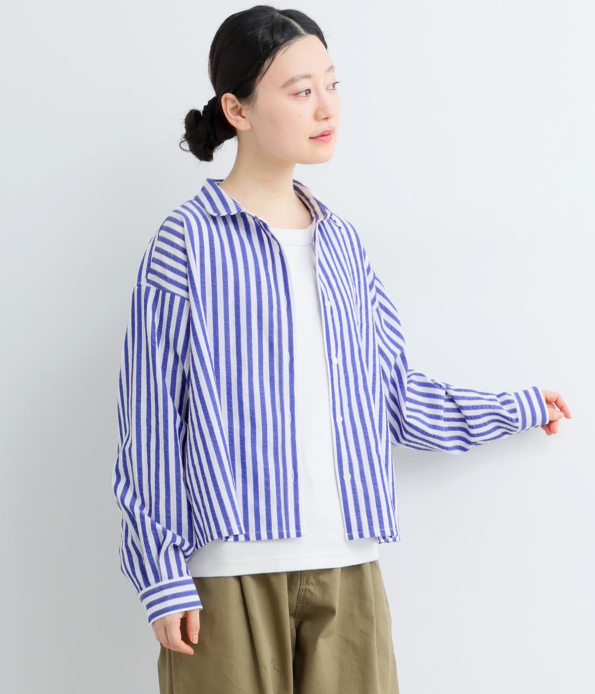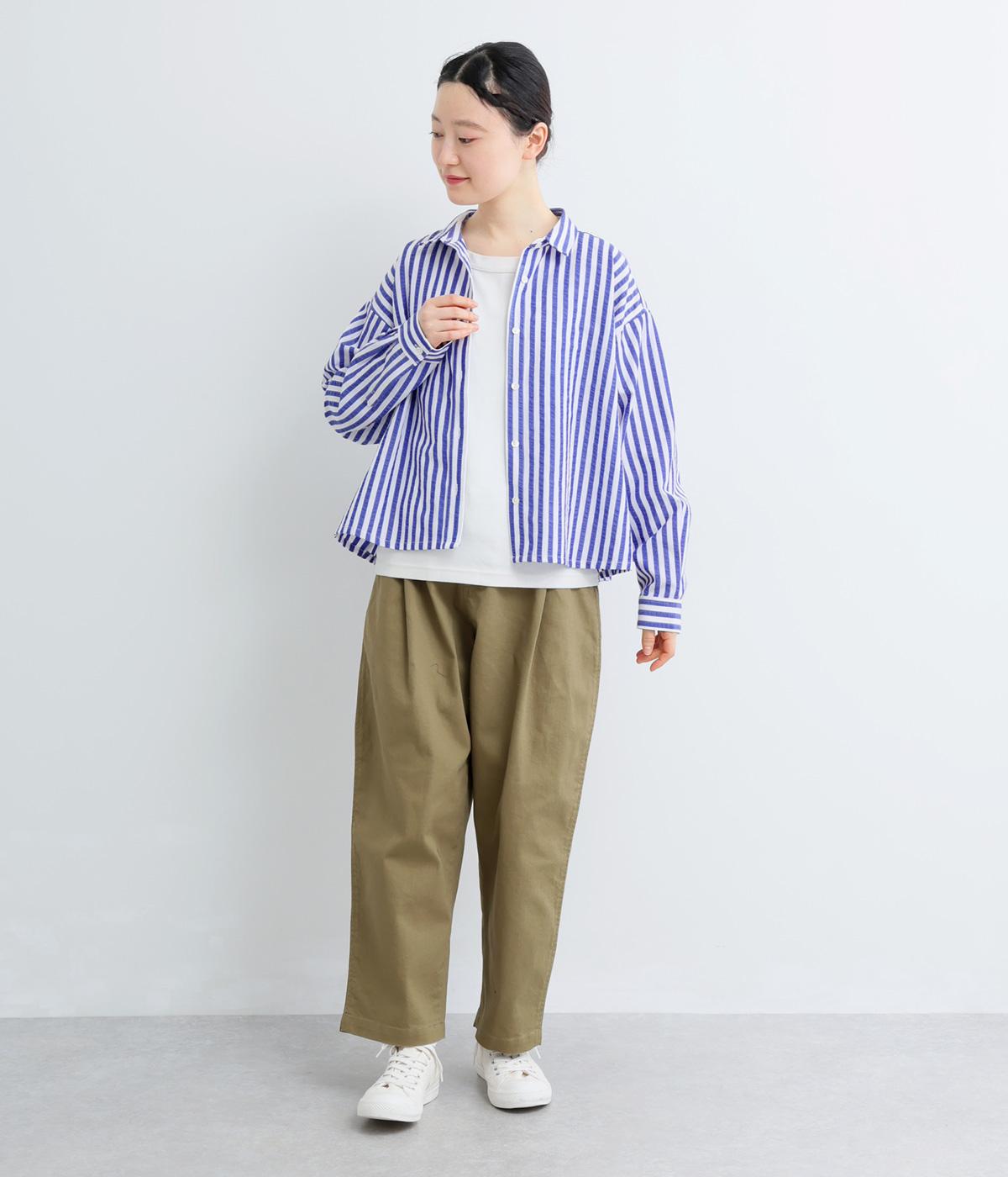 コットンとポリエステルでストライプを表現しました。軽やかな素材感がさわやかな雰囲気を後押しします。シボ感のある表面でシワになりづらく、速乾性に優れた生地です。