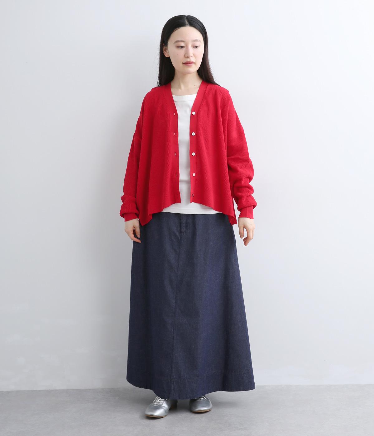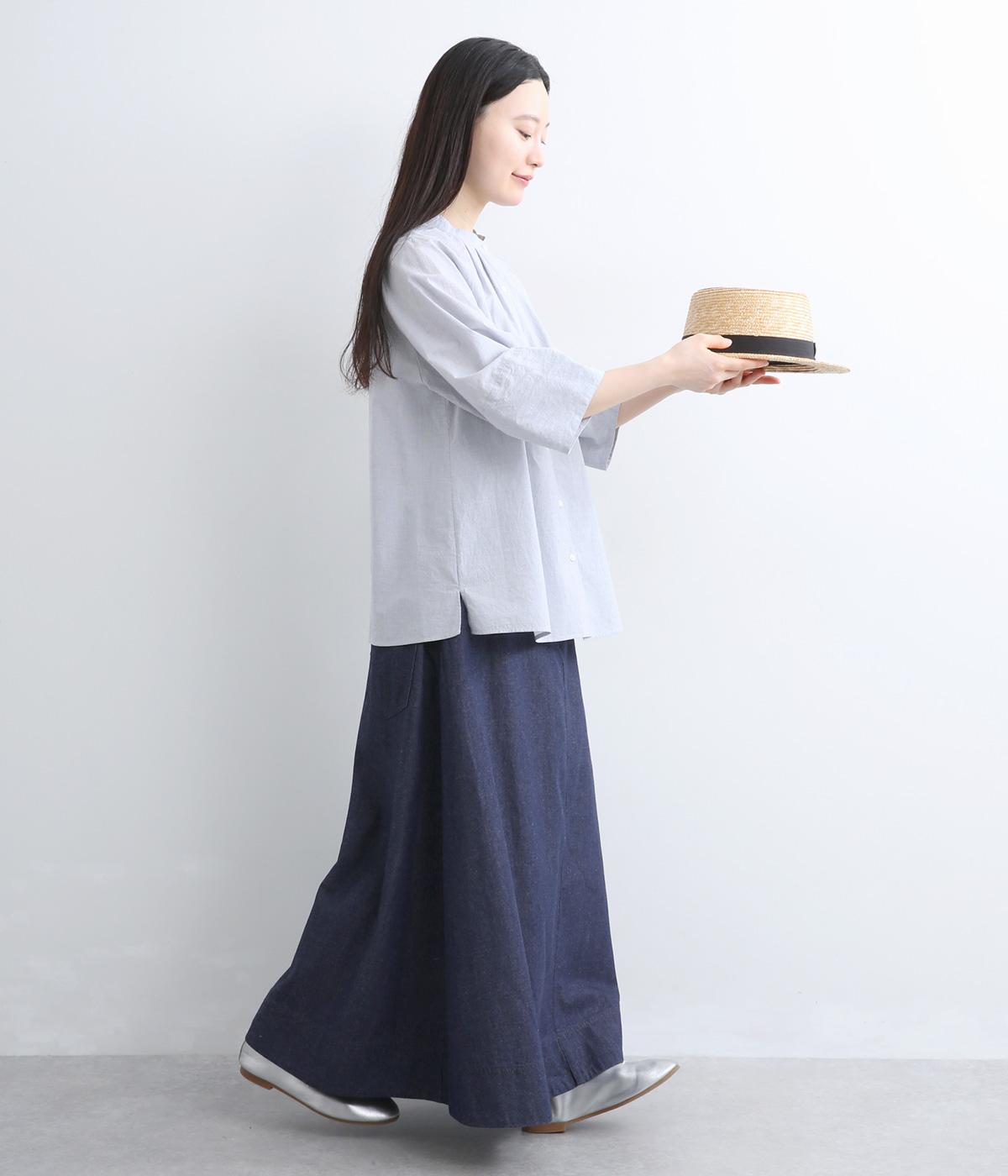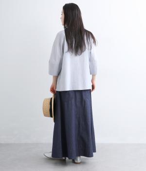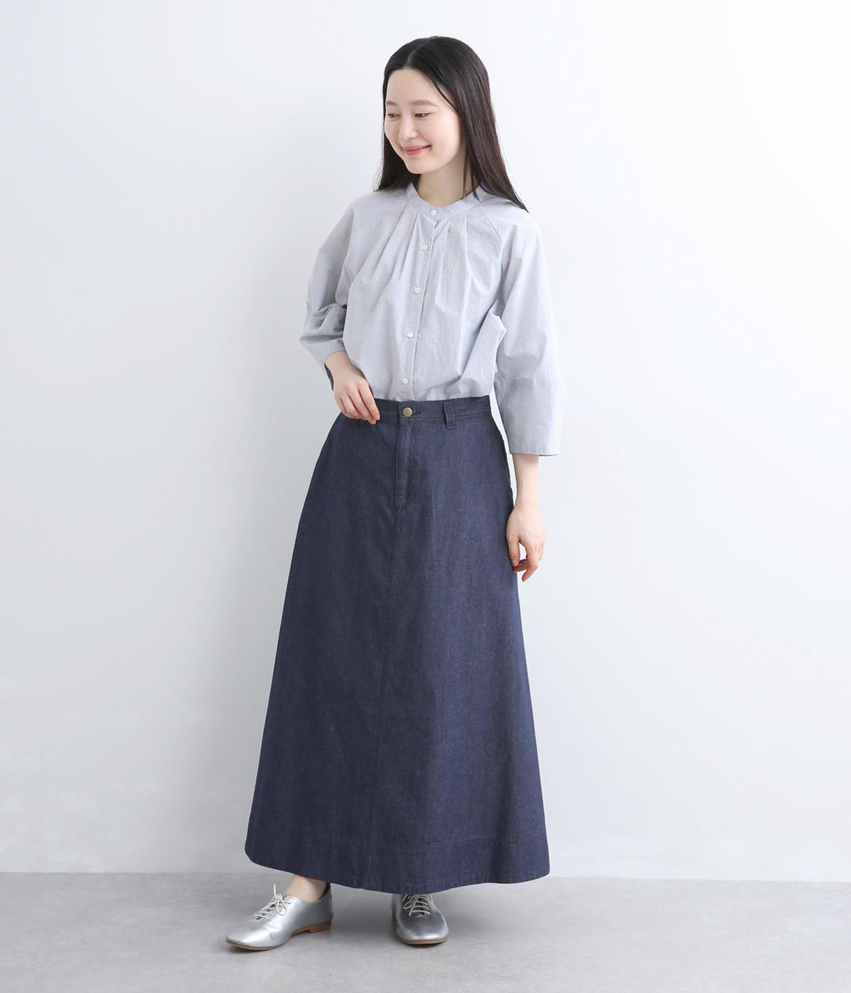 カジュアルテイストなデニム生地をフレアシルエットのロング丈で、フェミニンアイテムにアップデート。腰まわりはゆったりしながらも広がり過ぎず、同色ステッチで落ち着いた印象に。前あきで脱ぎはきしやすく、後ろウエストゴム&内紐でフィット感も◎。