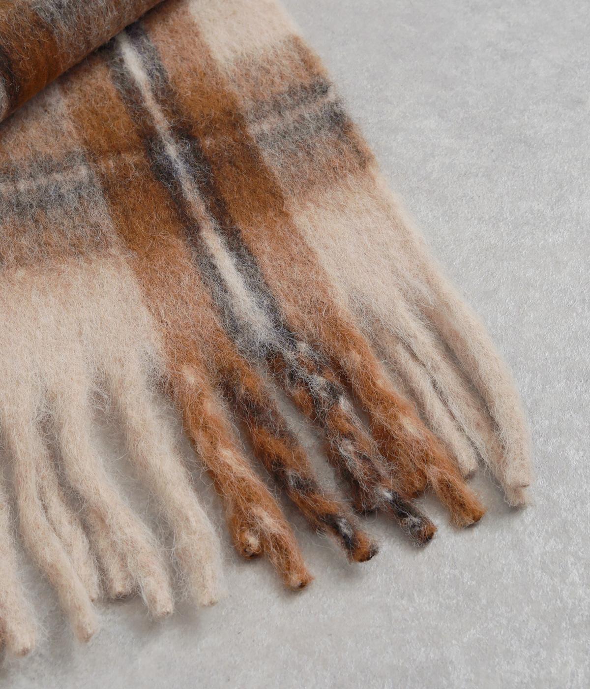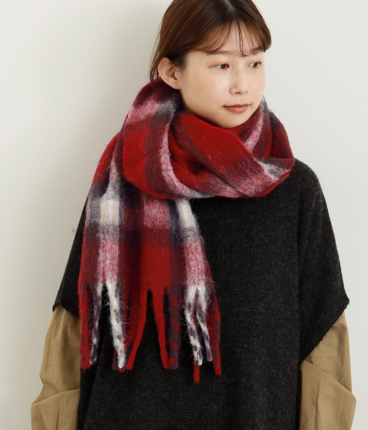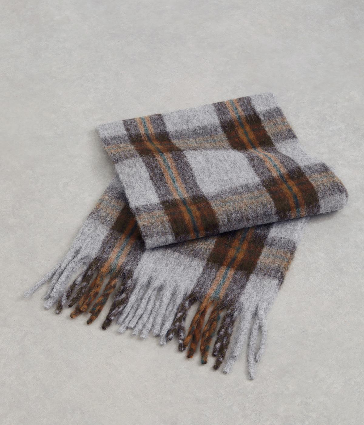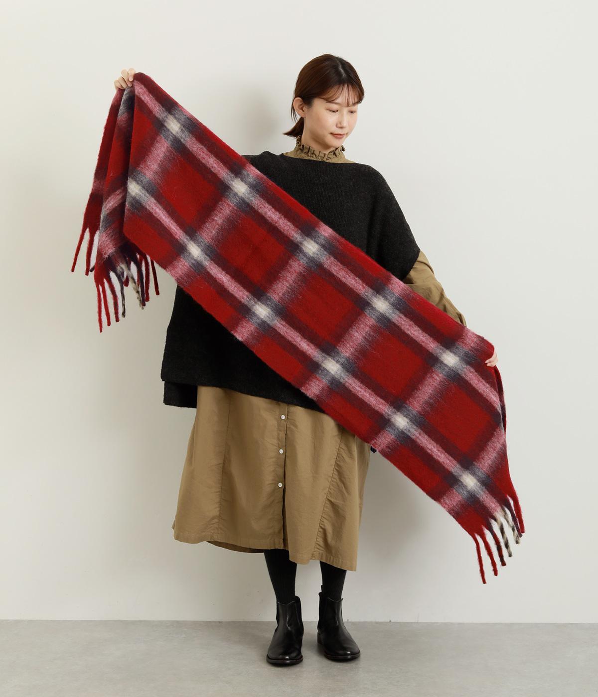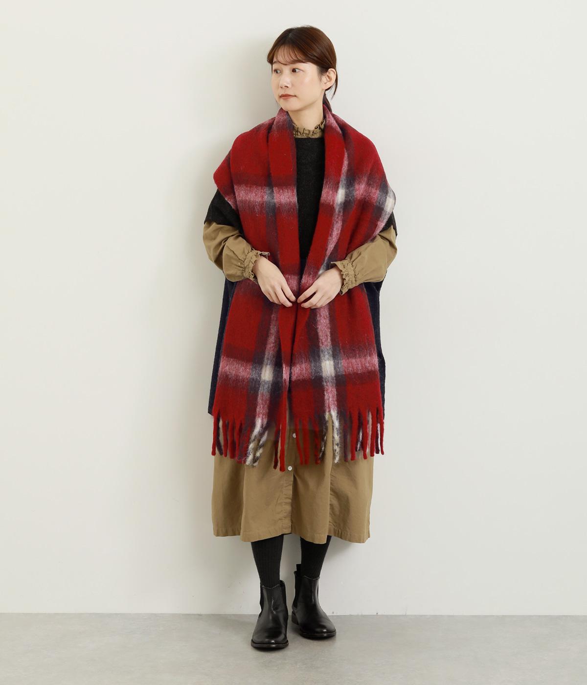 大きめのチェック柄を、やわらかくぼかした風合いで仕上げたストール。存在感がありつつ、寒い季節のコーディネートに自然となじむデザインです。肉厚な生地ならではのボリューム感があり、さらりと巻くだけで華やかさがアップします。長めのフリンジが軽さを添え、巻き方のアレンジもたのしめる一枚です。