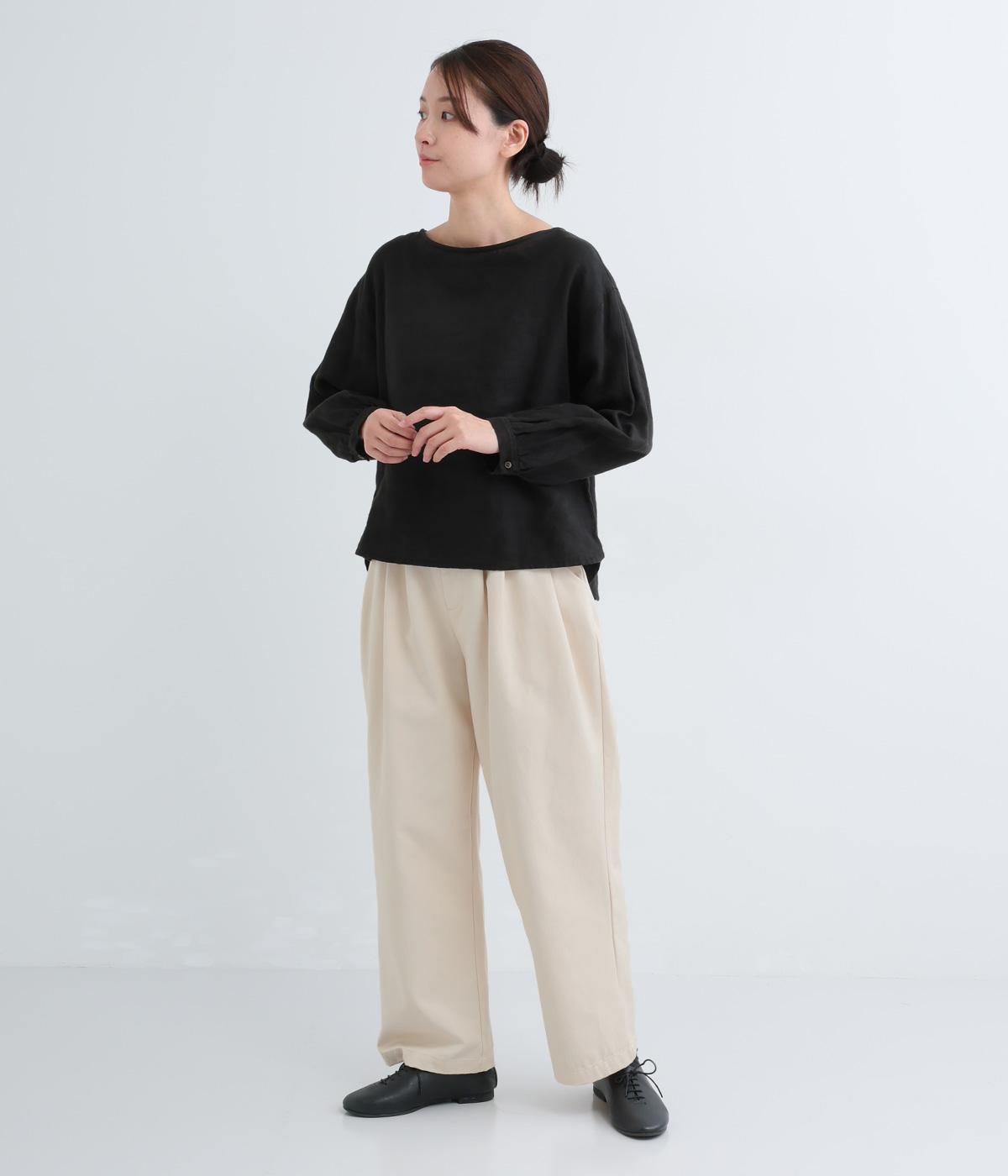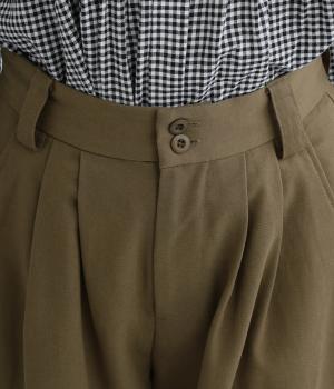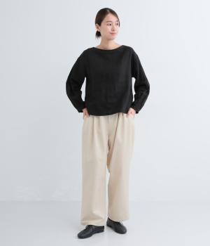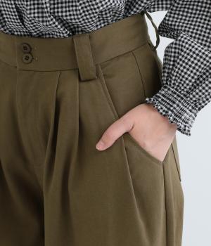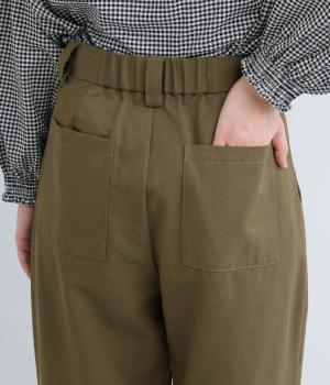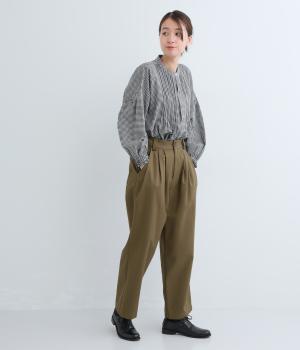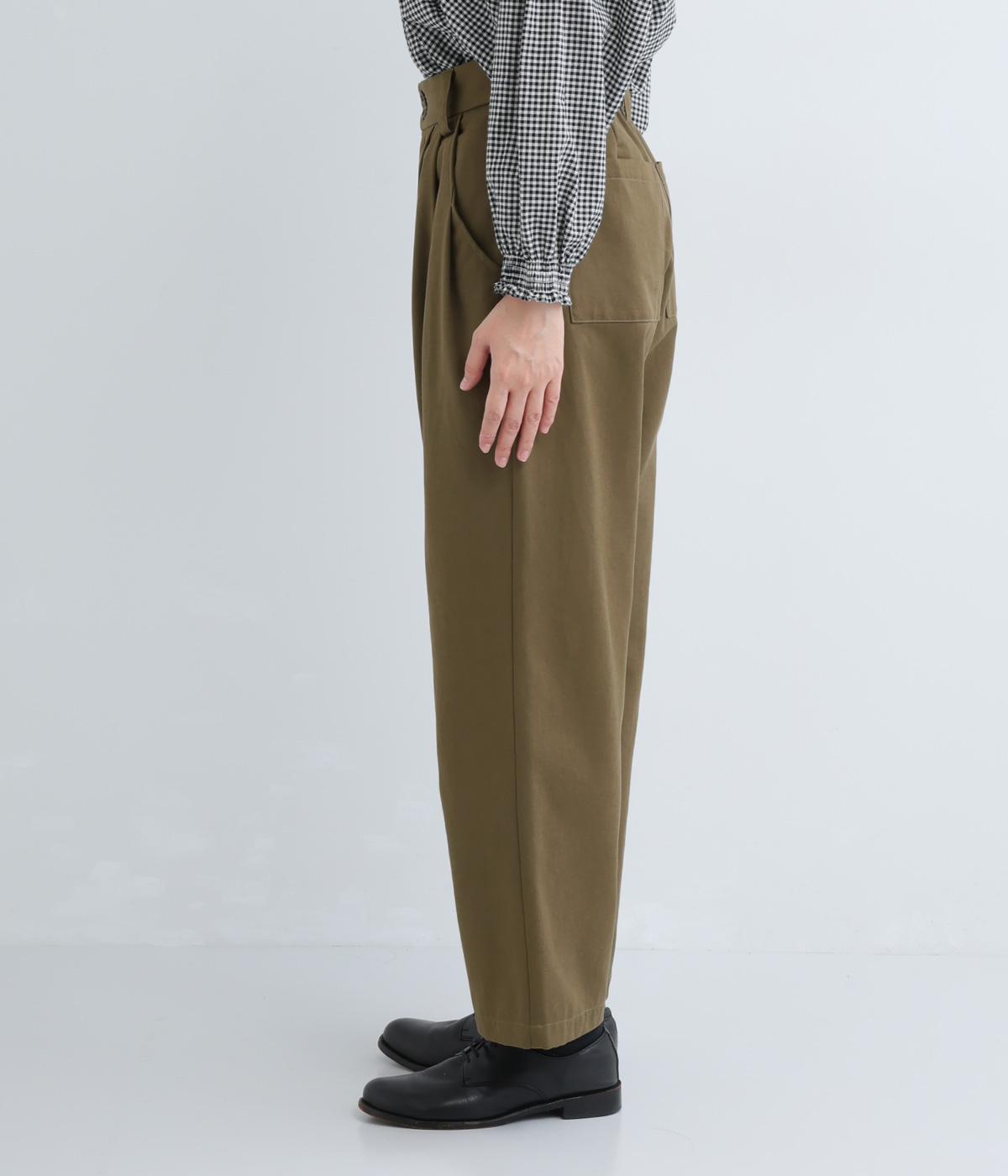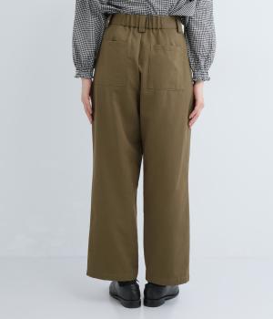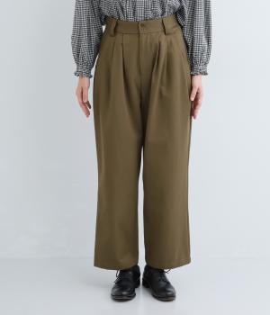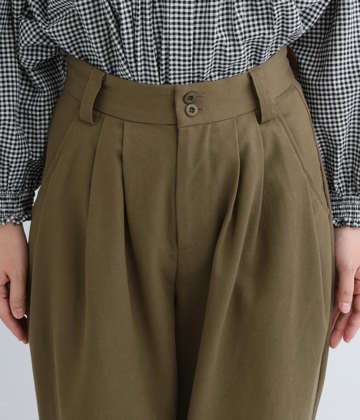 ウエストとポケット部分にタックをほどこした立体感のあるパンツです。ゆったりとしたシルエットながら、ヒップポケットや太めのベルトループですっきりと見えます。ウエストはダブルボタンとファスナー仕様で、うしろにゴムを配しました。