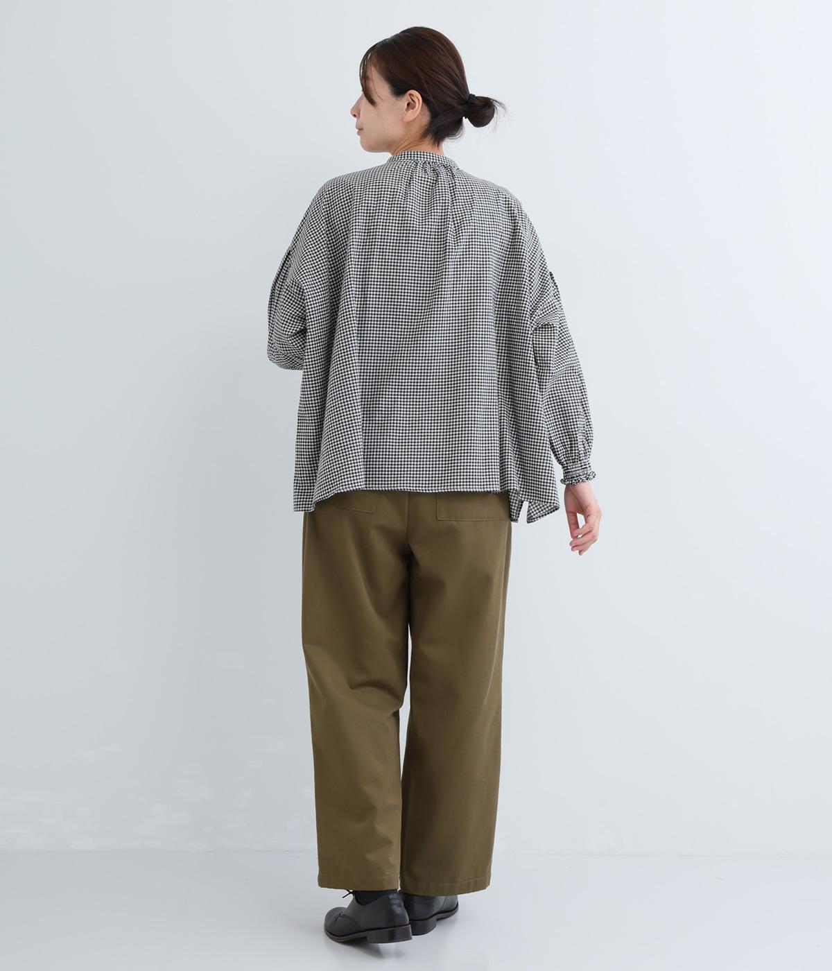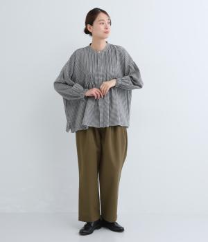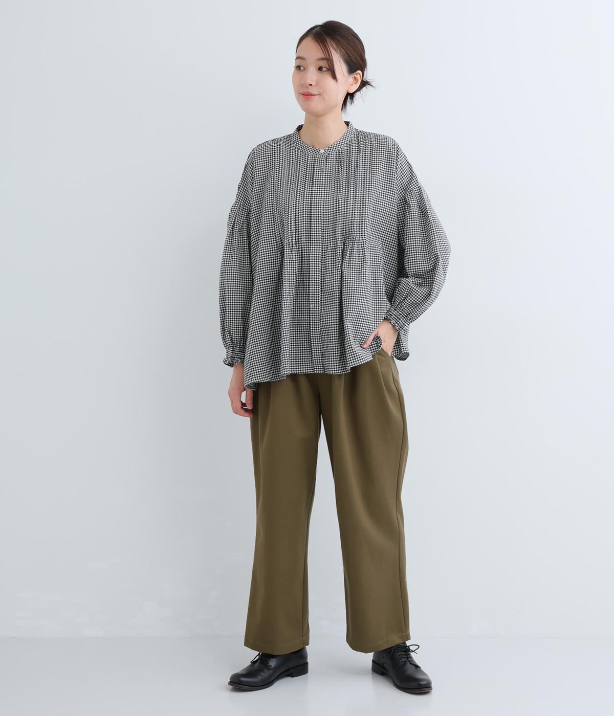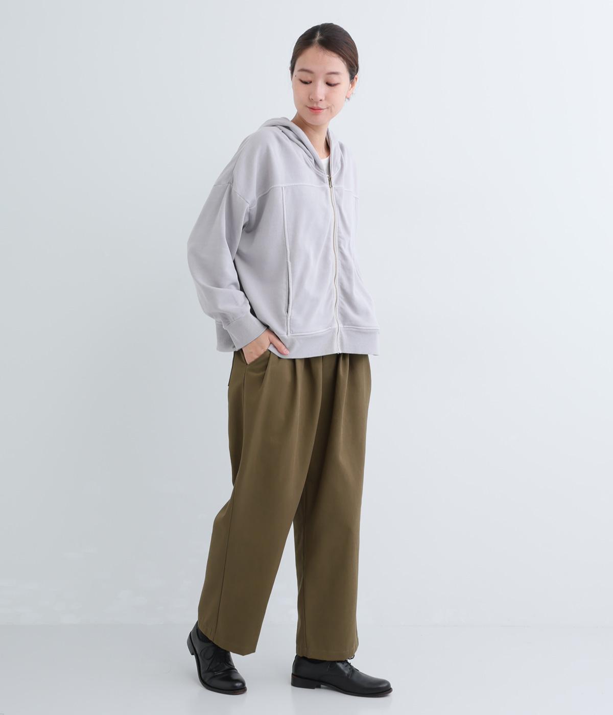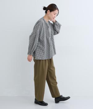 ウエストとポケット部分にタックをほどこした立体感のあるパンツです。ゆったりとしたシルエットながら、ヒップポケットや太めのベルトループですっきりと見えます。ウエストはダブルボタンとファスナー仕様で、うしろにゴムを配しました。