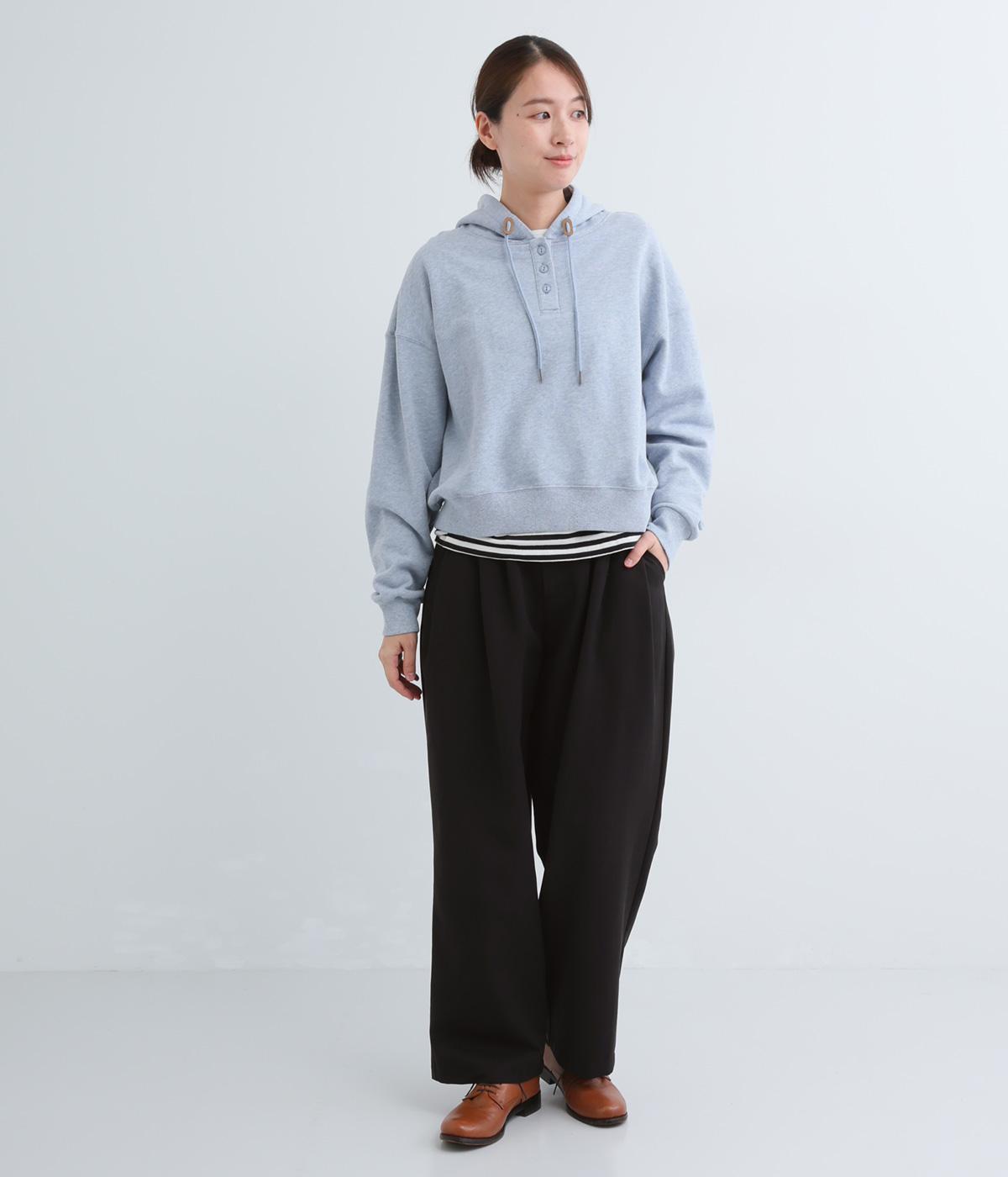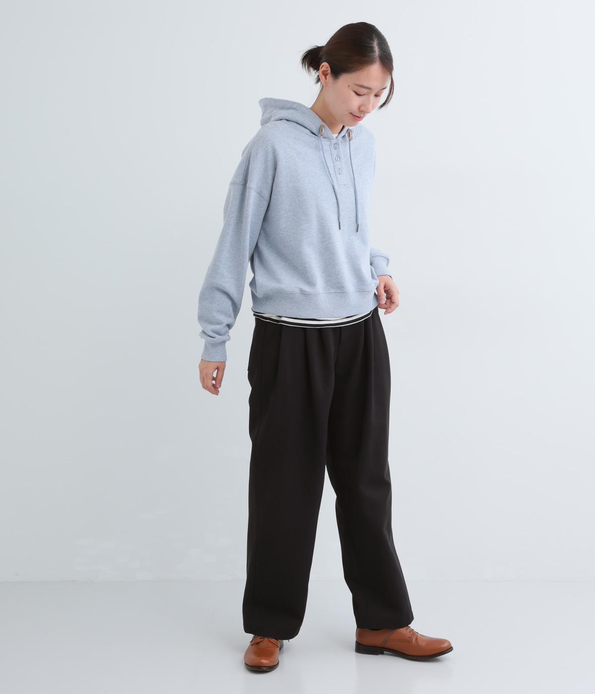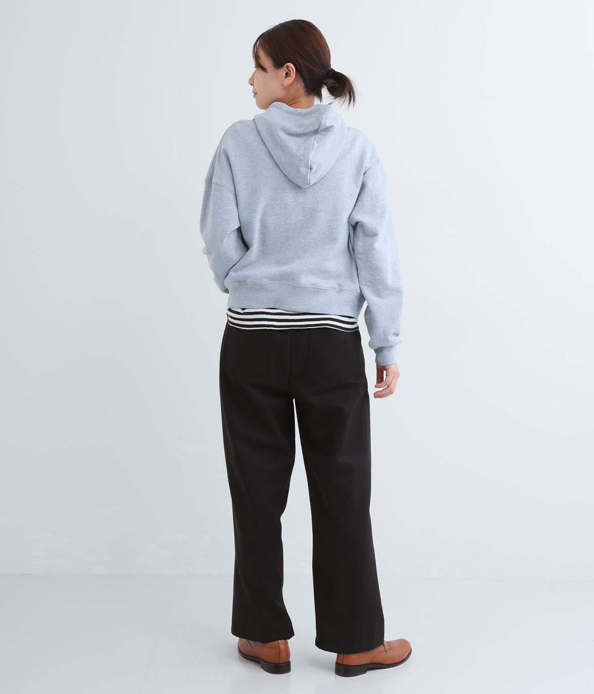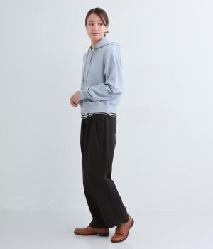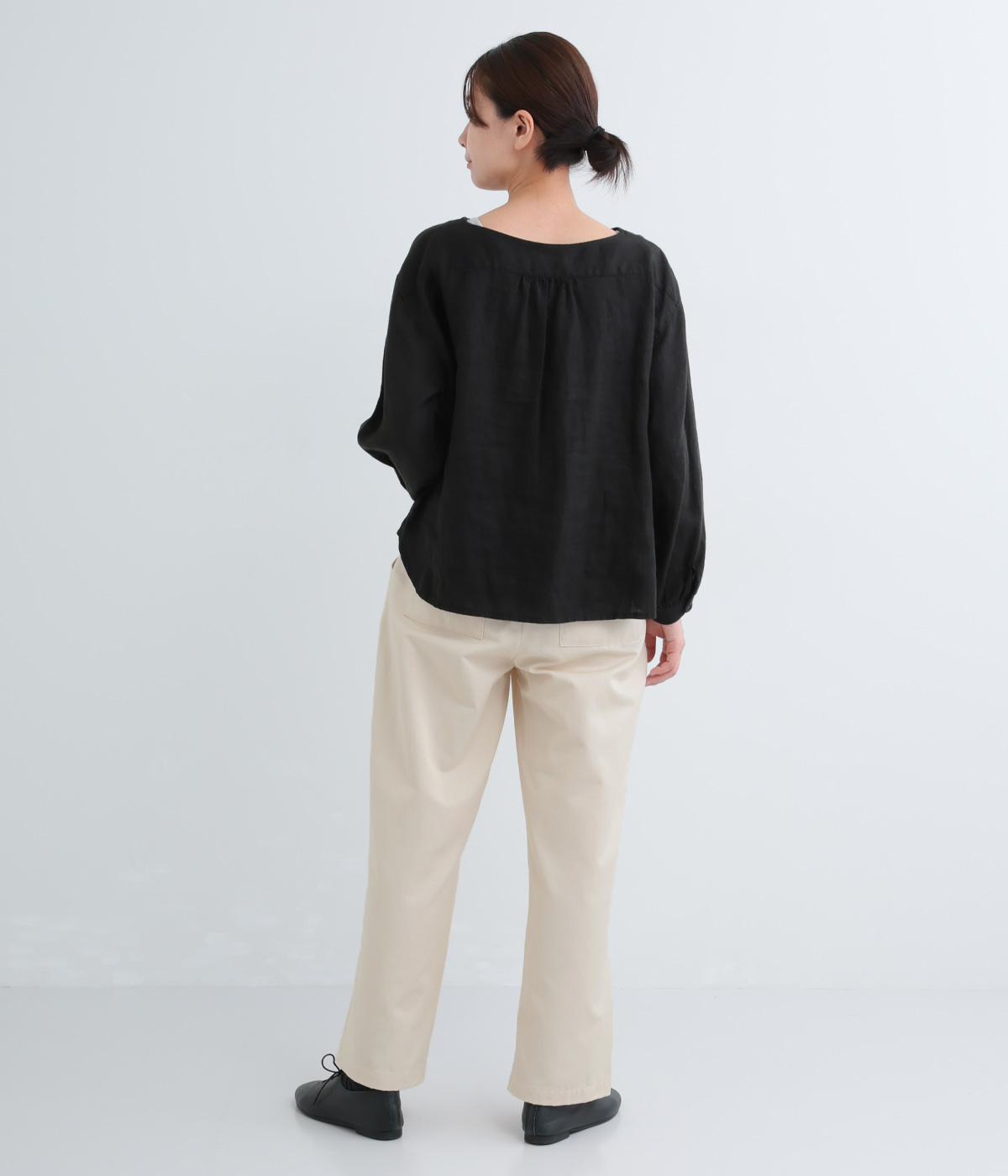 ウエストとポケット部分にタックをほどこした立体感のあるパンツです。ゆったりとしたシルエットながら、ヒップポケットや太めのベルトループですっきりと見えます。ウエストはダブルボタンとファスナー仕様で、うしろにゴムを配しました。