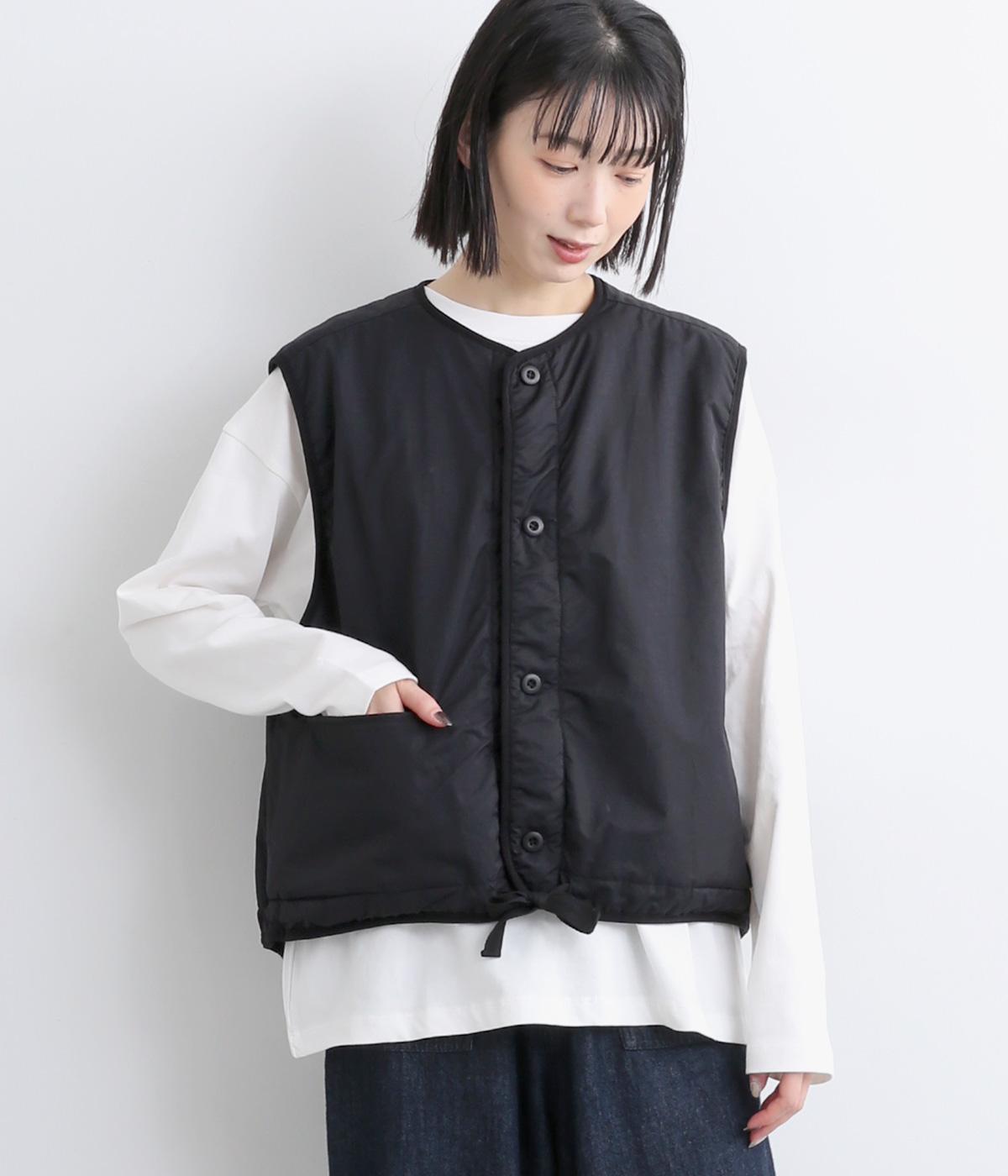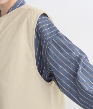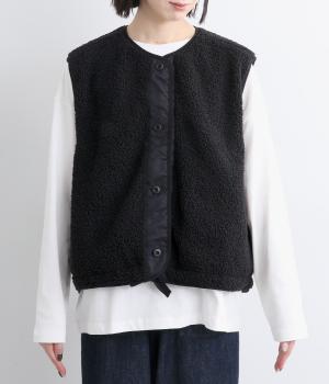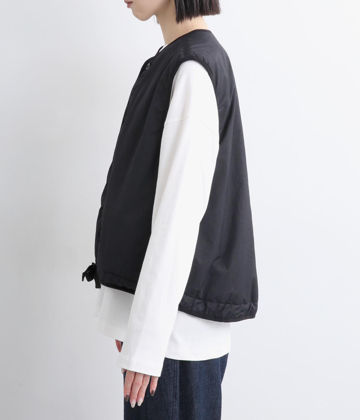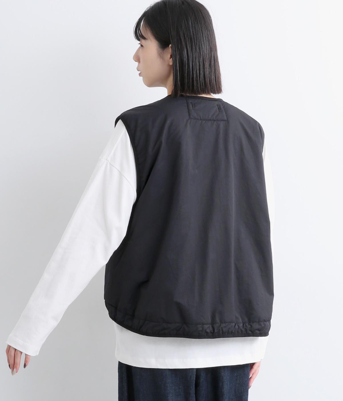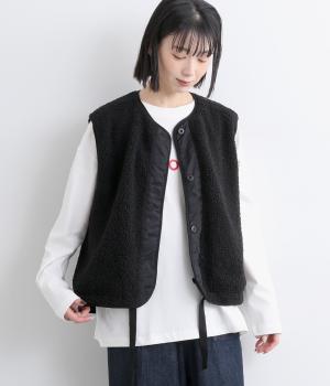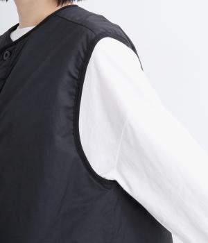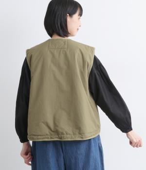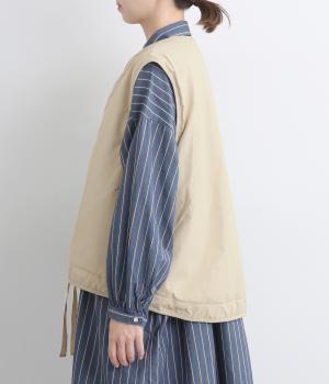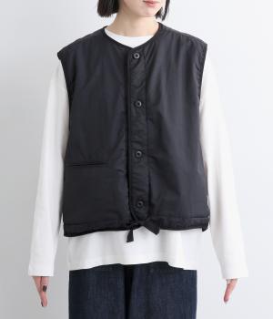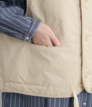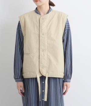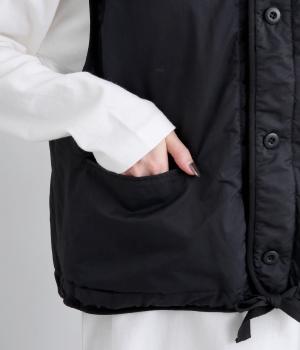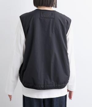 印象をがらっとチェンジできる異素材リバーシブルで着こなしのバリエーションが広がります。裾のテープをしぼると立体的なシルエットにアレンジも。コンパクトながらアームホールは大きく取っているのでさまざまなトップスと合わせられます。