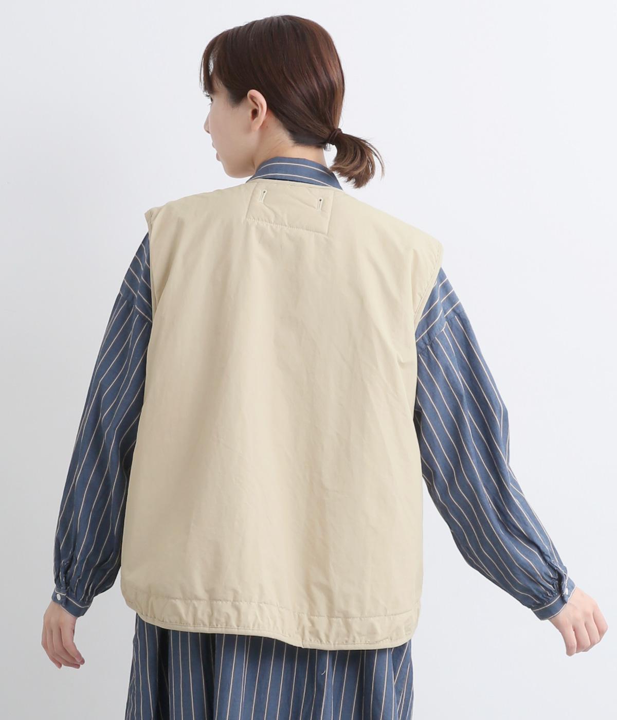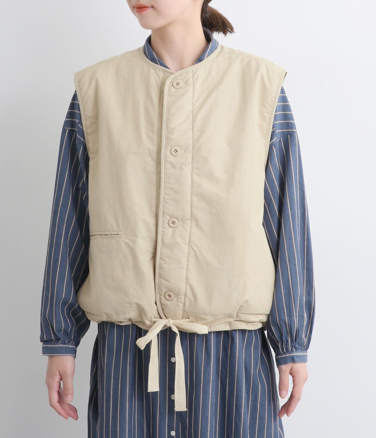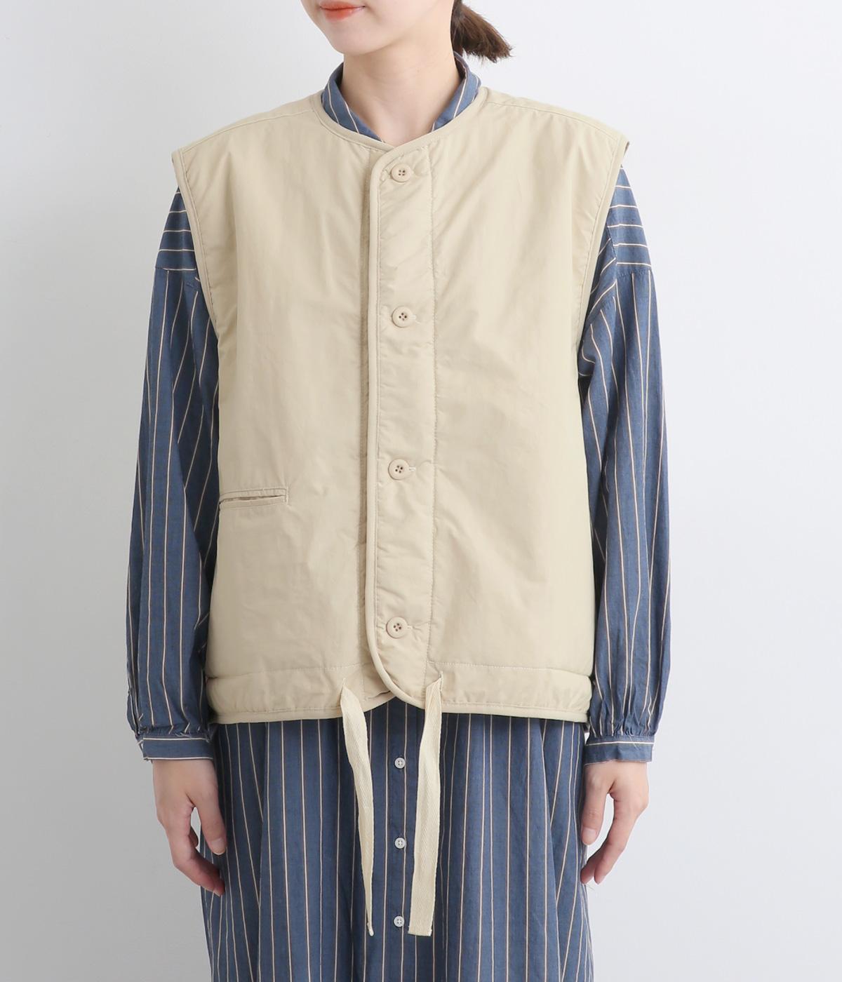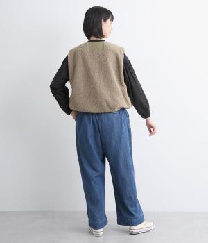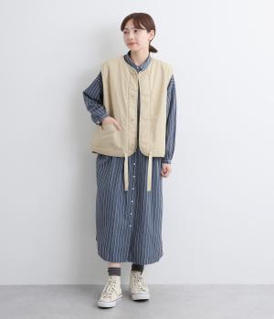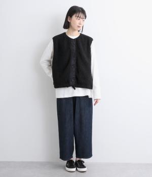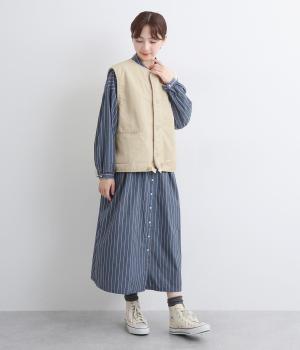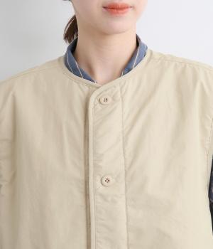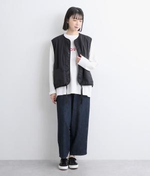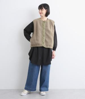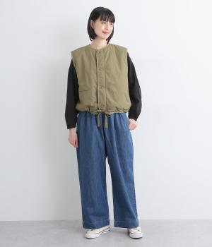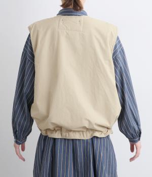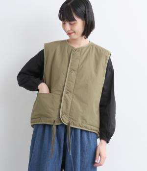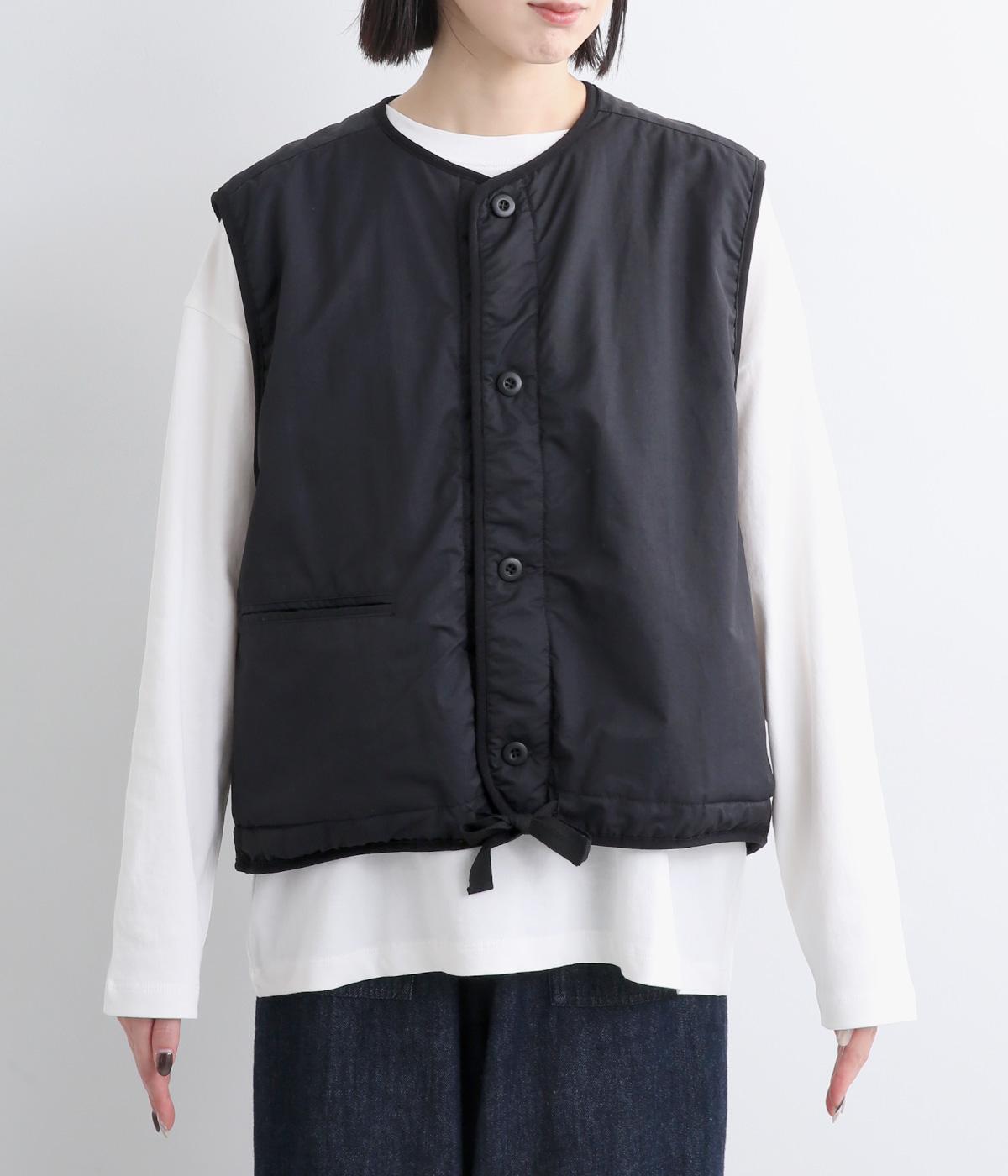 印象をがらっとチェンジできる異素材リバーシブルで着こなしのバリエーションが広がります。裾のテープをしぼると立体的なシルエットにアレンジも。コンパクトながらアームホールは大きく取っているのでさまざまなトップスと合わせられます。