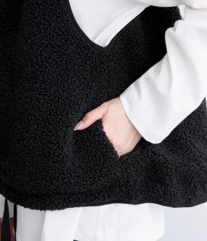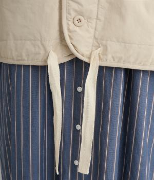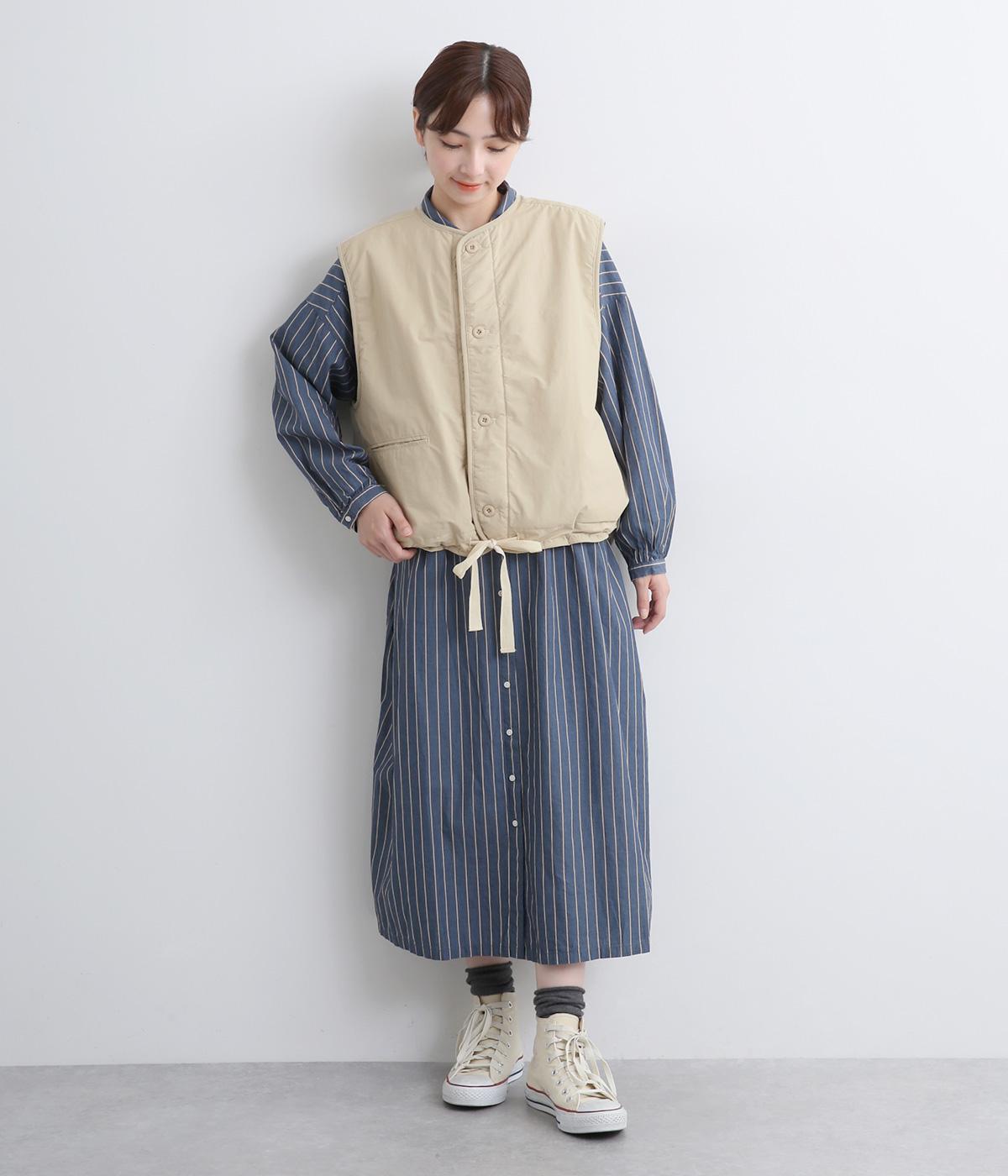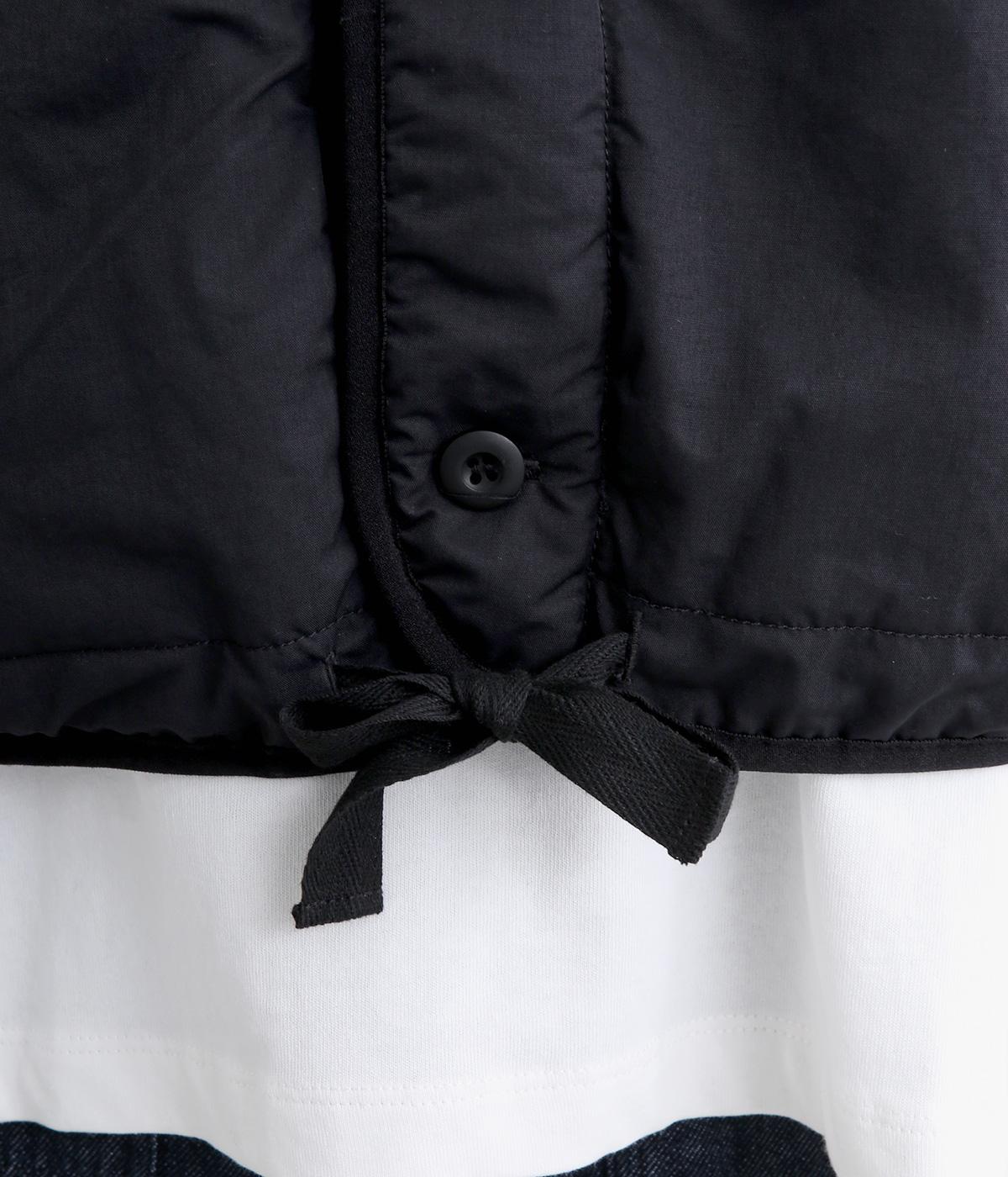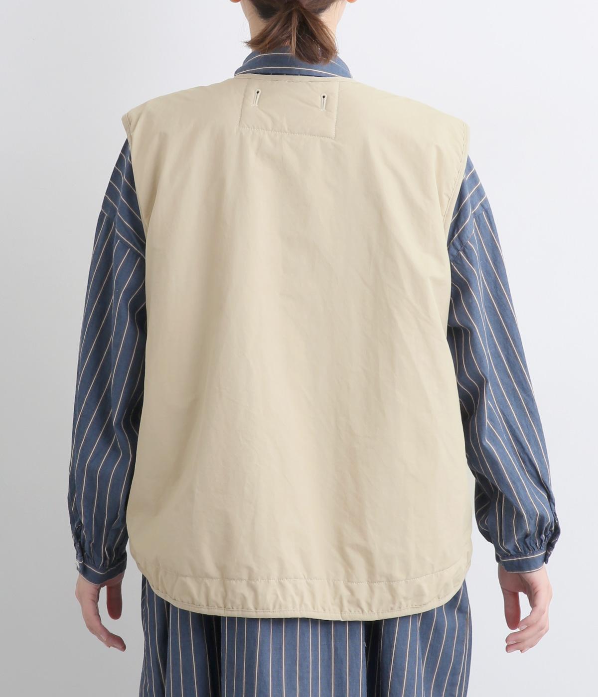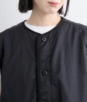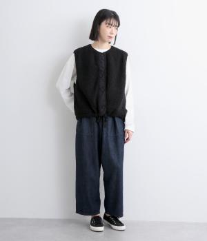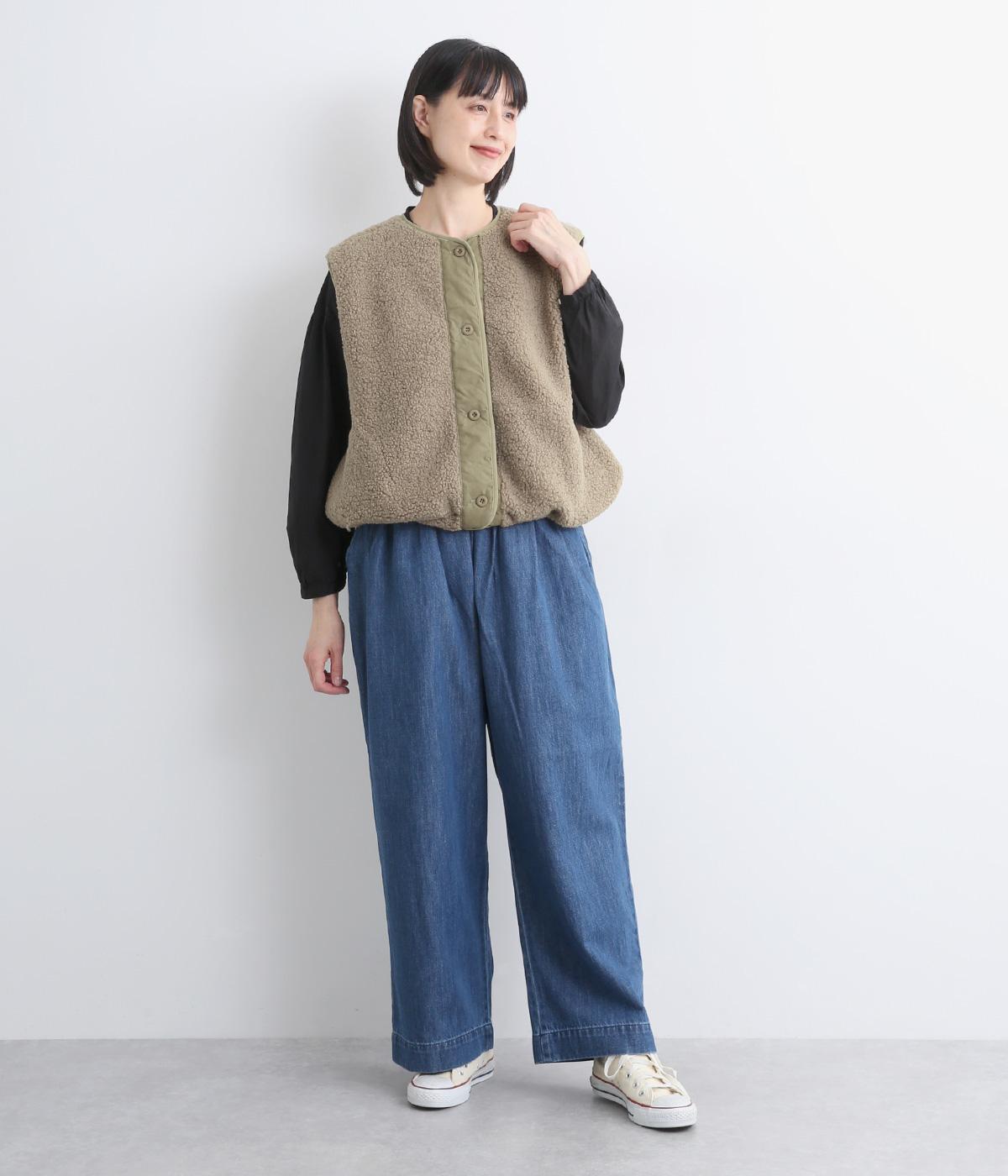 印象をがらっとチェンジできる異素材リバーシブルで着こなしのバリエーションが広がります。裾のテープをしぼると立体的なシルエットにアレンジも。コンパクトながらアームホールは大きく取っているのでさまざまなトップスと合わせられます。