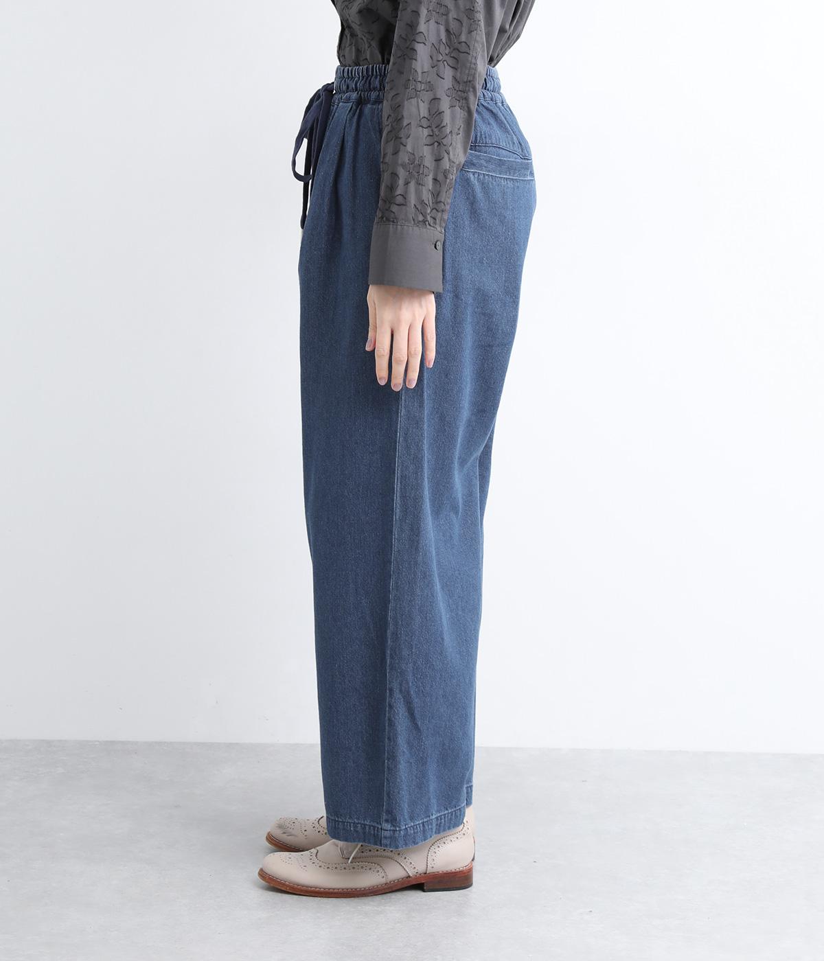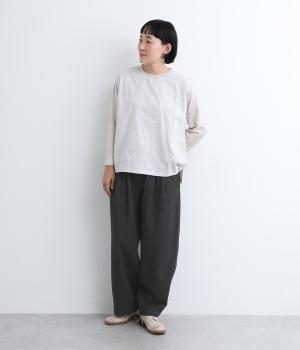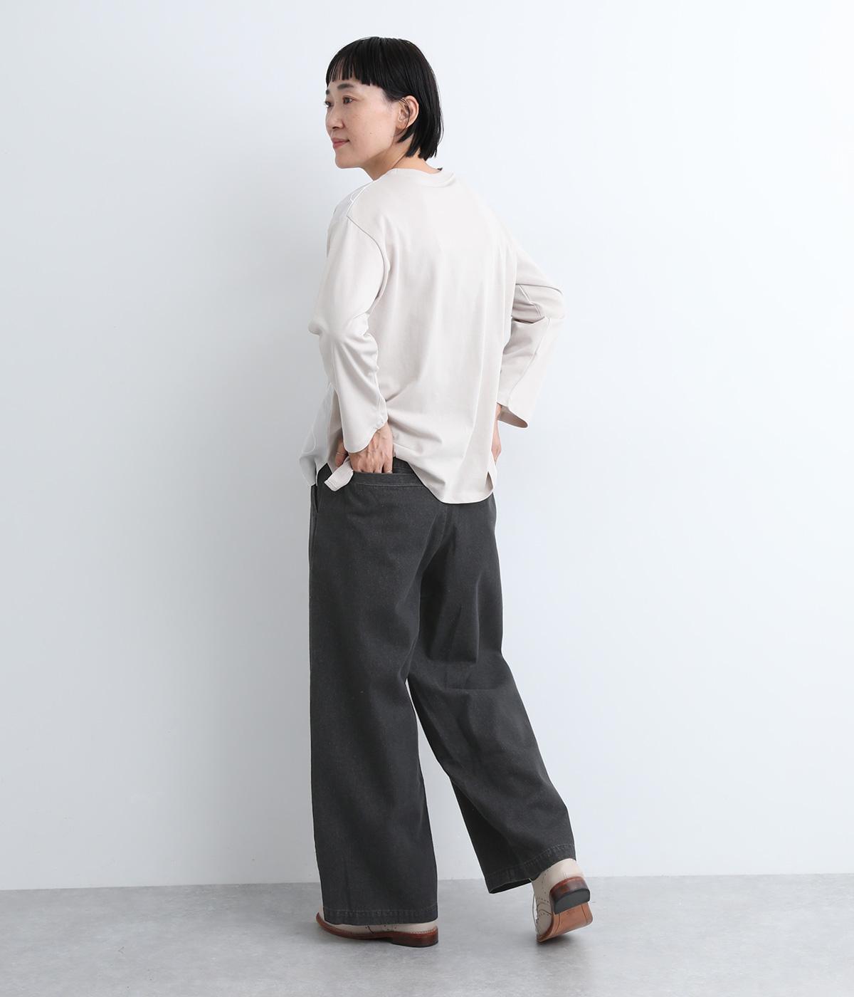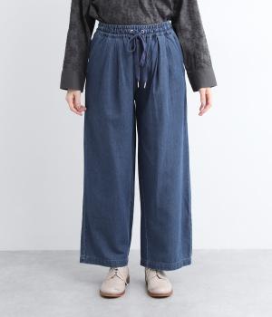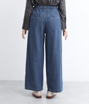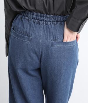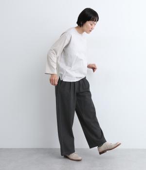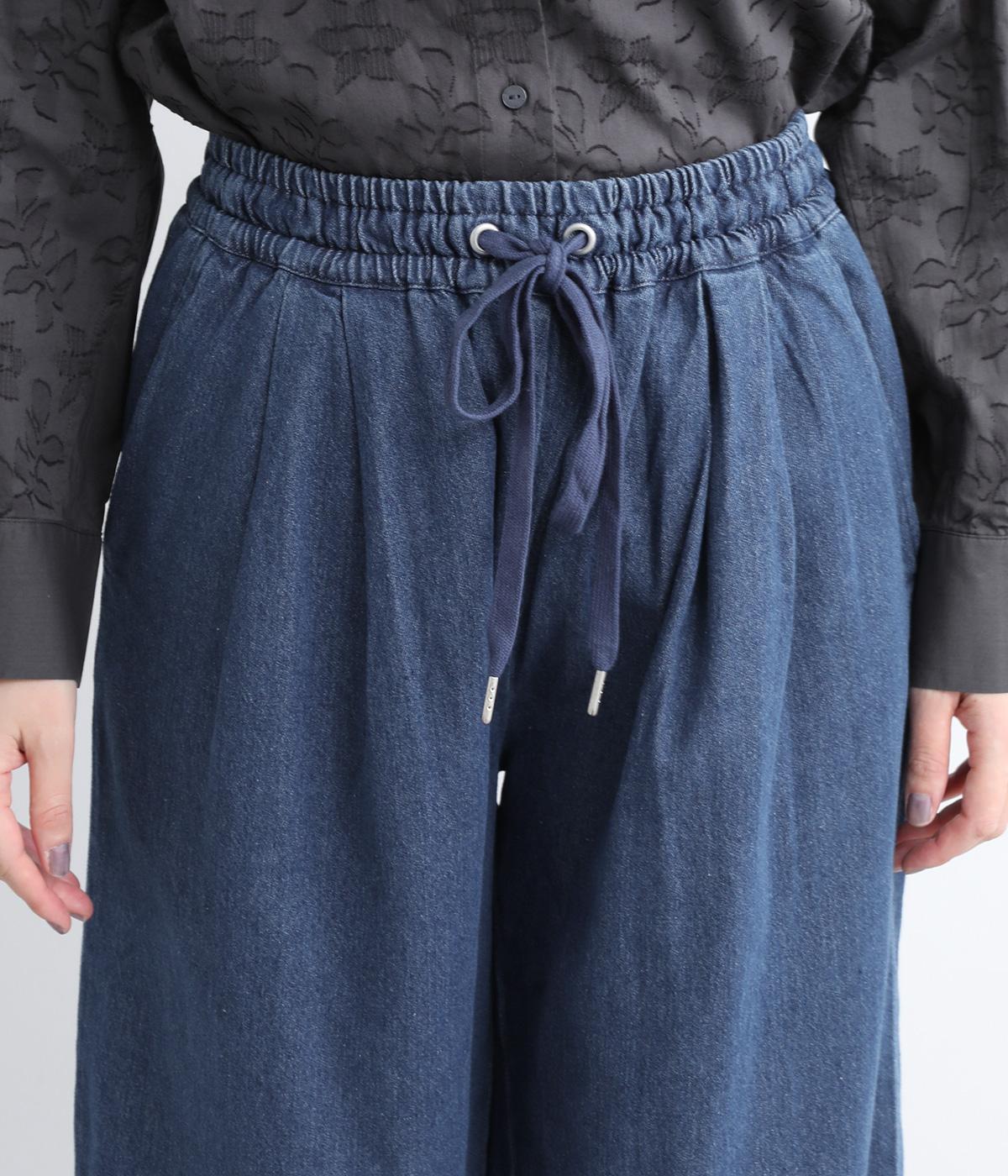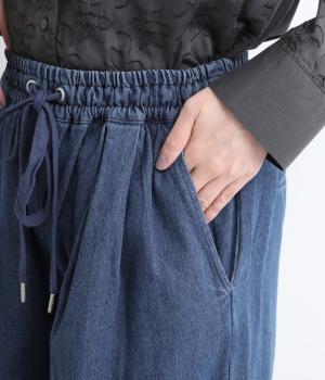 しっかりと入れたギャザーで存在感のあるワイドシルエットを描きました。足のラインを拾いにくいので、カジュアルテイストな着こなしと好相性。ウエストはオールゴムに同色のドローコートもさりげないポイントです。