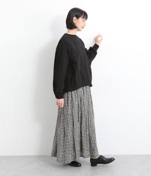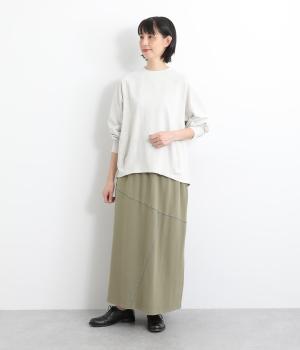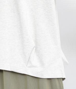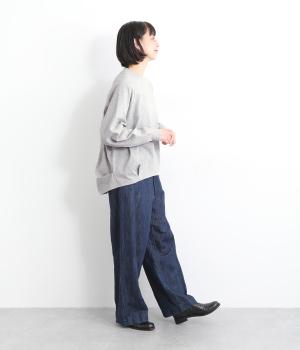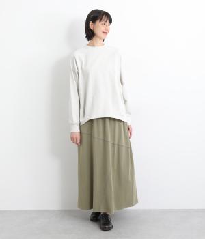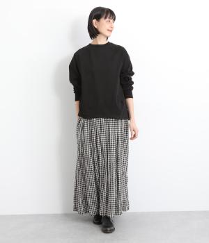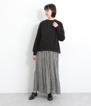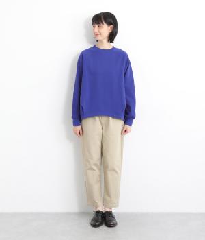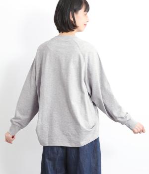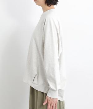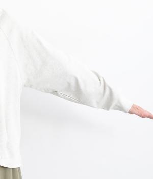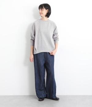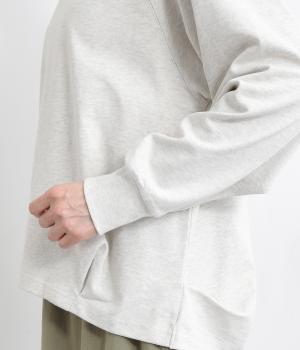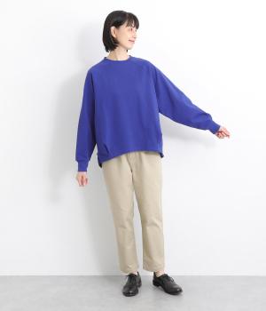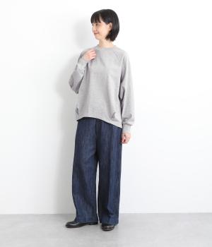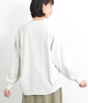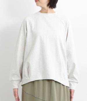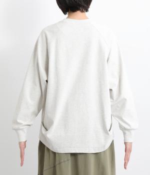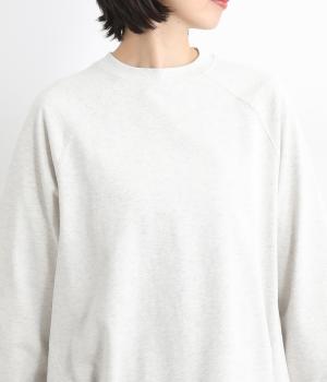 前後にタックを入れたころんとした丸いシルエットが特徴的。ラグラン切り替えで肩まわりもすっきりとして見え、詰まった首元やふわっとした袖口とのバランスも◎。定番スウェットアイテムながら目を惹く一枚です。
