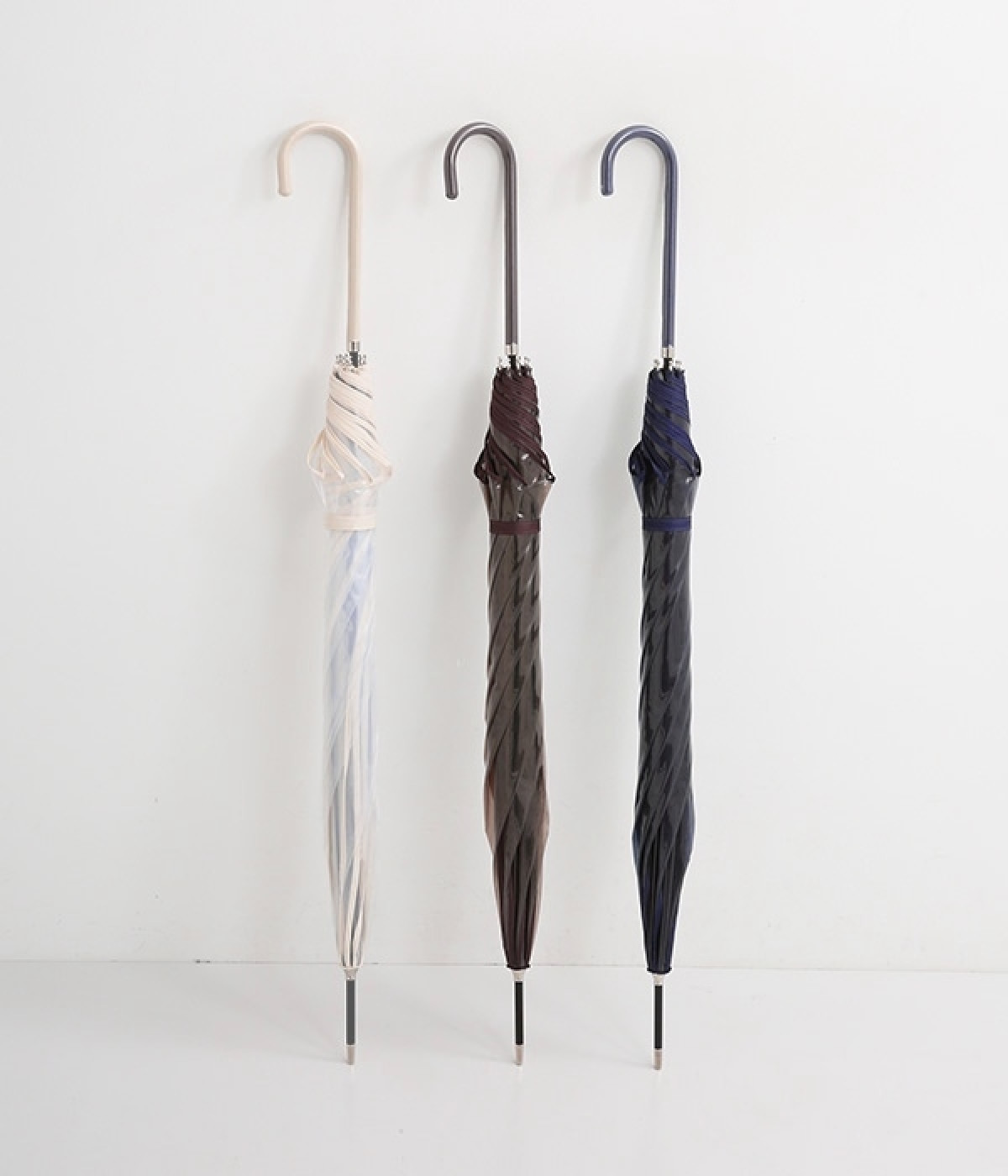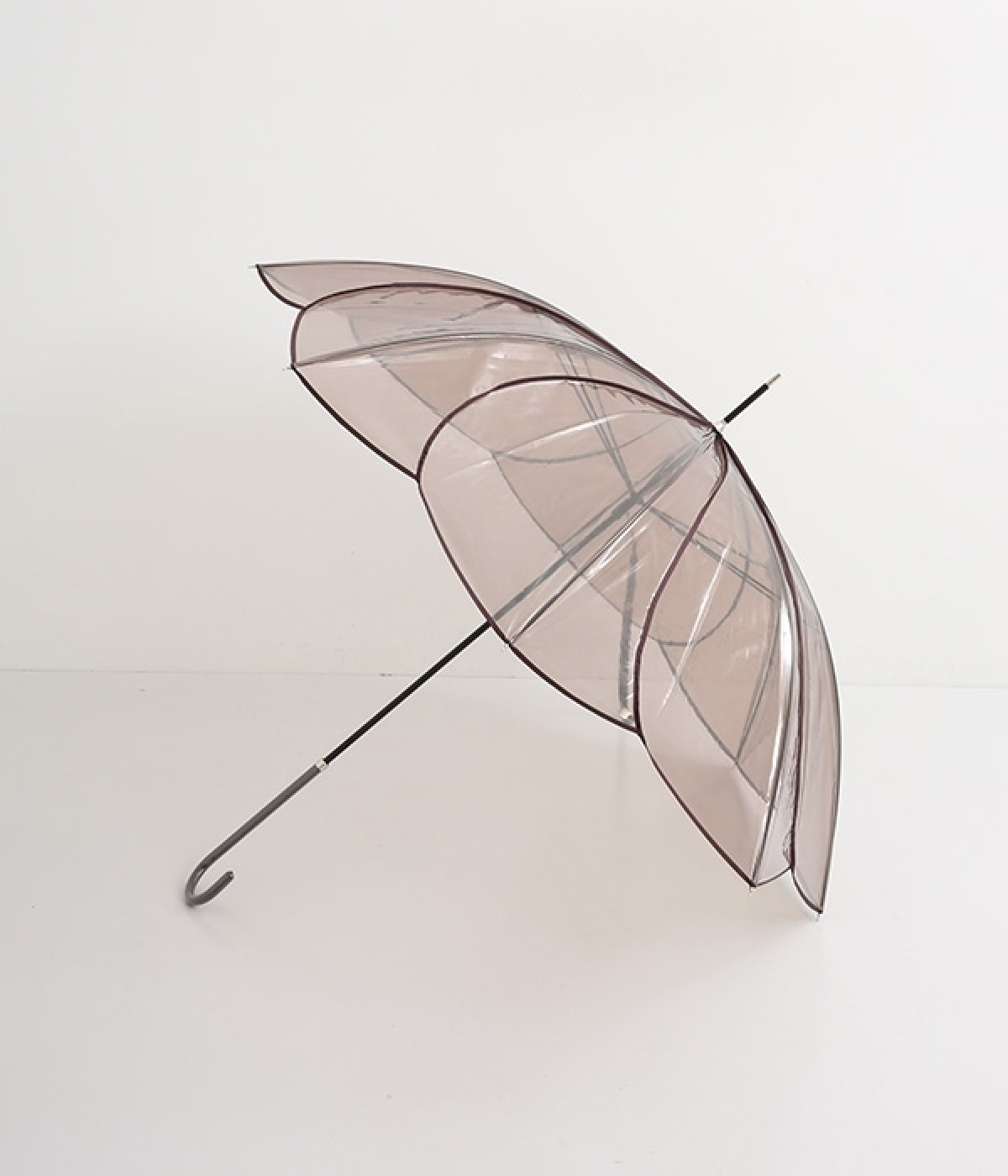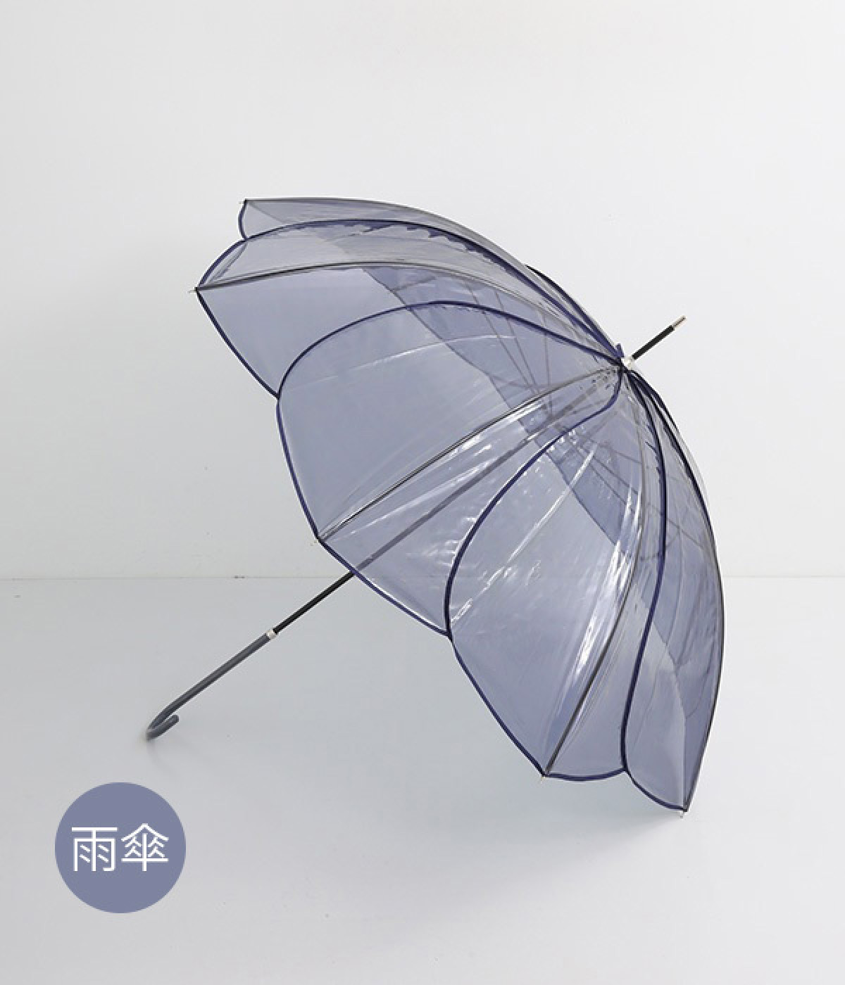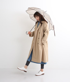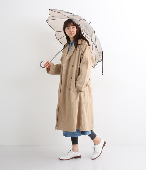 フラワーモチーフがパッと目を惹くビニール傘です。パイピングの配色がかわいらしく、シンプルながらも着こなしのアクセントになってくれます。落ち着きのあるカラーリングなのでコーディネートの邪魔をせず、そっと華やかさをプラスします。ハンドル部分は傘本体のカラーに合わせて、それぞれ異なるカラーの合皮を使用しています。