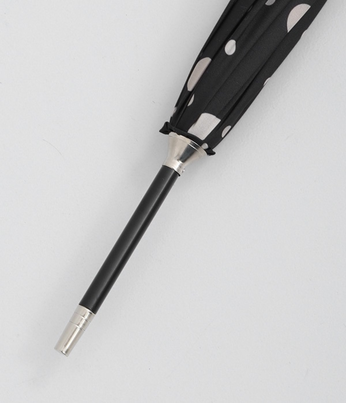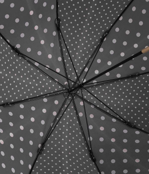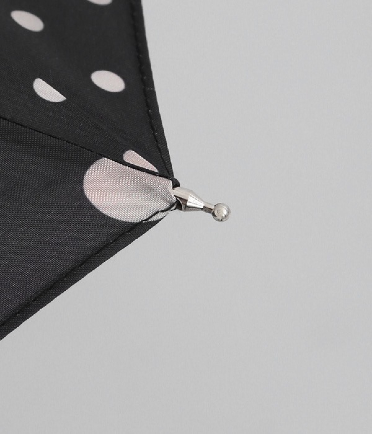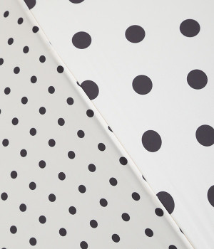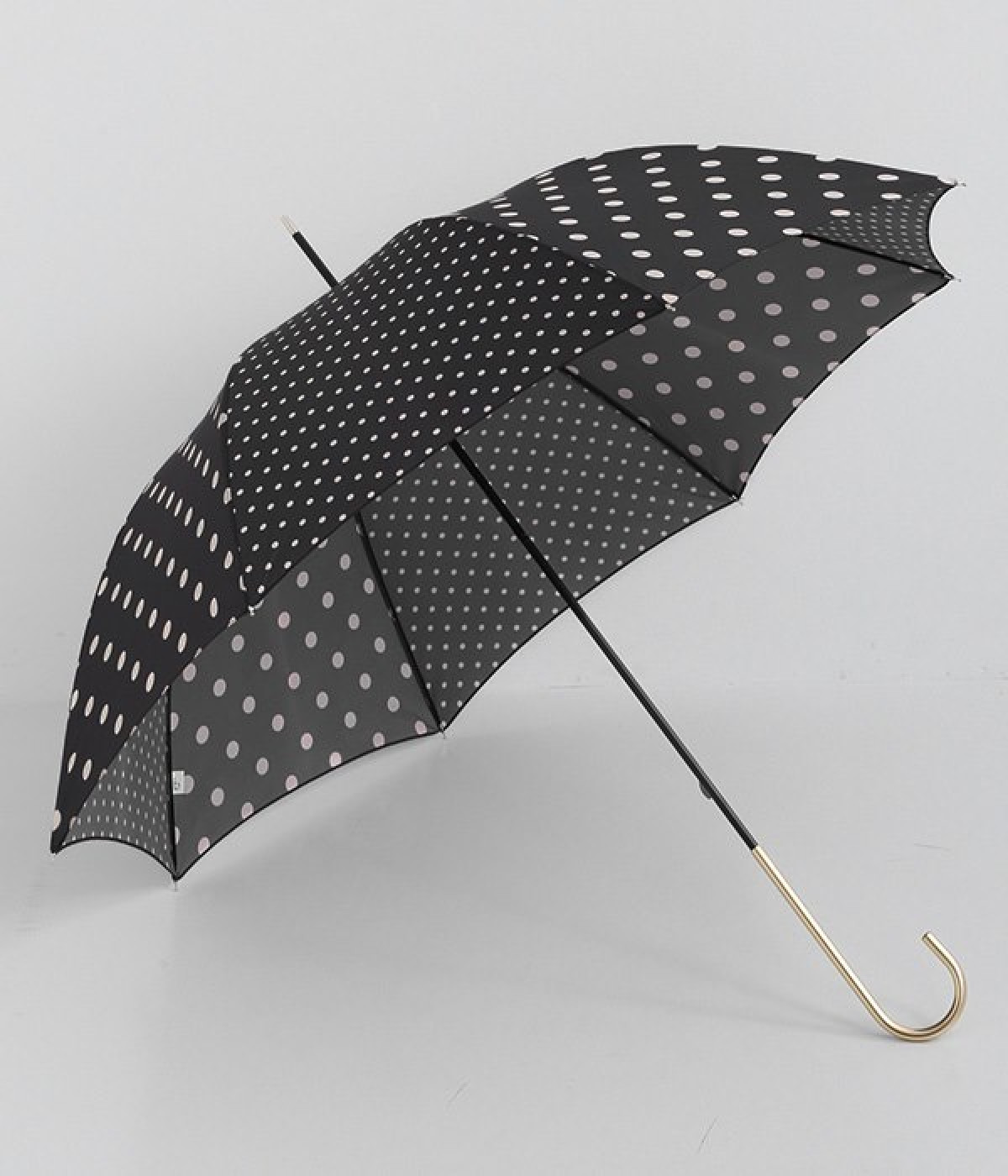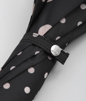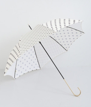 異なるサイズのドット生地を組み合わせたパネルデザインの晴雨兼用の傘です。折り畳んだときにはスッとした細みのシルエットが華奢な印象を与え、持ち歩く姿もスマートです。つやめくメタルカラーの上品なハンドルも握りやすいようにスリムに。フェミニンな装いのときにはもちろん、カジュアルな装いのときでも適度な甘さをプラスします。