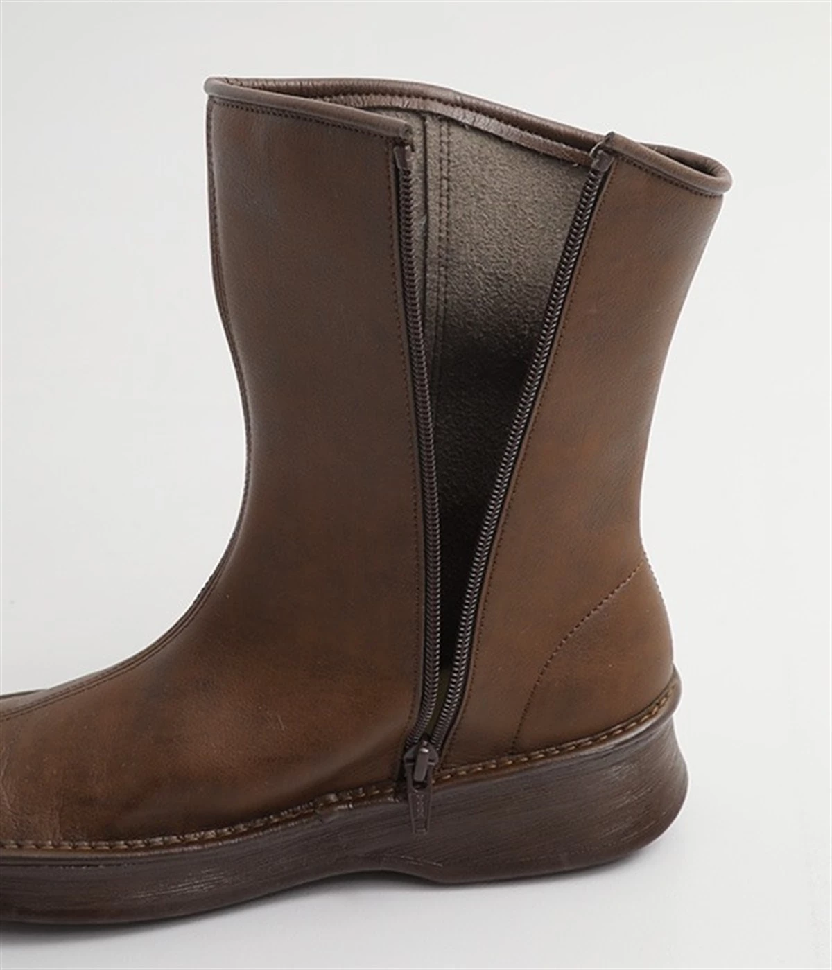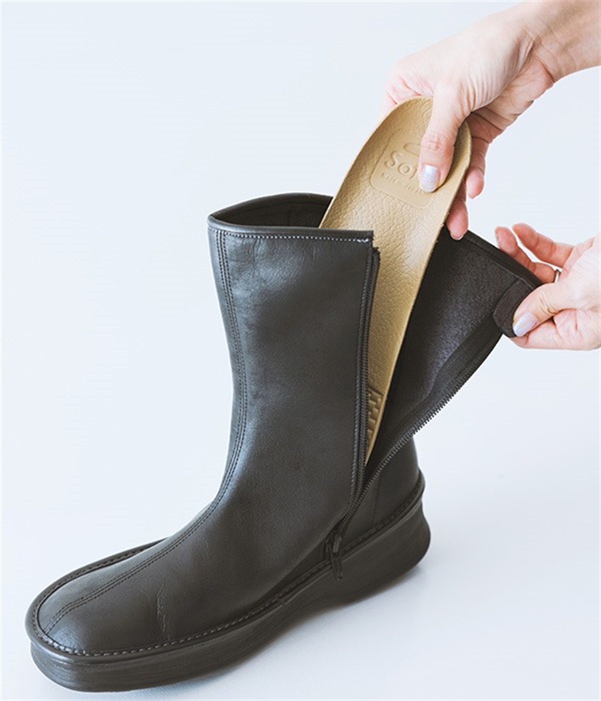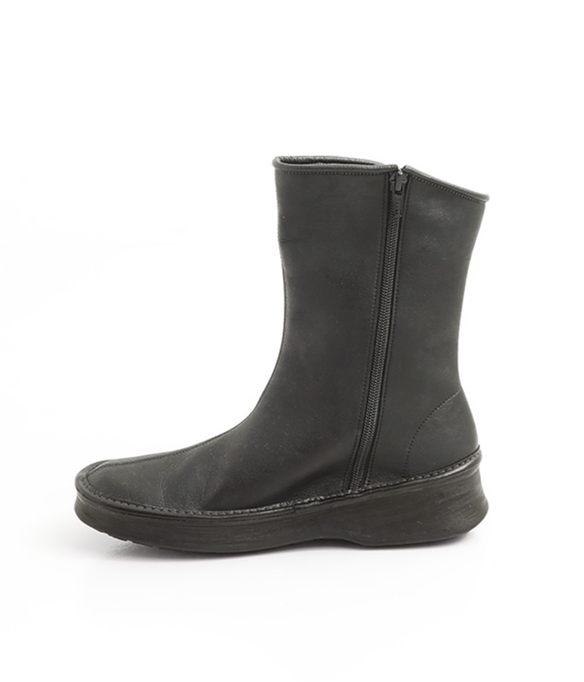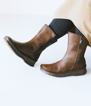 超軽量&超柔らかなサイドジップ付きの、脱ぎ履きもラクチンなブーツです。特許取得製法のドーム製法で仕立てた、歩くたびに足袋のように足にフィットする柔軟性の良さと快適な履き心地が魅力的。ムラ感のある風合いの良いヴィーガンレザーを採用し独特の雰囲気を表現しています。高反発のコンフォートインソール入りで疲れにくいので、立ち仕事や旅行にもおすすめです。