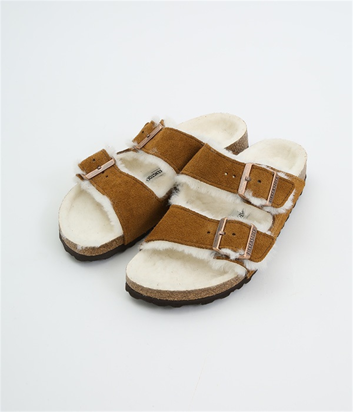 超高級スエードレザーを使用した大人の装いにマッチするサンダル。天然ラムスキンボアで覆われた中敷きとストラップのライニングが、おしゃれにあたたかく足元を包みます。カジュアルからきれいめミックスのスタイルまで幅広く合わせやすいデザイン。タイツやソックスなどと合わせて履くのもおすすめです。金属製のバックルにより自由にフィット感を調整できるダブルストラップ仕様で、甲高の方も安心です。