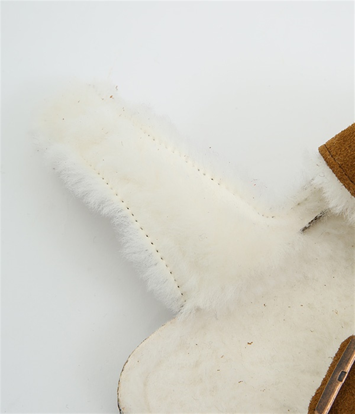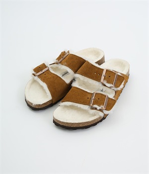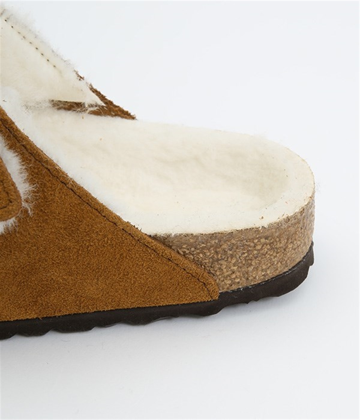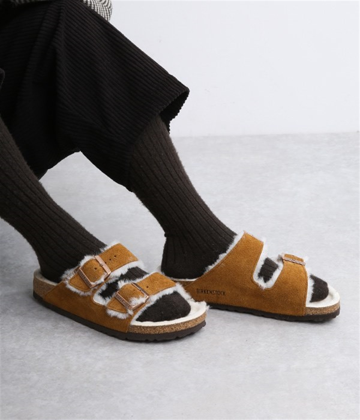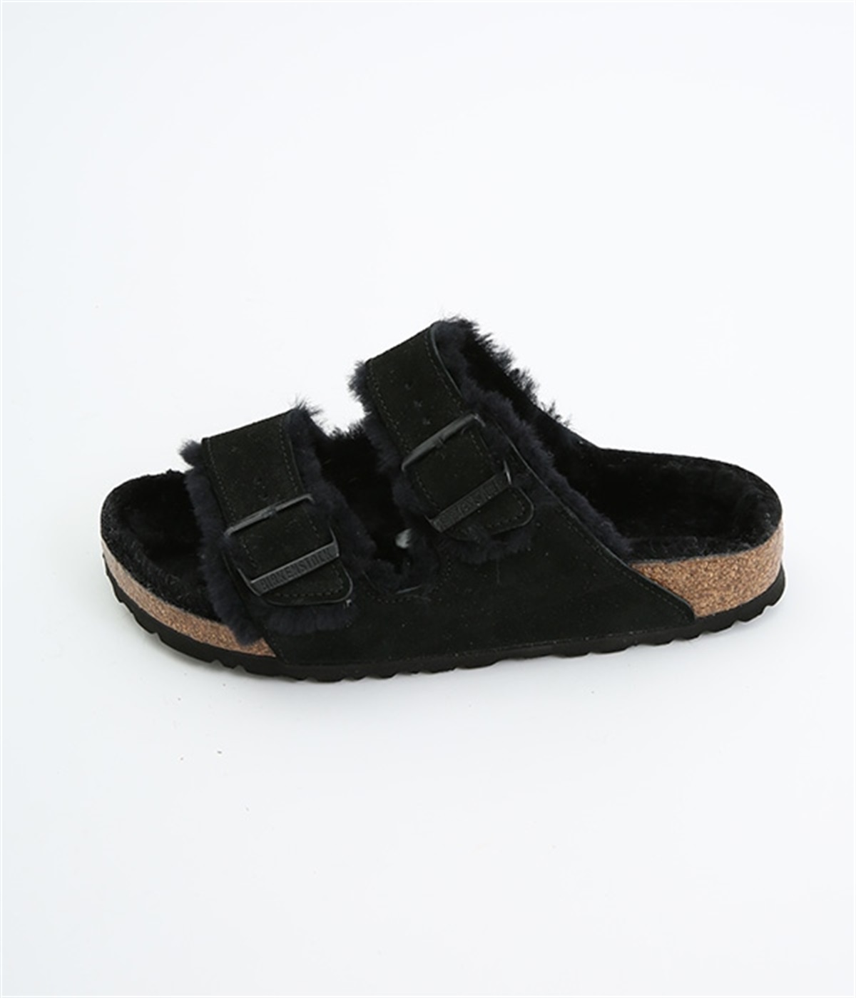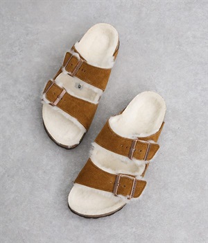 超高級スエードレザーを使用した大人の装いにマッチするサンダル。天然ラムスキンボアで覆われた中敷きとストラップのライニングが、おしゃれにあたたかく足元を包みます。カジュアルからきれいめミックスのスタイルまで幅広く合わせやすいデザイン。タイツやソックスなどと合わせて履くのもおすすめです。金属製のバックルにより自由にフィット感を調整できるダブルストラップ仕様で、甲高の方も安心です。