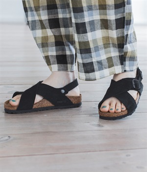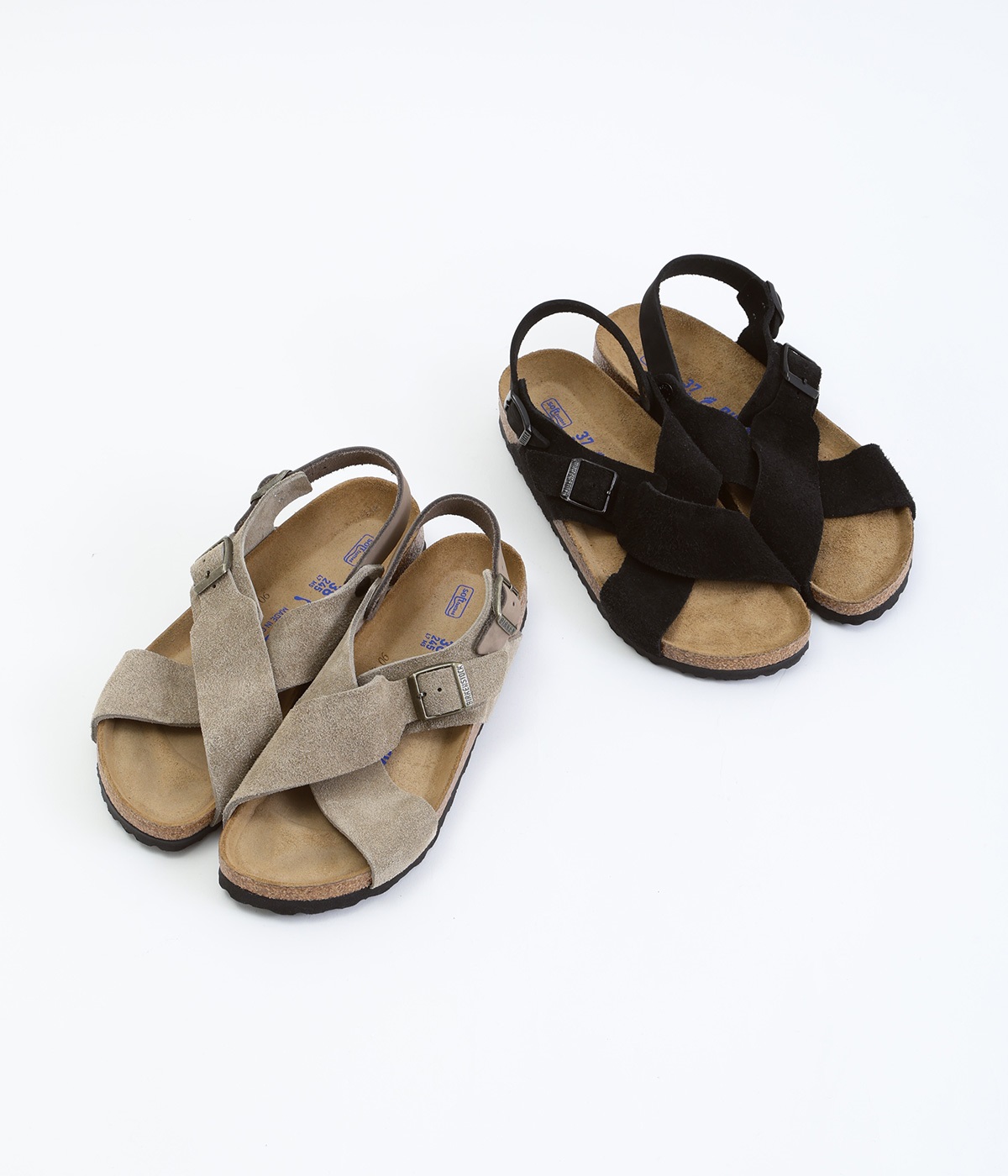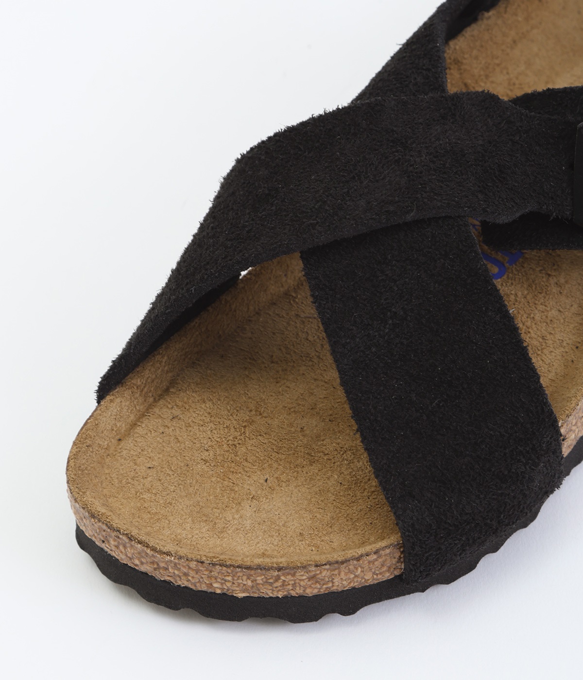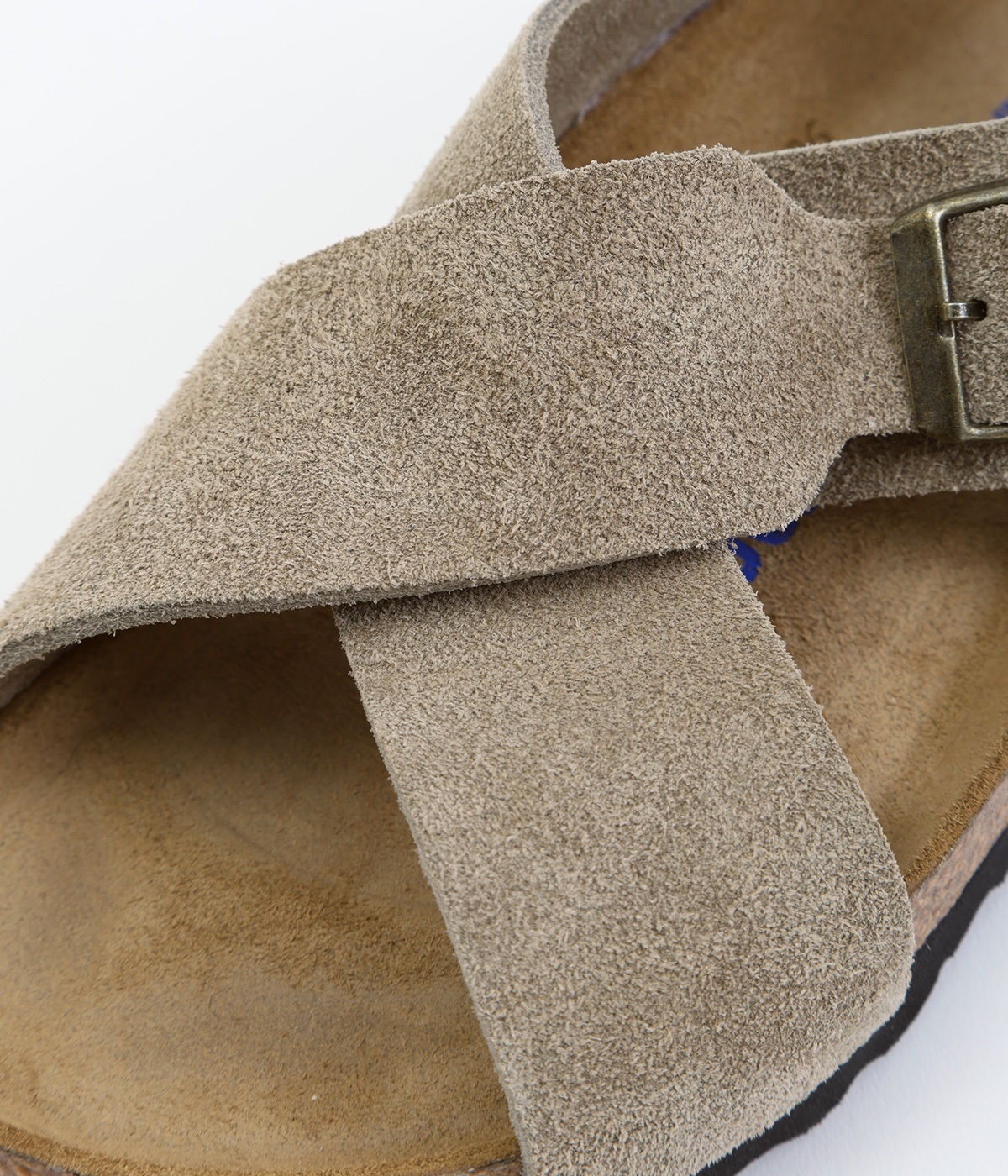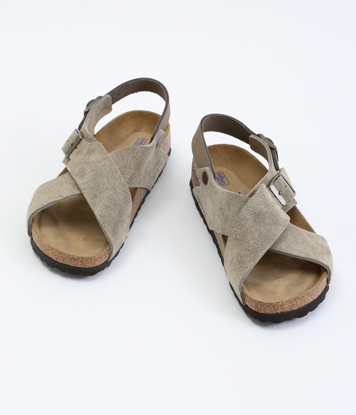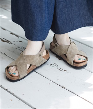 足元に適度な抜け感を作るクロスデザインは、バックストラップとともにベルテッド仕様になっていてフィット感の調節が可能。素足ではくのはもちろん、ソックスとのコーディネートでおしゃれの幅が広がります。