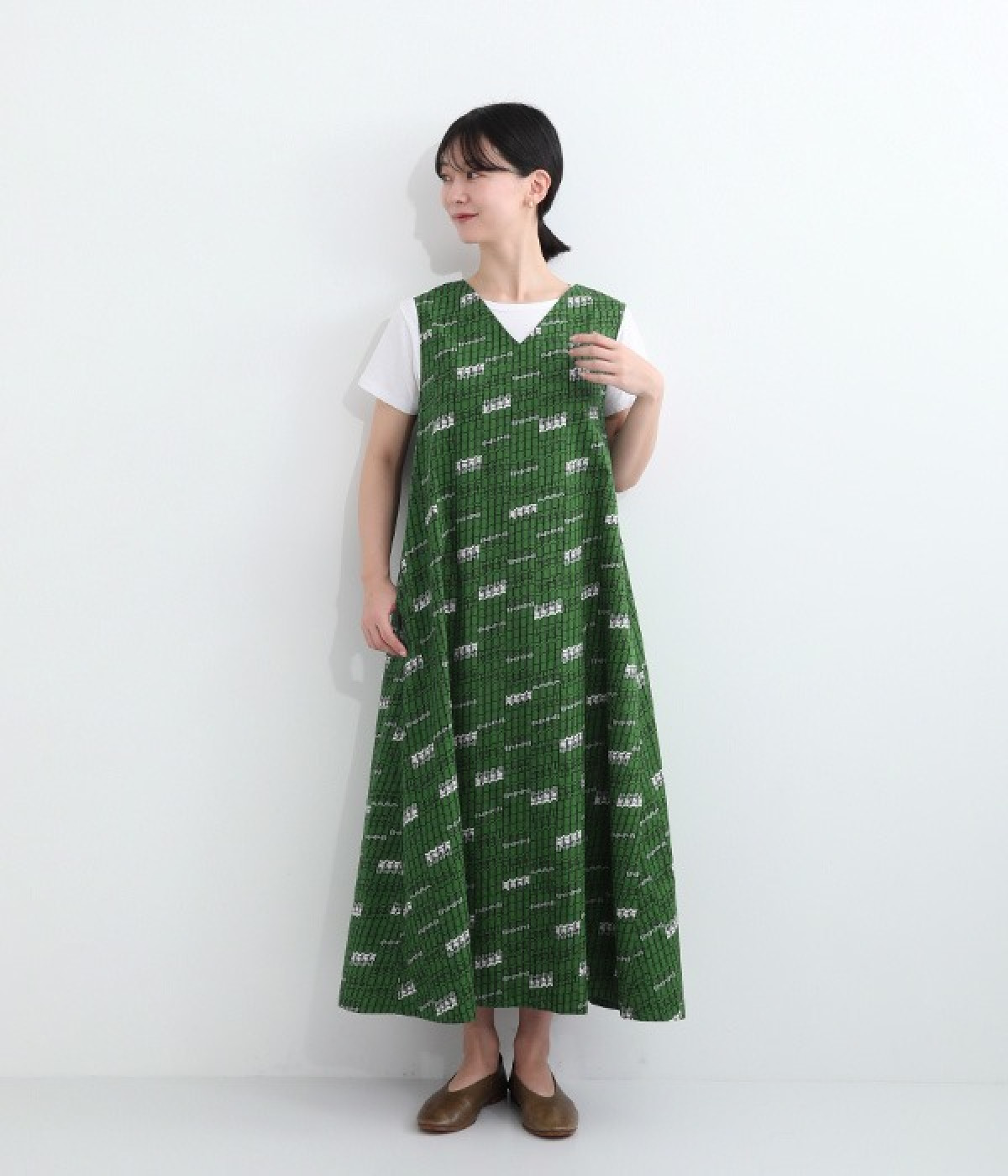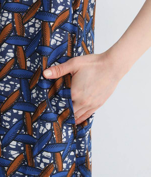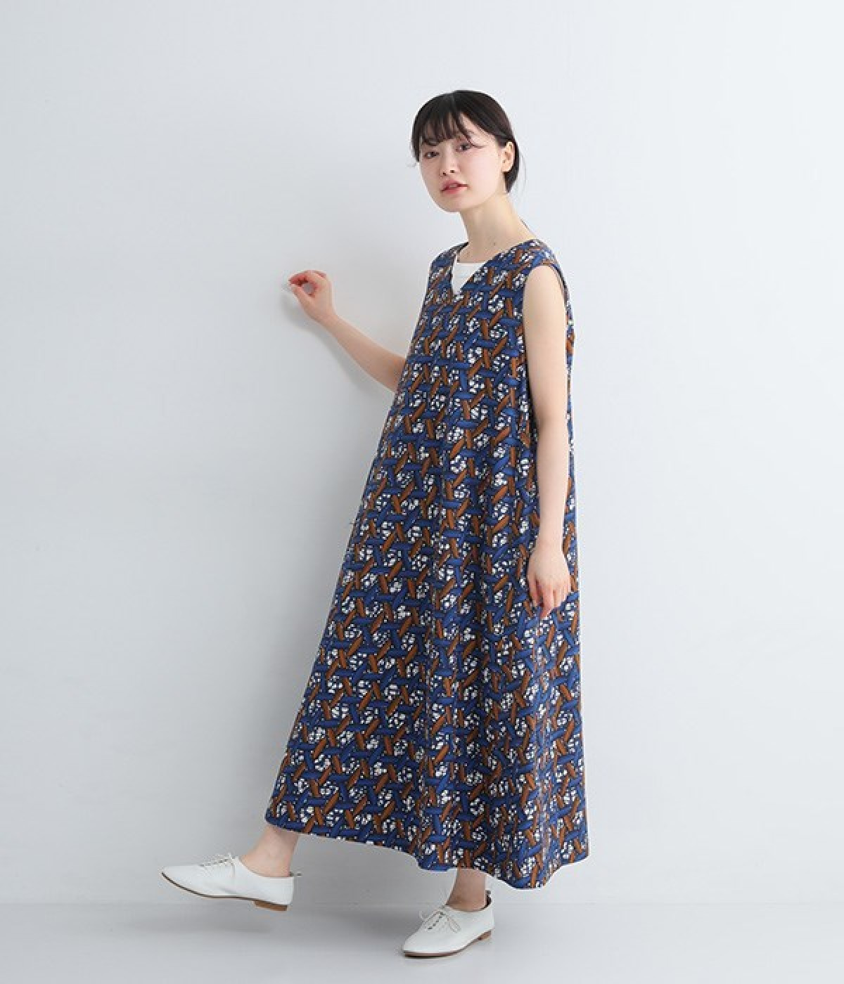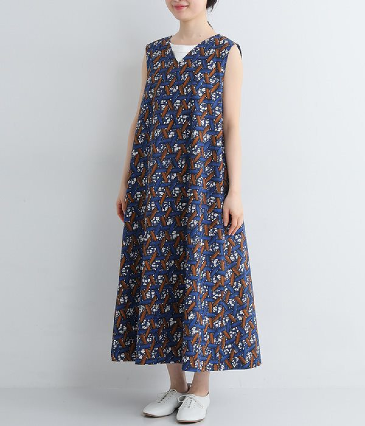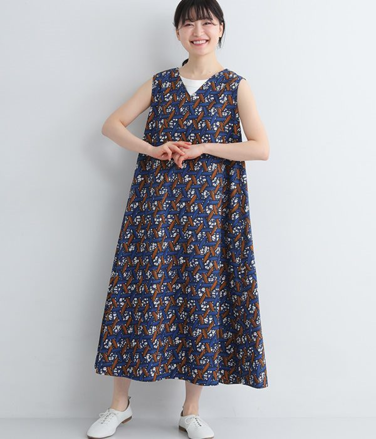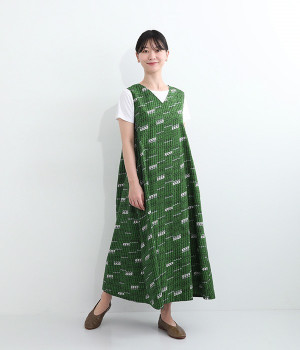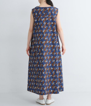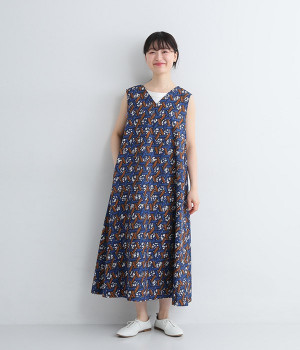 パッと目を惹く色使い&モチーフがインパクトたっぷりなプリントワンピース。適度にハリのあるコットン素材を使用し、きれいなフレアシルエットがくずれにくいのが特徴です。裏地レスでも透けにくく、インナーのラインが響きにくい生地も◎。デコルテをシャープに引き立てるVネックで、すっきり抜け感を出しています。薄地のカーディガンやパーカーともスタイリングしやすいノースリーブタイプです。