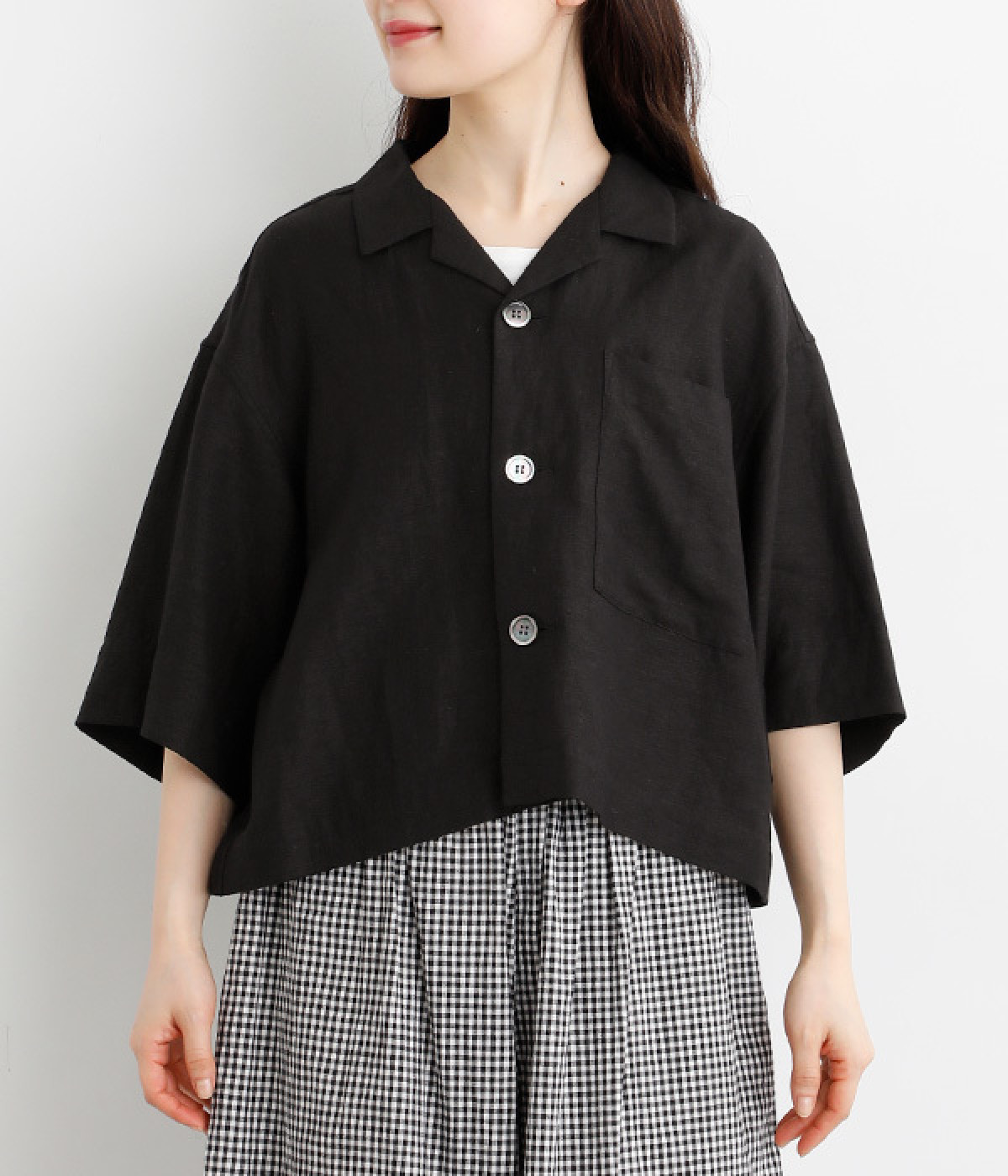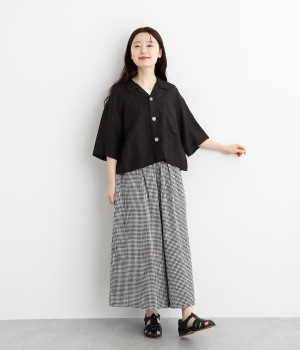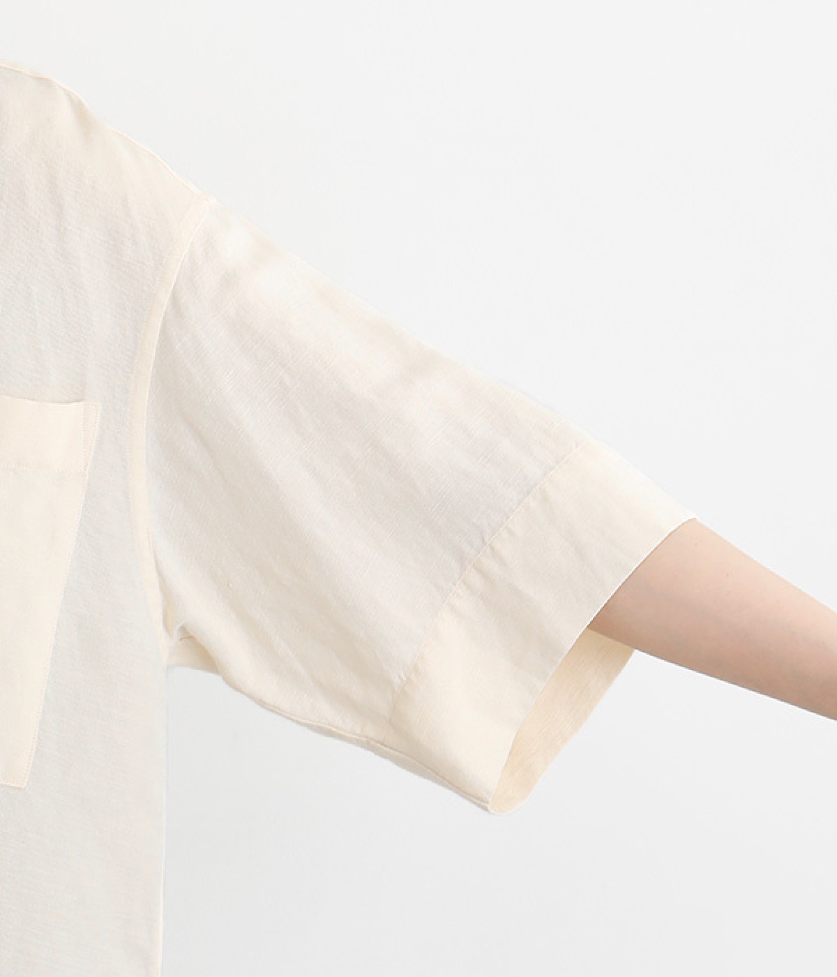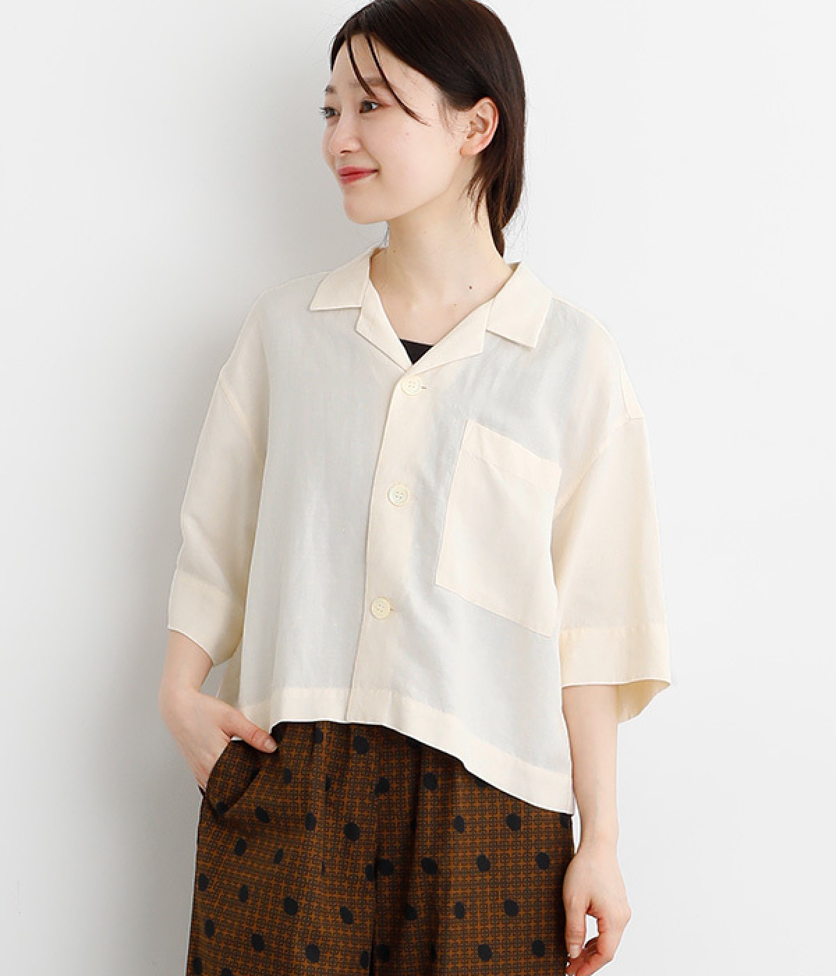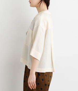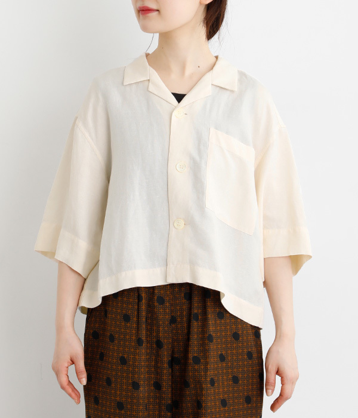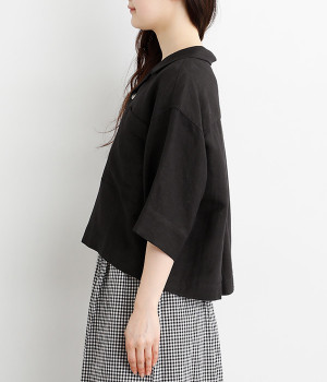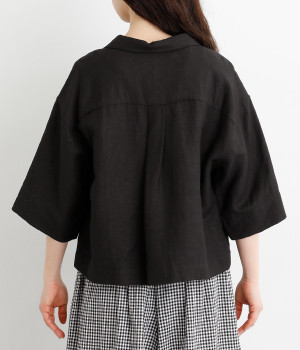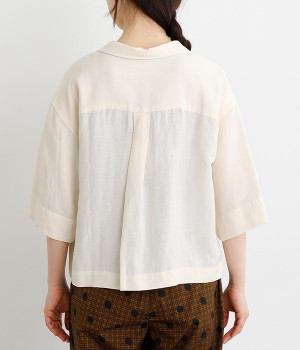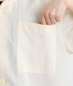 上半身がコンパクト見えする、軽やかなショート丈のシャツ。リネン特有のナチュラルな風合いと、レーヨンの滑らかな肌当たりを持った混紡素材を贅沢に使用しています。デコルテをシャープに見せる開襟デザインを取り入れ、インナーが自然にのぞいてレイヤードを印象的に。袖丈をやや長めに、胸ポケットを少し大きめにすることで、小さめの身頃がより引き立っています。バランスを整えるのがむずかしい、ワイドシルエットのボトムとの合わせも好適です。
