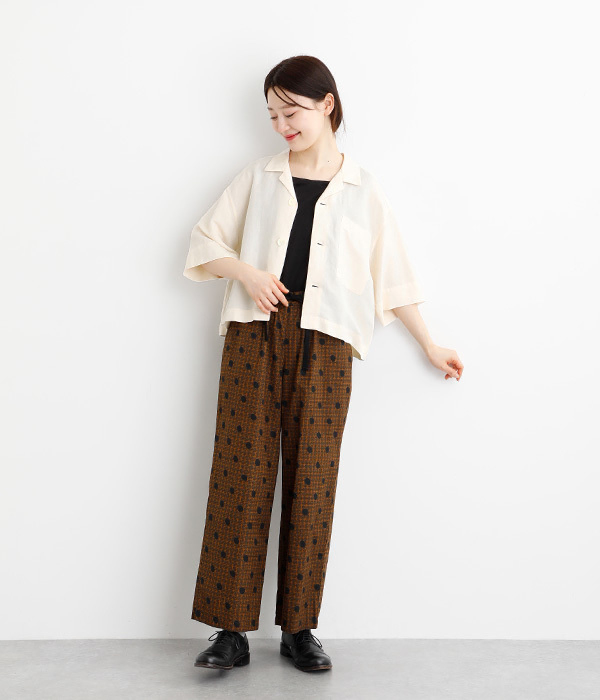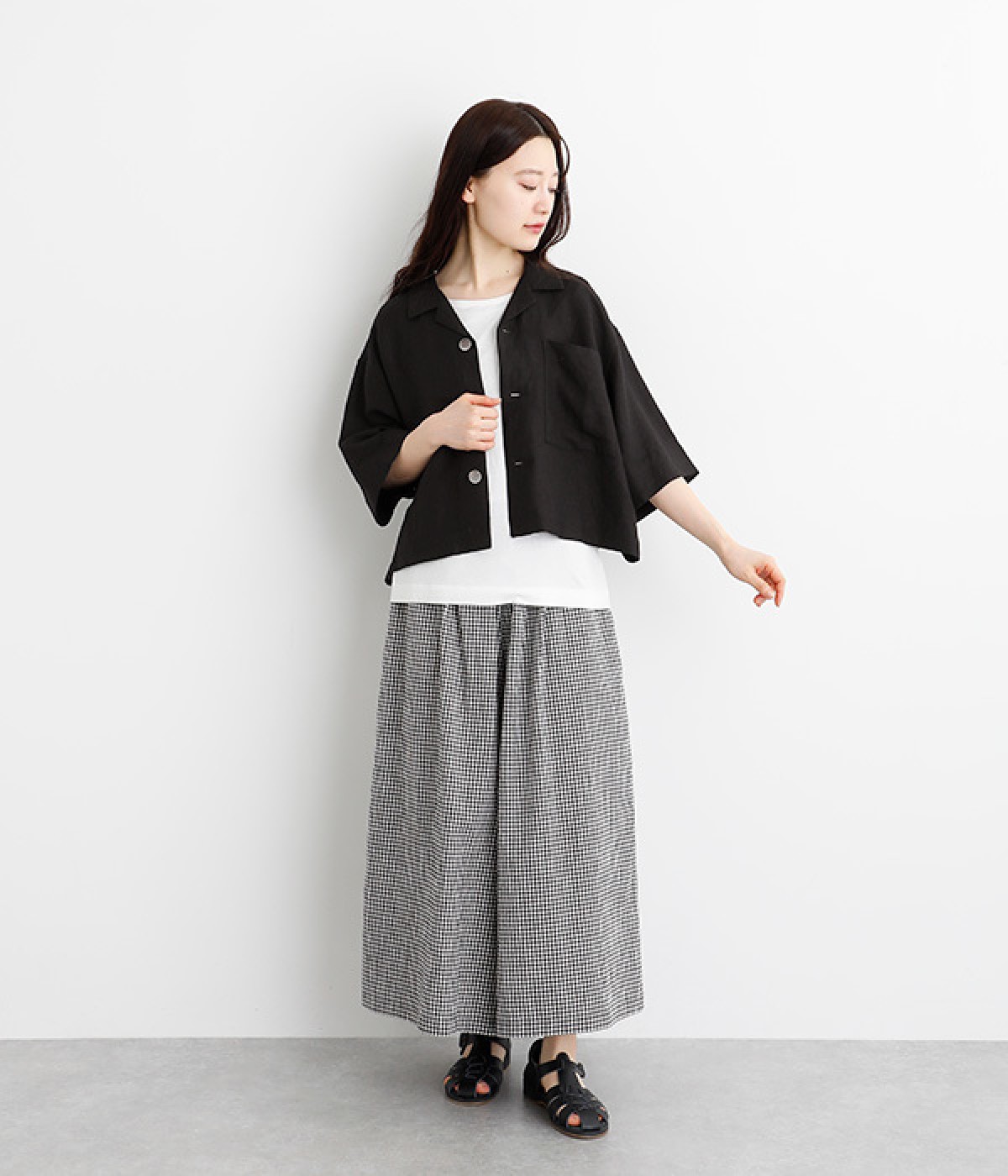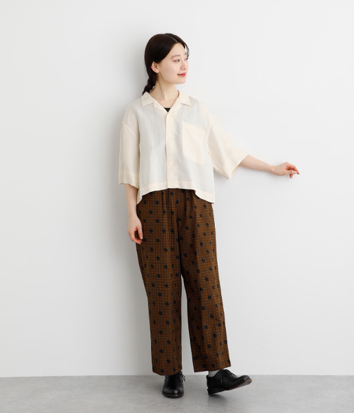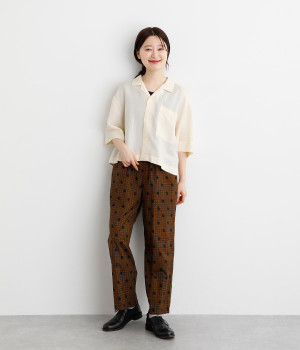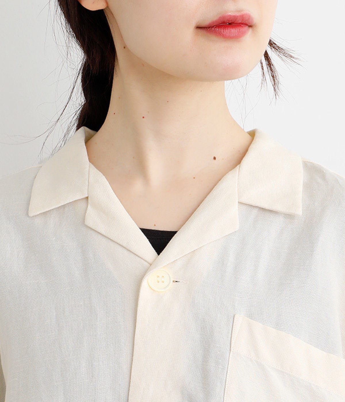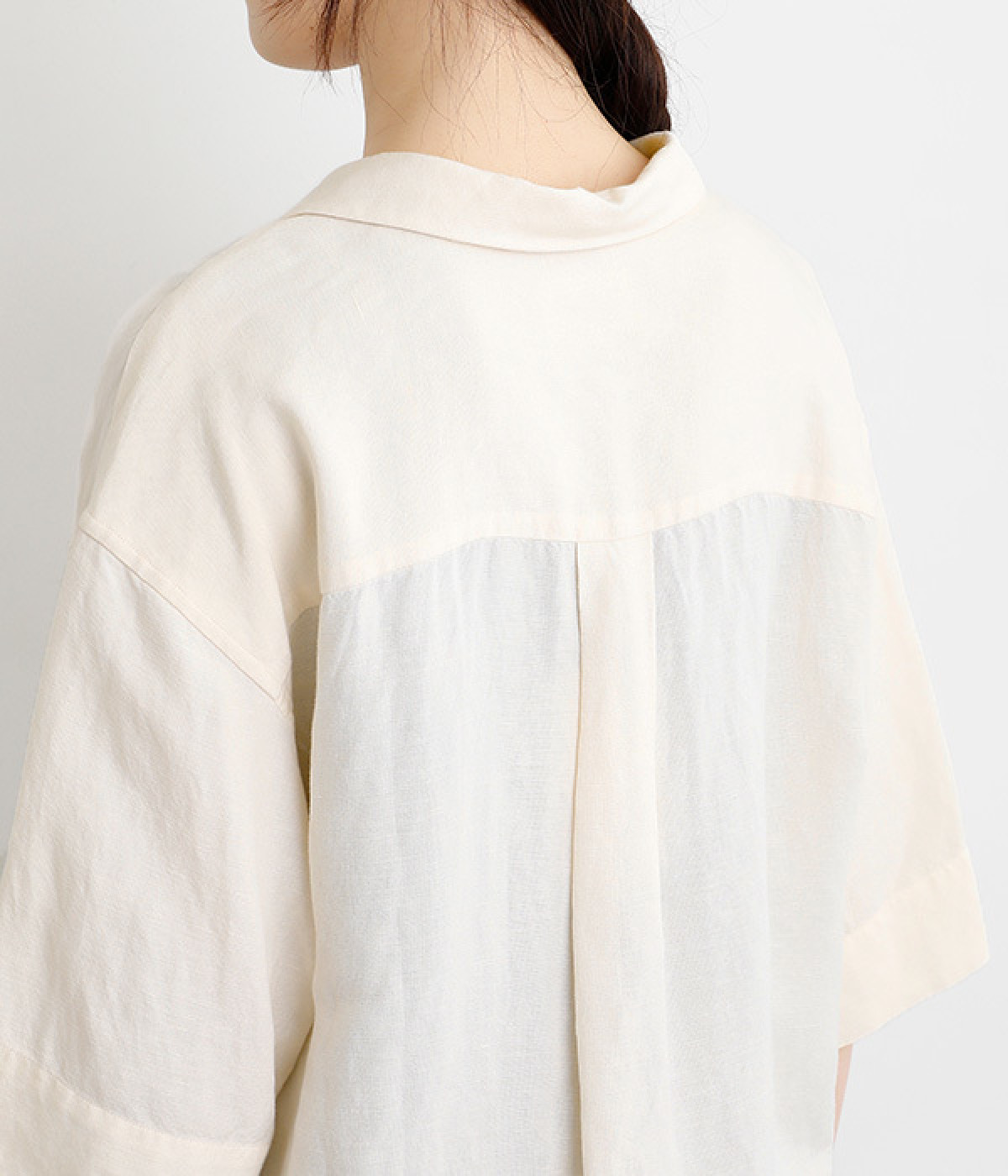 上半身がコンパクト見えする、軽やかなショート丈のシャツ。リネン特有のナチュラルな風合いと、レーヨンの滑らかな肌当たりを持った混紡素材を贅沢に使用しています。デコルテをシャープに見せる開襟デザインを取り入れ、インナーが自然にのぞいてレイヤードを印象的に。袖丈をやや長めに、胸ポケットを少し大きめにすることで、小さめの身頃がより引き立っています。バランスを整えるのがむずかしい、ワイドシルエットのボトムとの合わせも好適です。