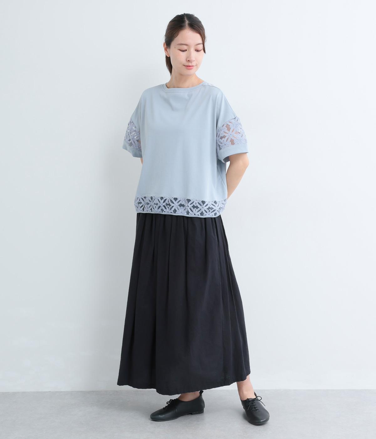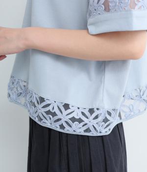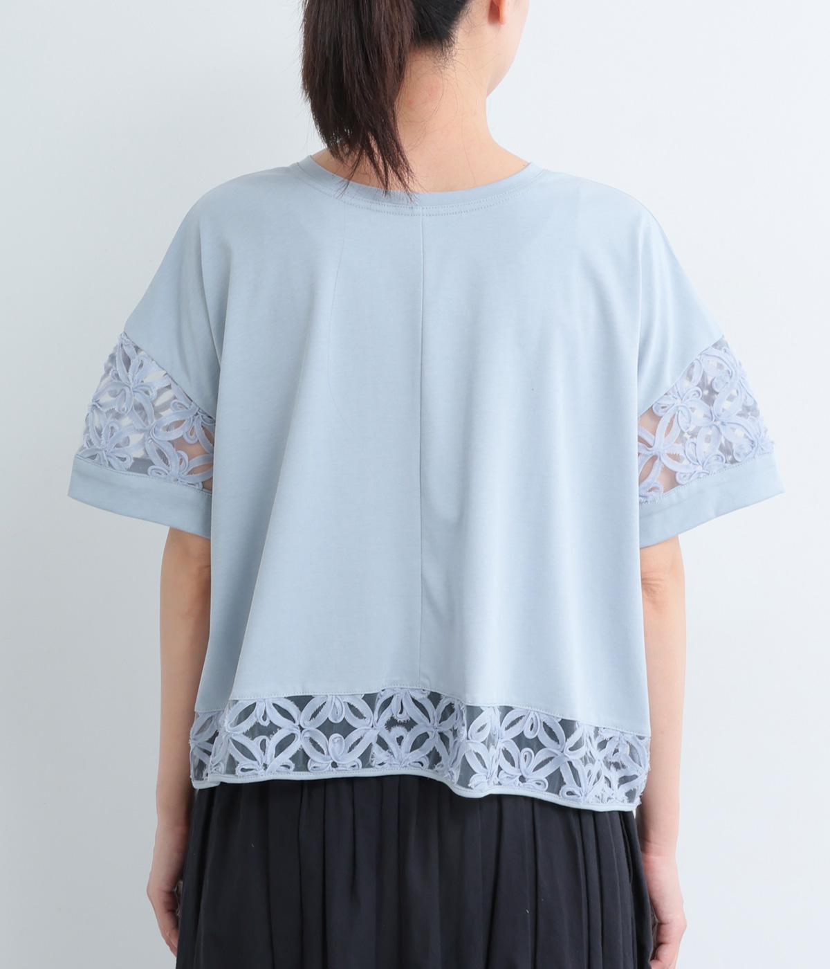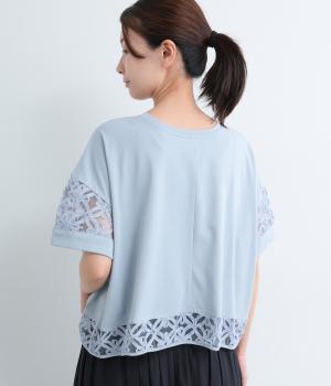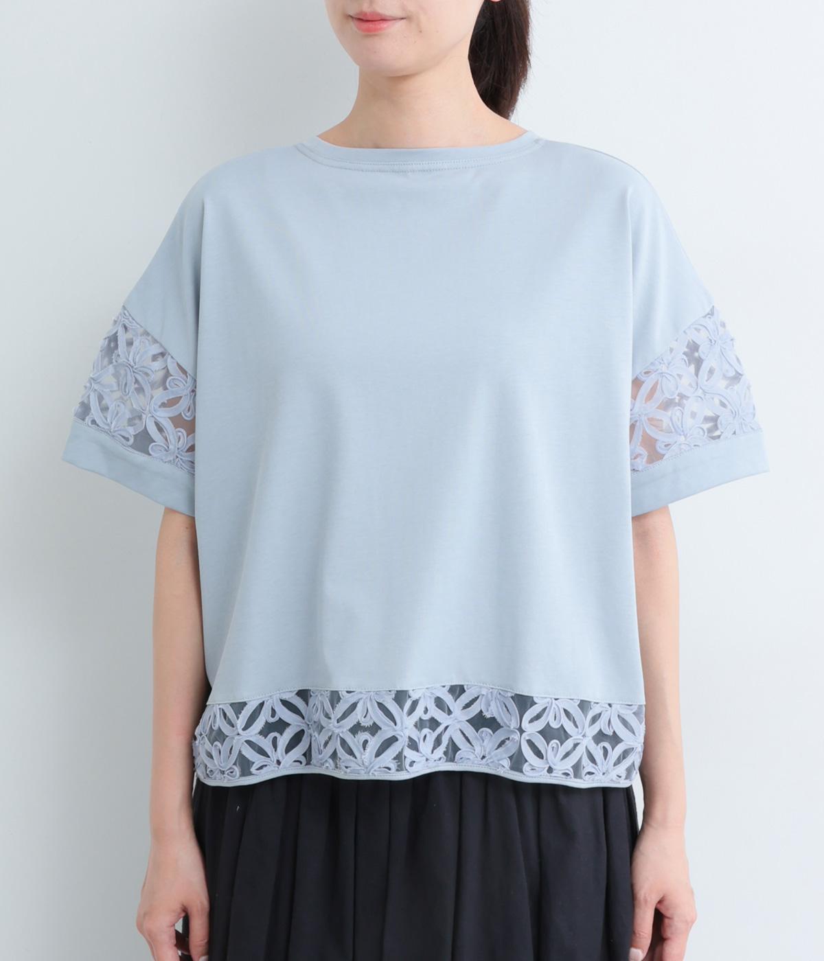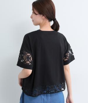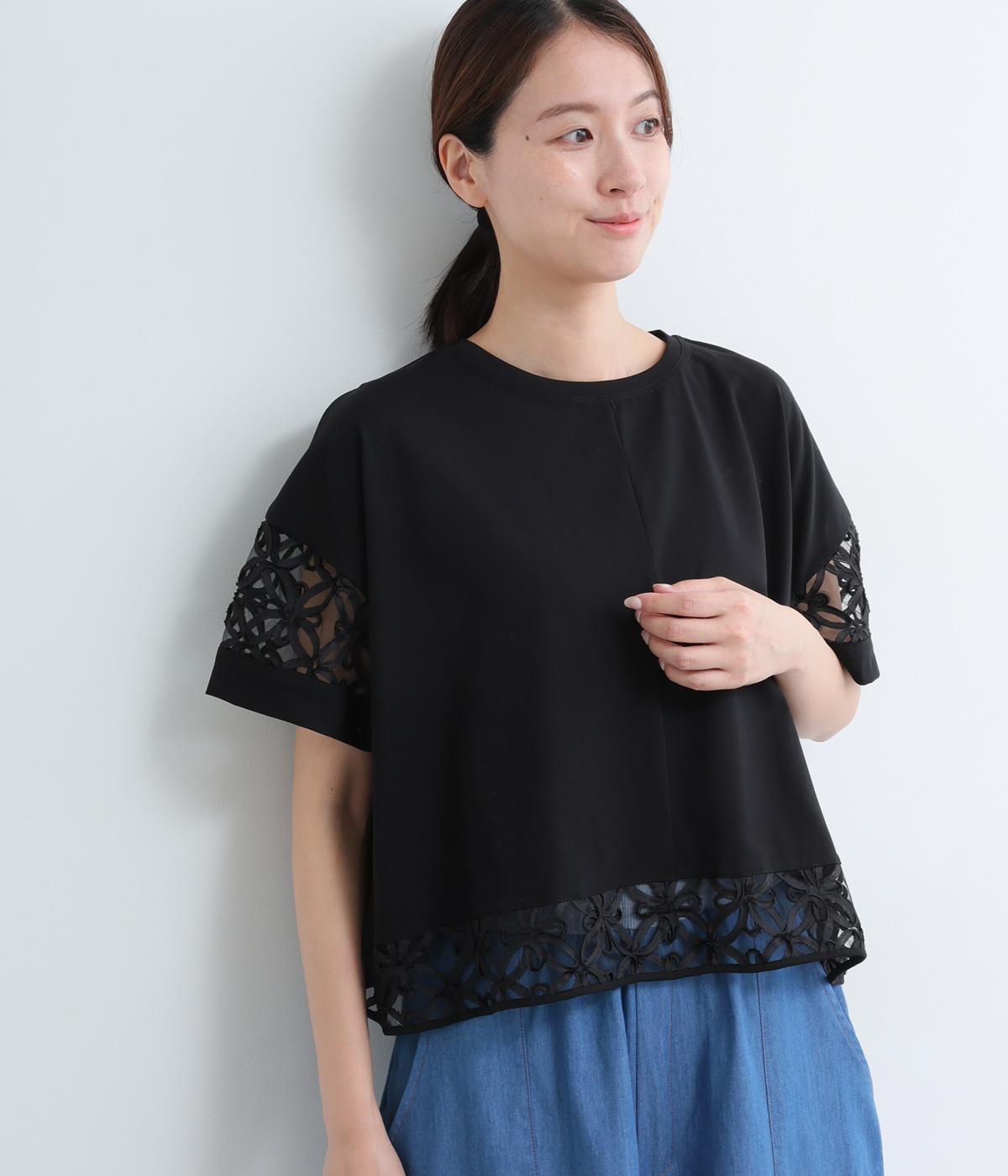 表面感のきれいなTシャツにコードレースを組み合わせて上品で華やかなアイテムにアップデート。ベーシックなボックス型で着こなしやすく、シアーなレース部分が奥行きと適度な抜け感を与えます。ふだん使いにもお呼ばれスタイルにも活躍。