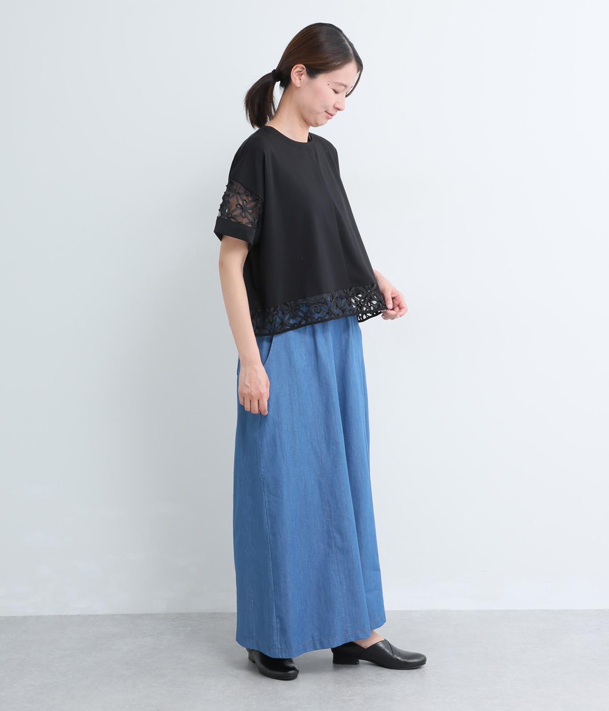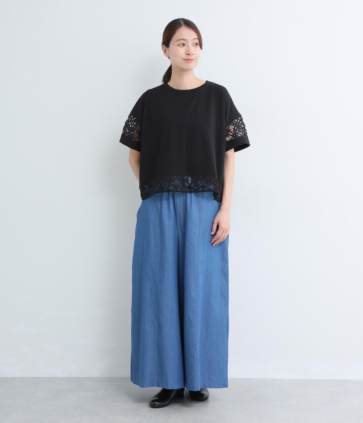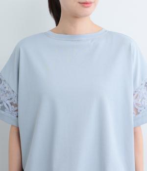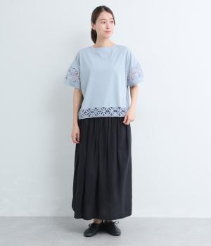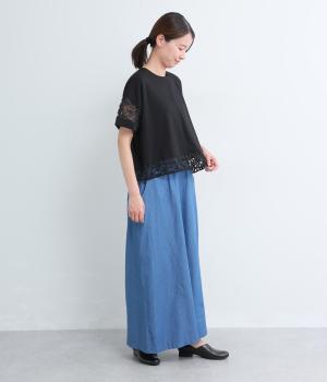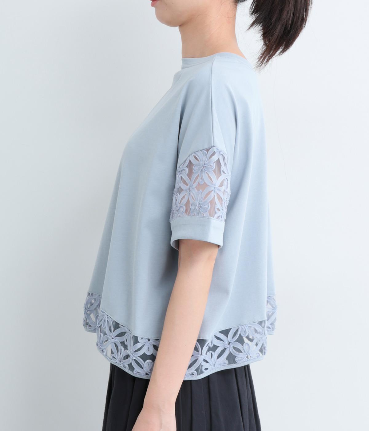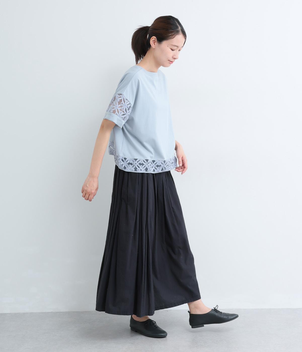 表面感のきれいなTシャツにコードレースを組み合わせて上品で華やかなアイテムにアップデート。ベーシックなボックス型で着こなしやすく、シアーなレース部分が奥行きと適度な抜け感を与えます。ふだん使いにもお呼ばれスタイルにも活躍。
