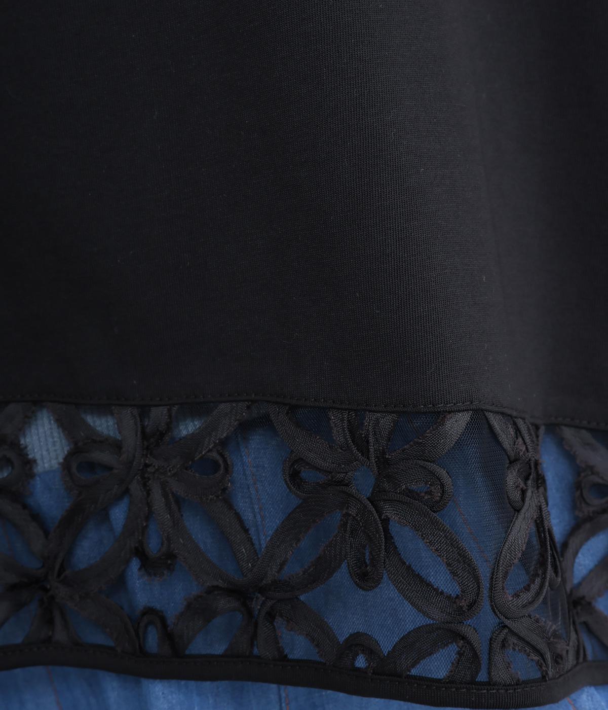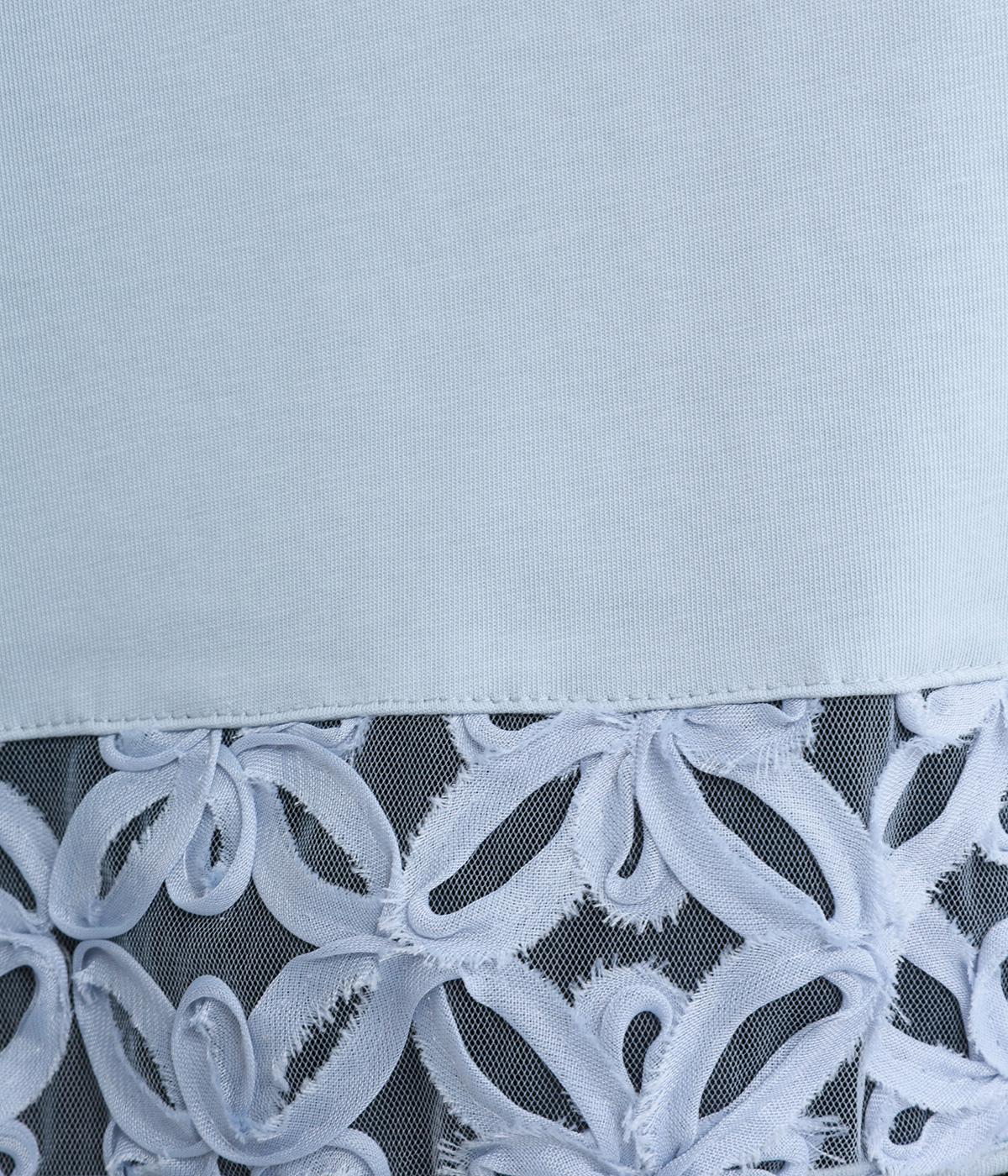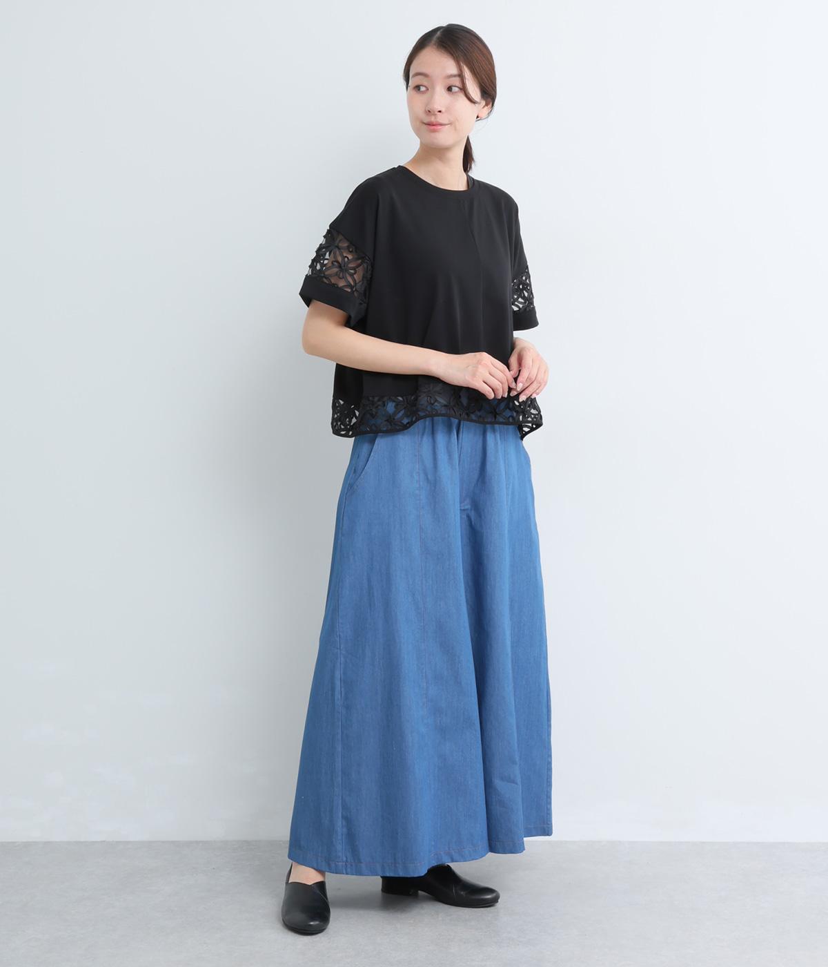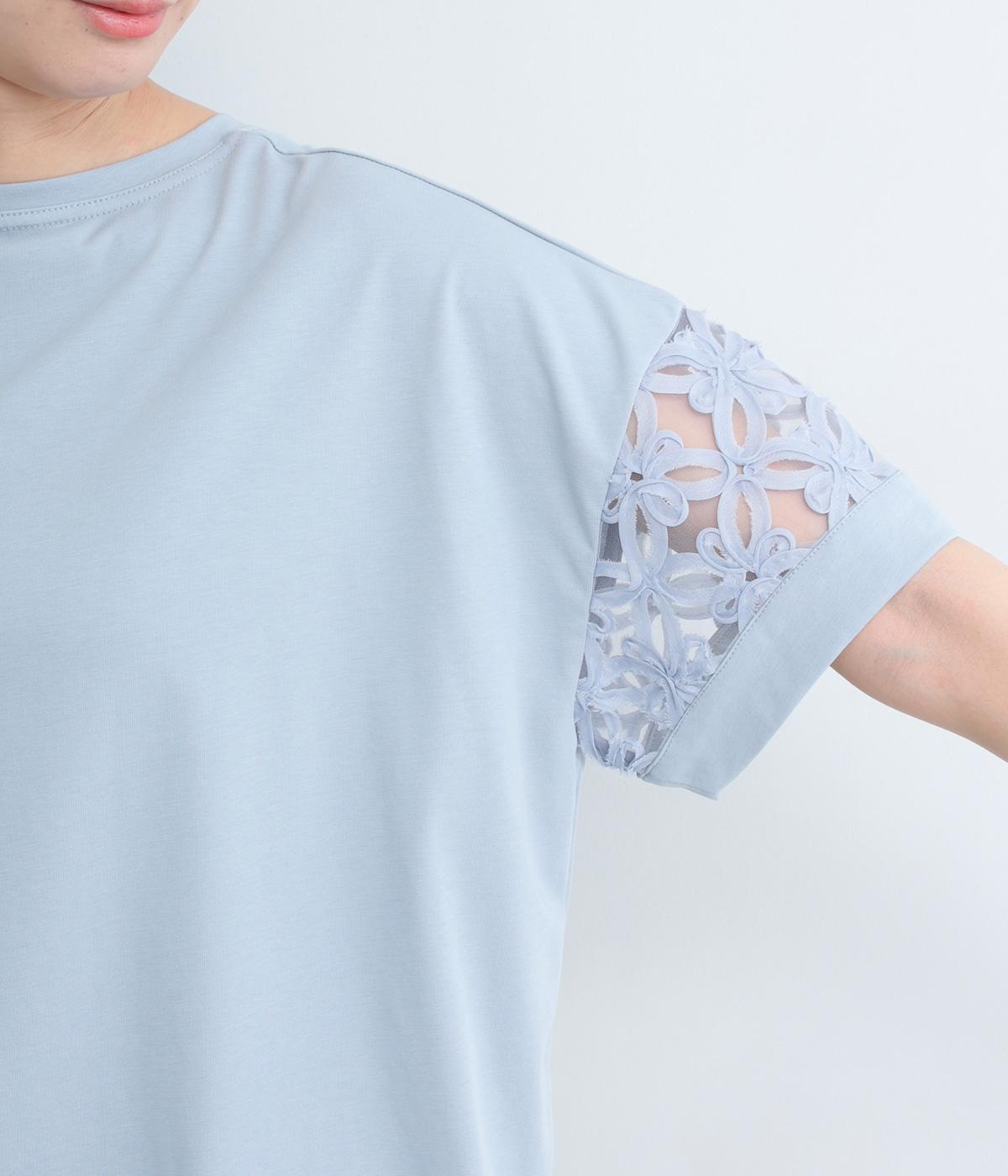 表面感のきれいなTシャツにコードレースを組み合わせて上品で華やかなアイテムにアップデート。ベーシックなボックス型で着こなしやすく、シアーなレース部分が奥行きと適度な抜け感を与えます。ふだん使いにもお呼ばれスタイルにも活躍。