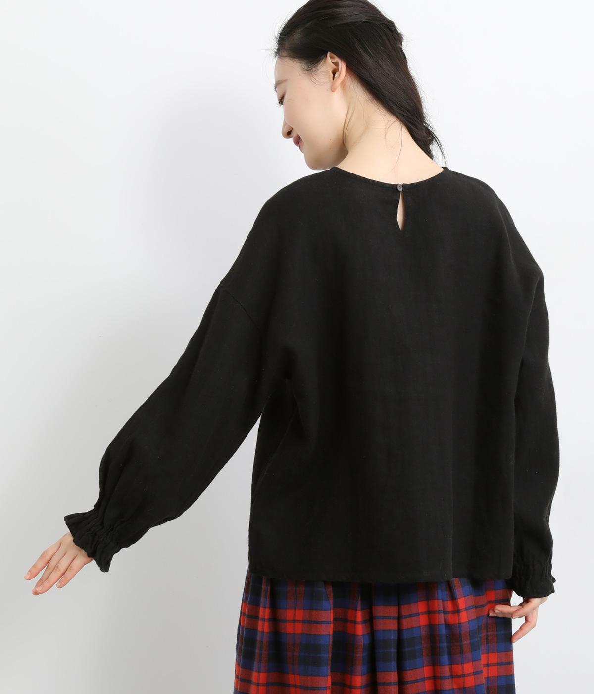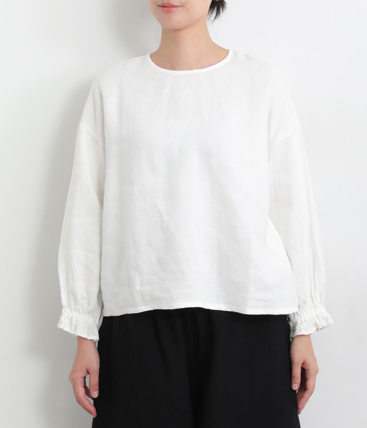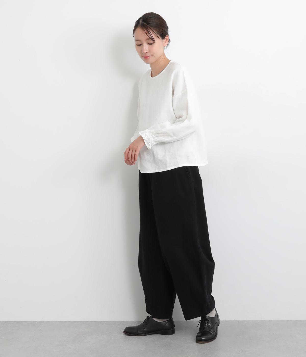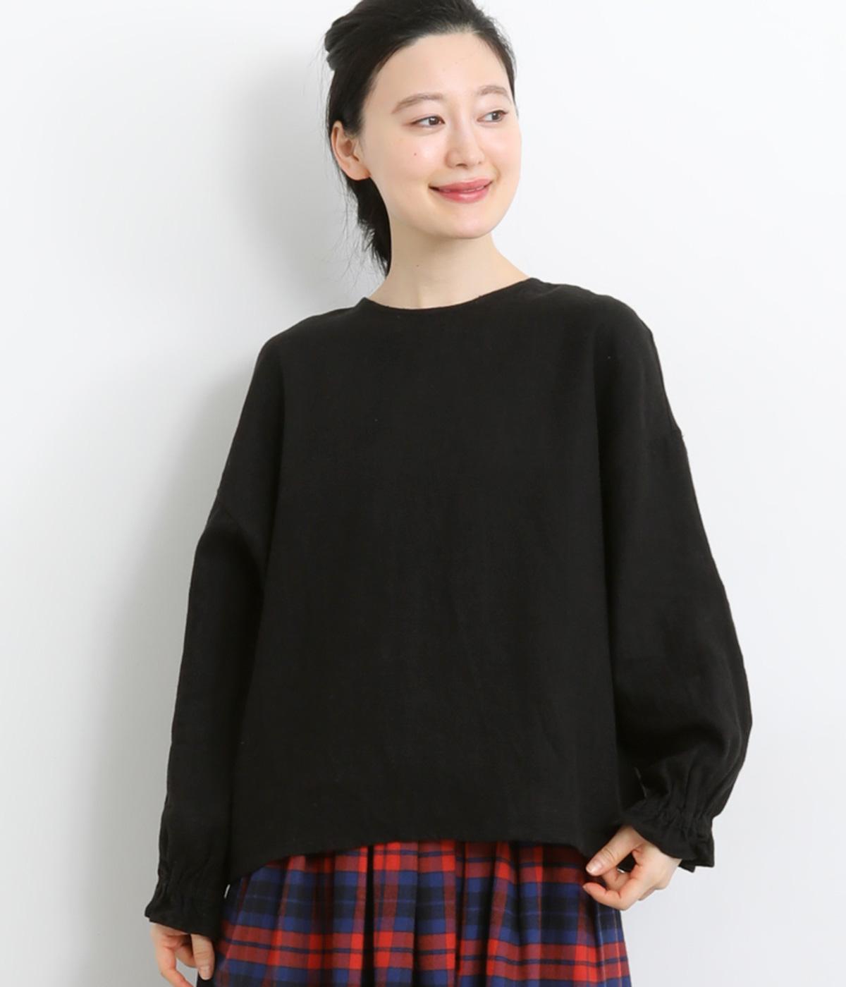 ほんのり起毛した表面感やゴムシャーリングのフリル袖がやさしい印象を与える一枚。ラウンドネックのレギュラーシルエットで着こなしやすく、ベストなどとのレイヤードスタイルにも重宝します。後ろ涙あきで頭の通りもスムーズです。