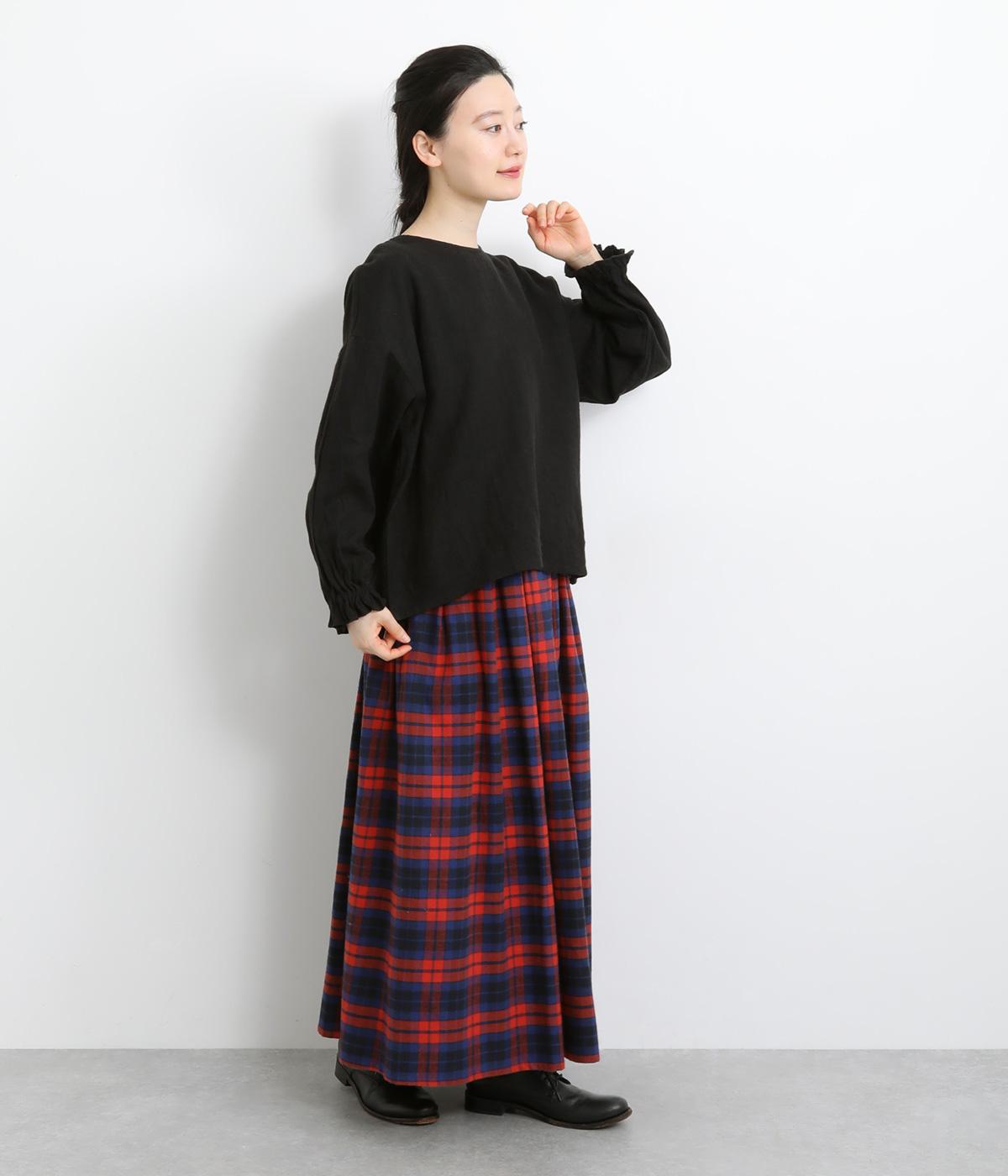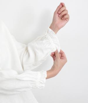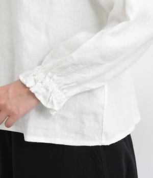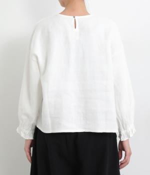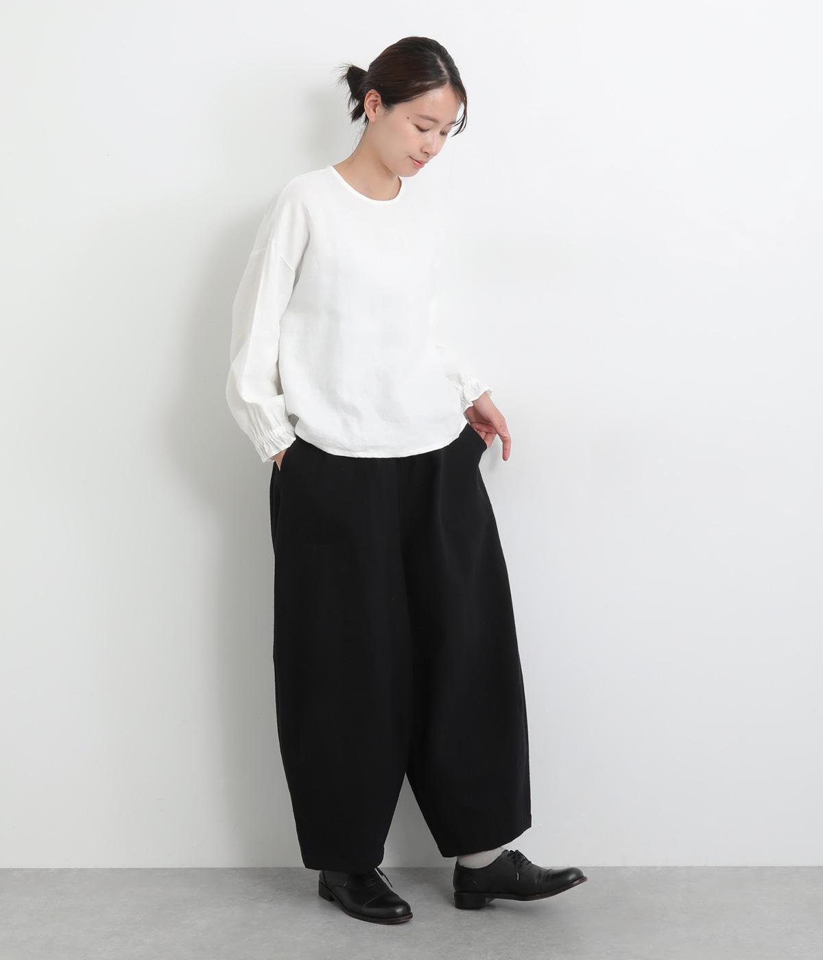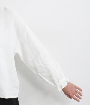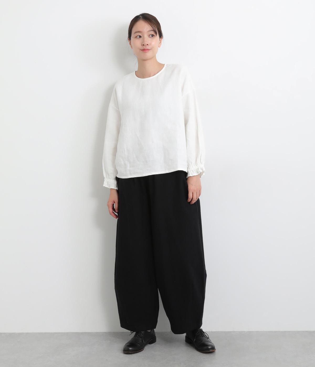 ほんのり起毛した表面感やゴムシャーリングのフリル袖がやさしい印象を与える一枚。ラウンドネックのレギュラーシルエットで着こなしやすく、ベストなどとのレイヤードスタイルにも重宝します。後ろ涙あきで頭の通りもスムーズです。