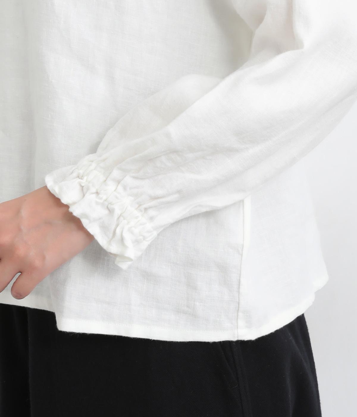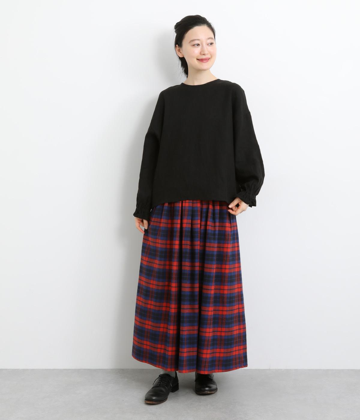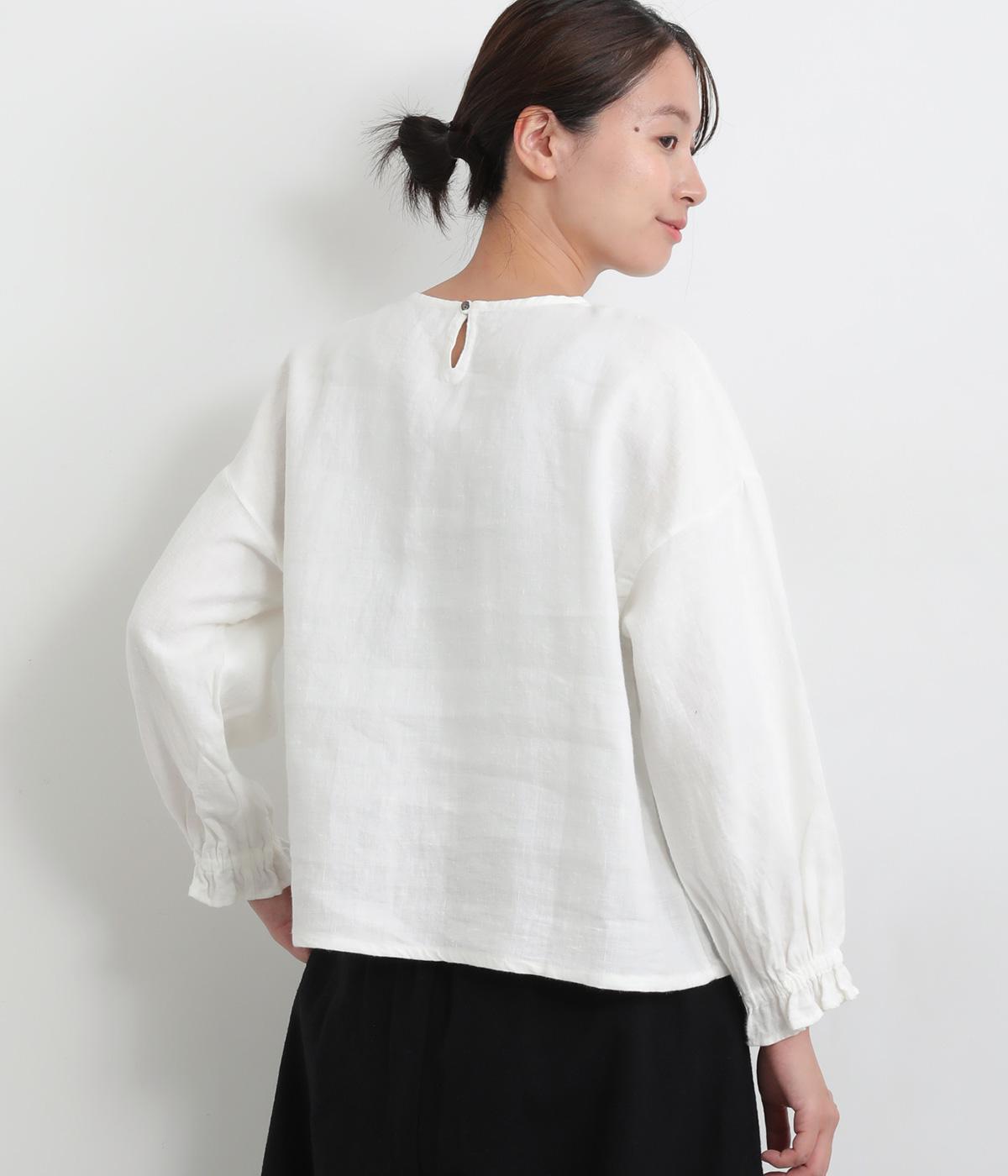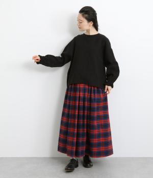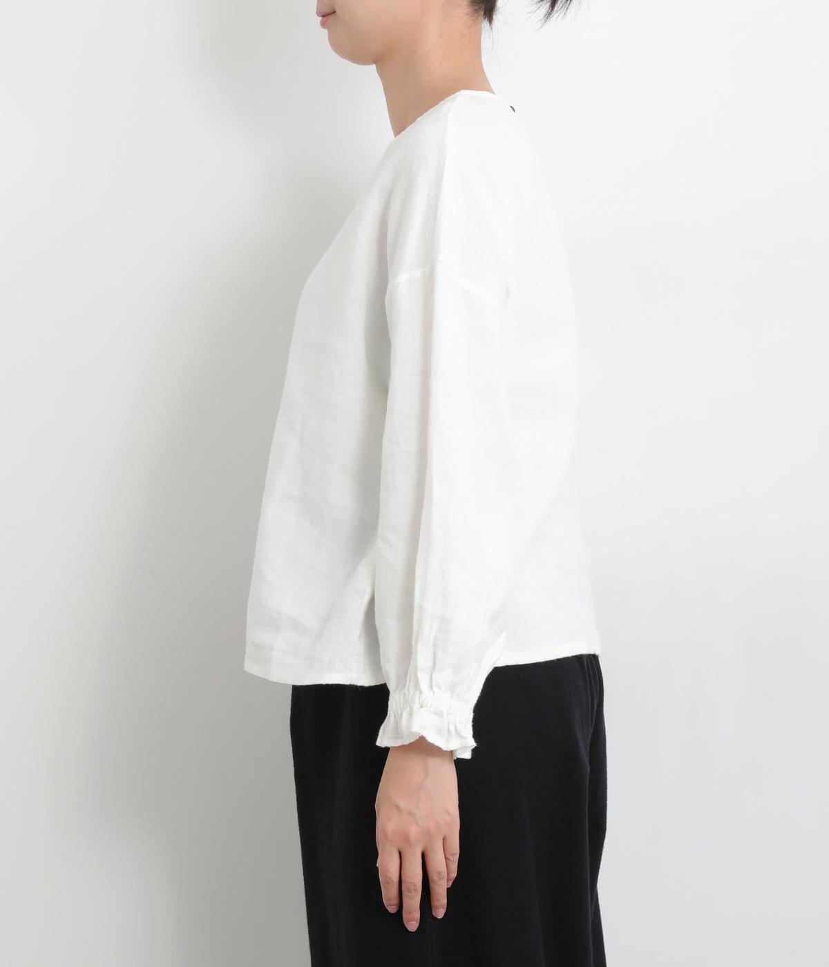 ほんのり起毛した表面感やゴムシャーリングのフリル袖がやさしい印象を与える一枚。ラウンドネックのレギュラーシルエットで着こなしやすく、ベストなどとのレイヤードスタイルにも重宝します。後ろ涙あきで頭の通りもスムーズです。