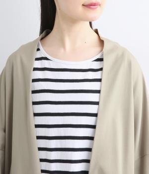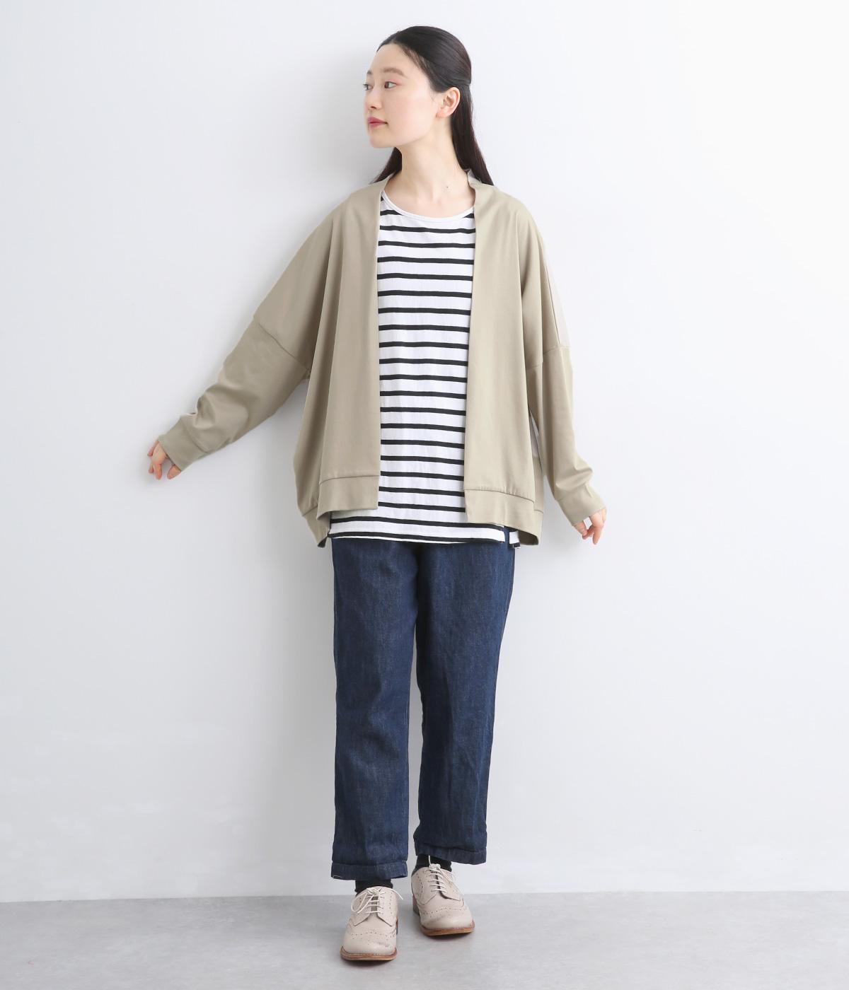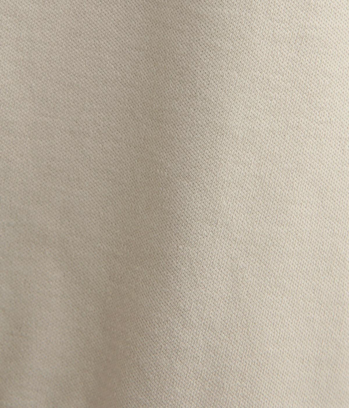 肌ざわりのよいコットン天竺生地にシルケット加工をほどこしました。つるつるとした滑らかさと上品な光沢が特徴です。デイリーからきれいめまで万能な素材感です。
