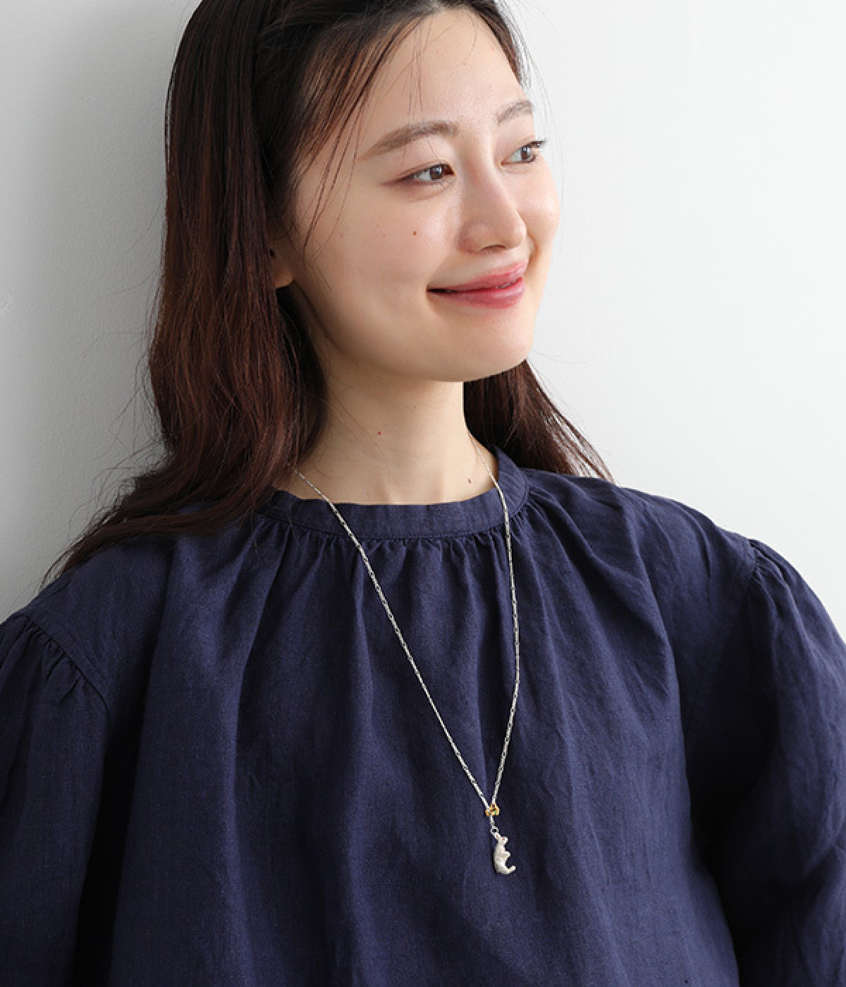 留め具がないラリエットタイプで、頭から被って好みの長さに調節可能