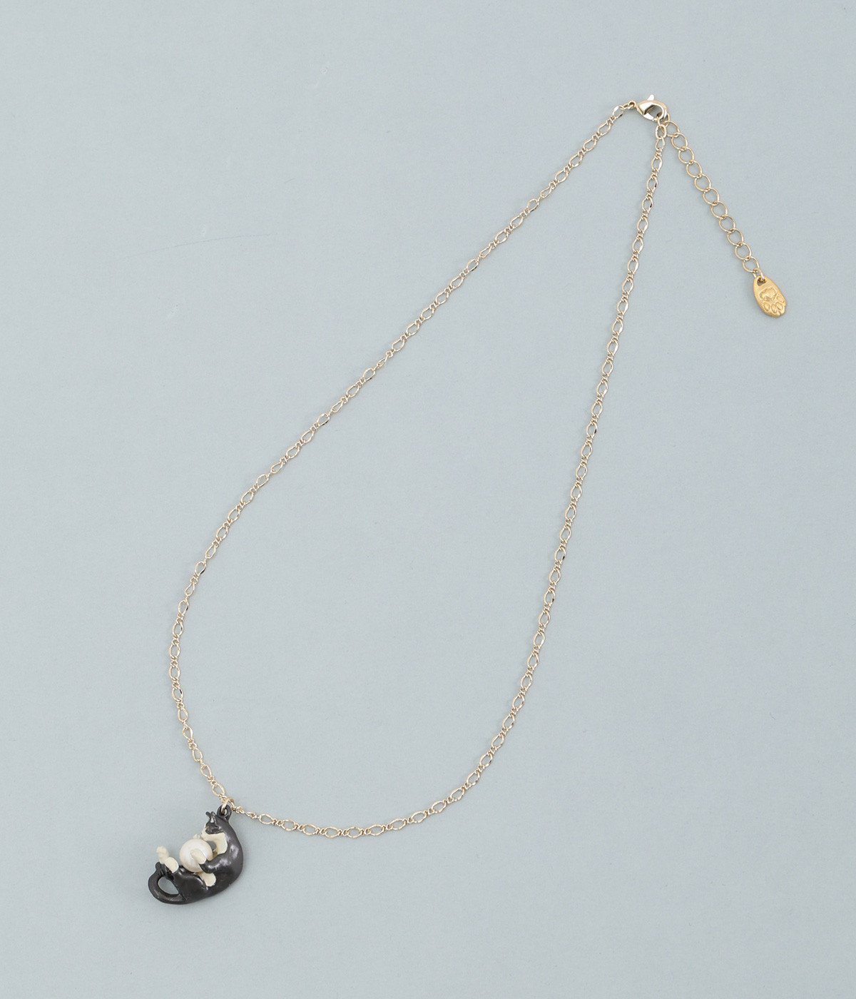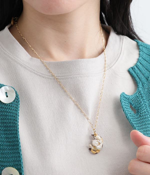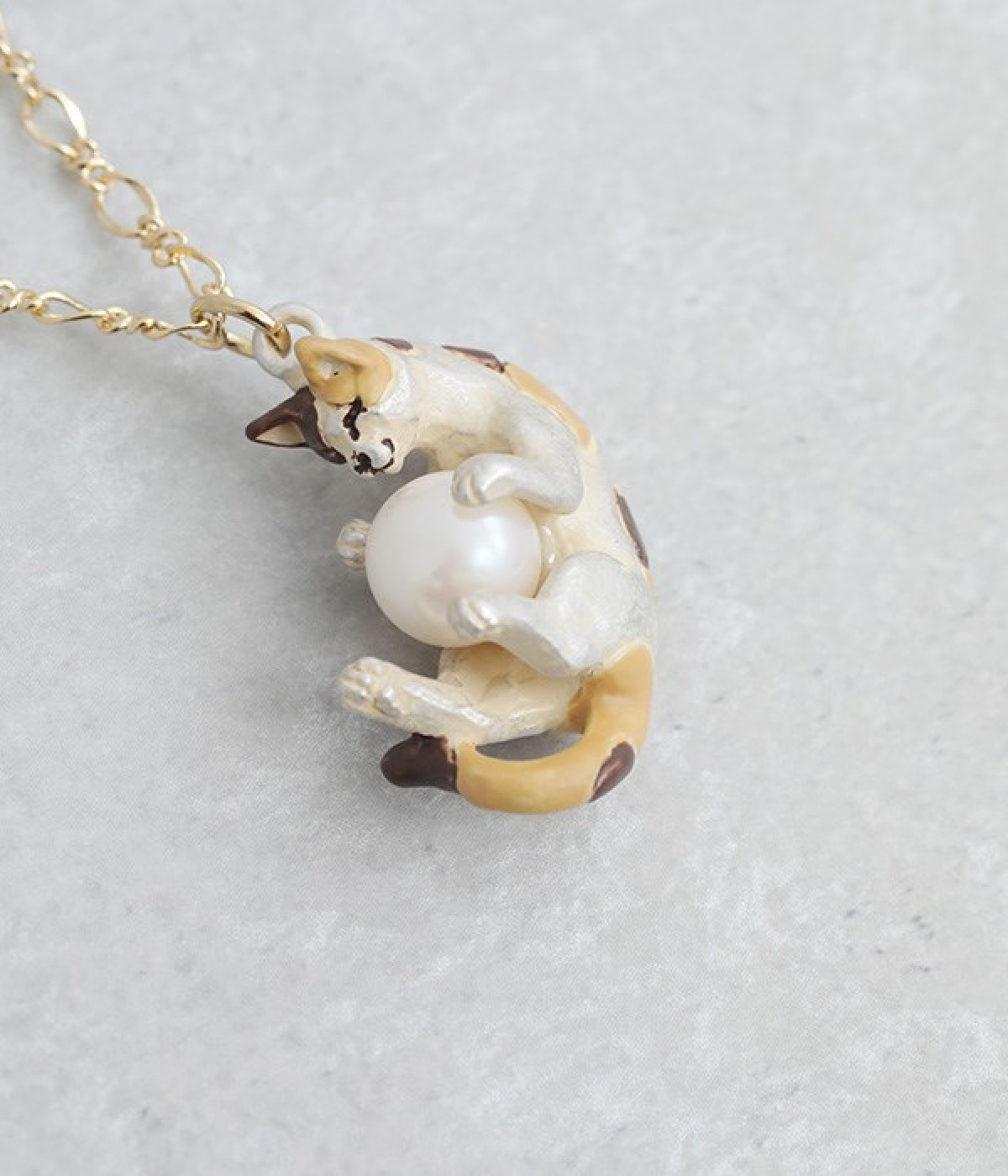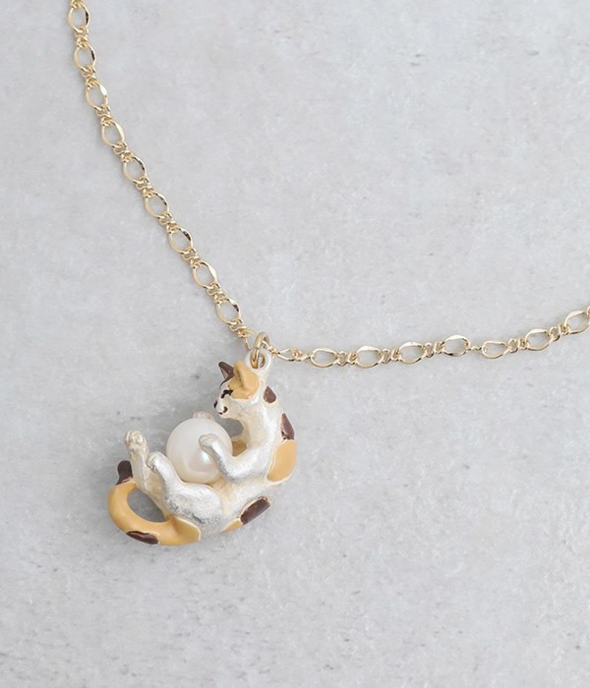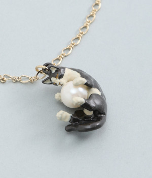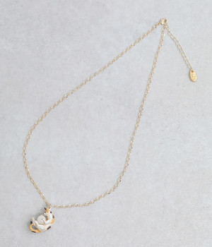 すやすやと眠りにつく三毛猫のミケをチャームとして落とし込んだ愛らしいネックレスです。毛糸玉で元気いっぱい遊んでいるうちにいつの間にか眠ってしまった様子を表現しました。毛糸玉に見立てたパールをしっかりと大事に抱えて眠る姿がかわいらしく、コーディネートにほっこりとしたニュアンスを添えてくれる一品。アジャスターチェーンなので、長さの調節が可能です。