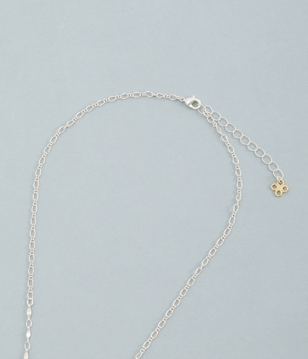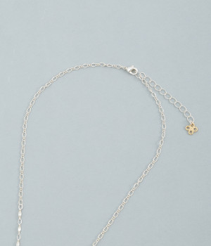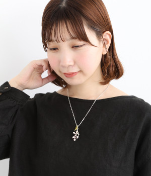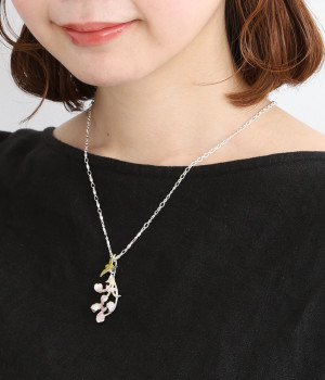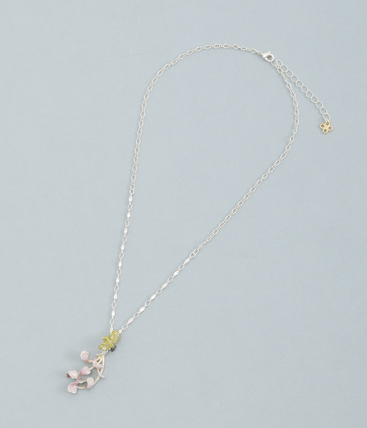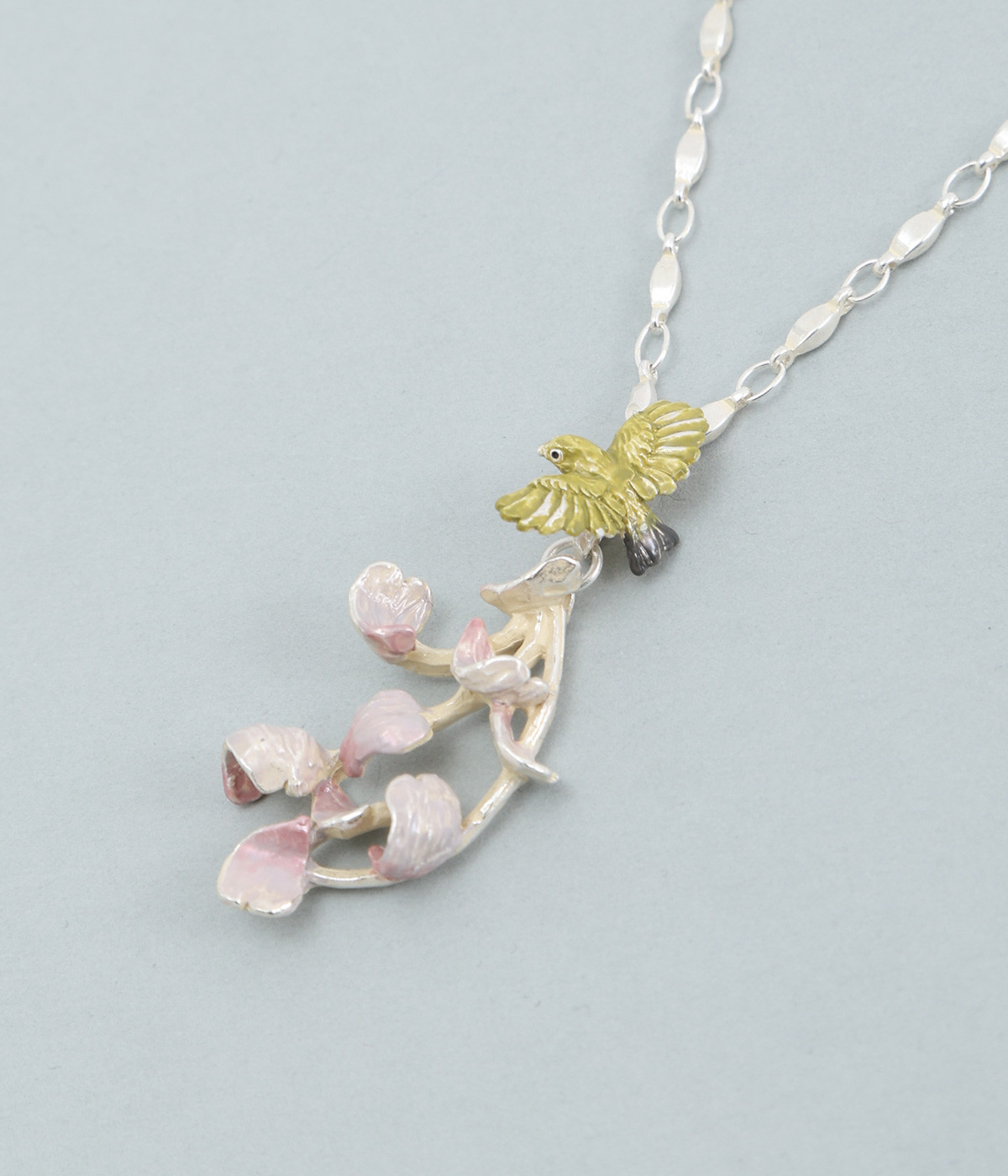 花曇りのなか、風に吹かれて舞い上がる桜の花びらとメジロをモチーフにしたネックレス。躍動感あふれる美しい曲線を描き、胸元にさりげないアクセントを加えます。